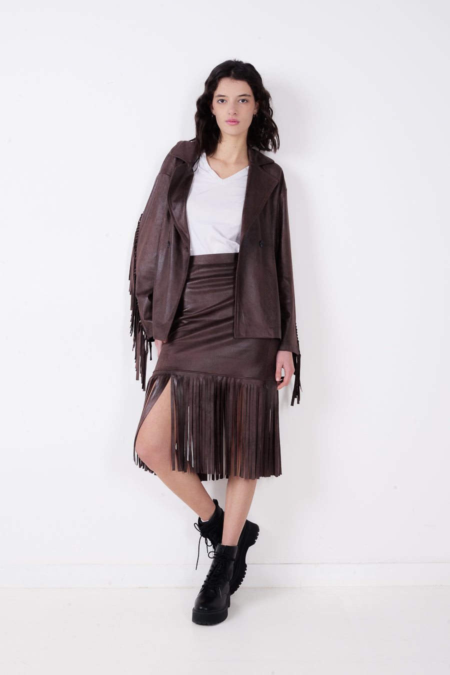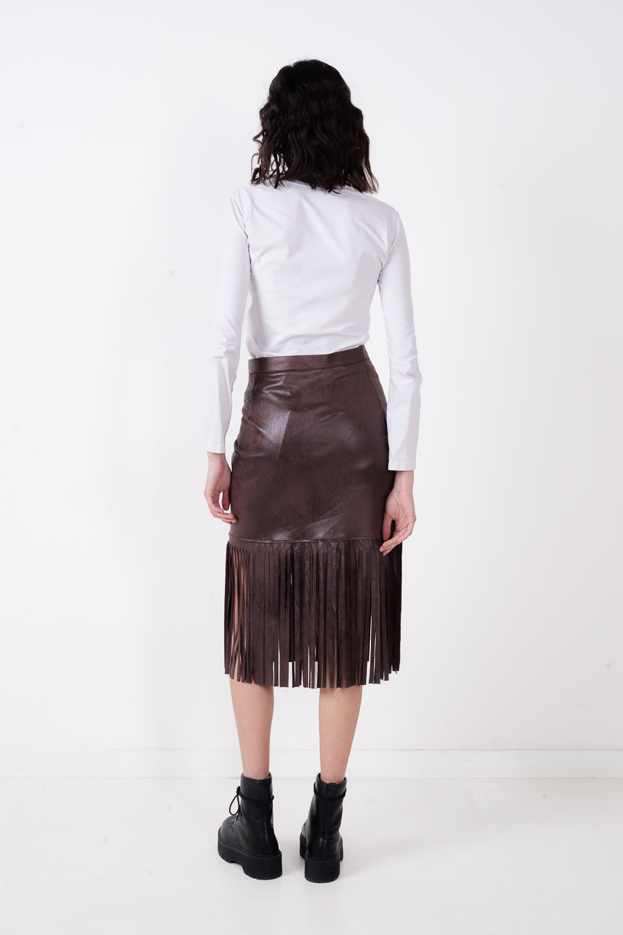 Vendita all'ingrosso di gonna midi in ecopelle con orlo a frange