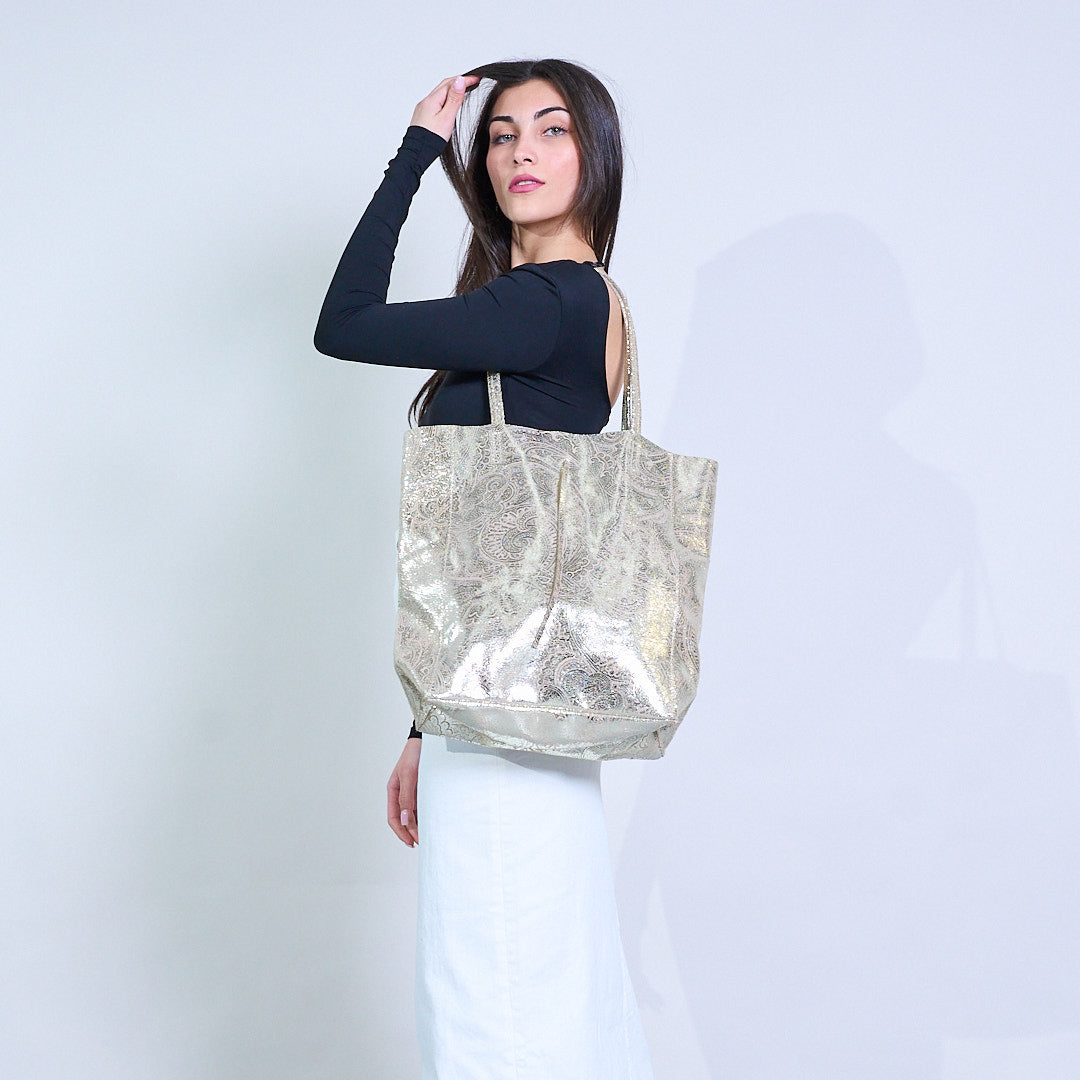 - Pelle premium con intricata goffratura barocca paisley e finitura metallica luminosa