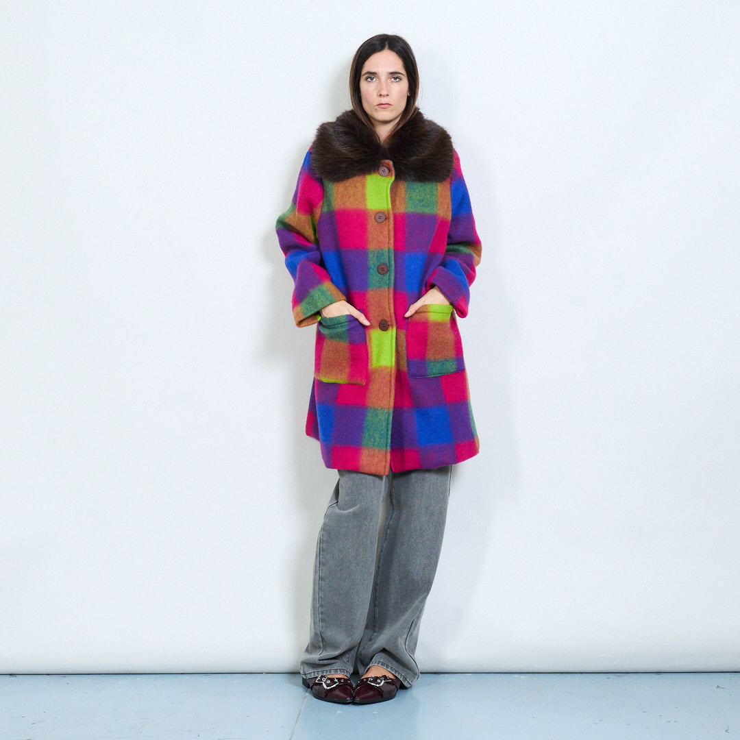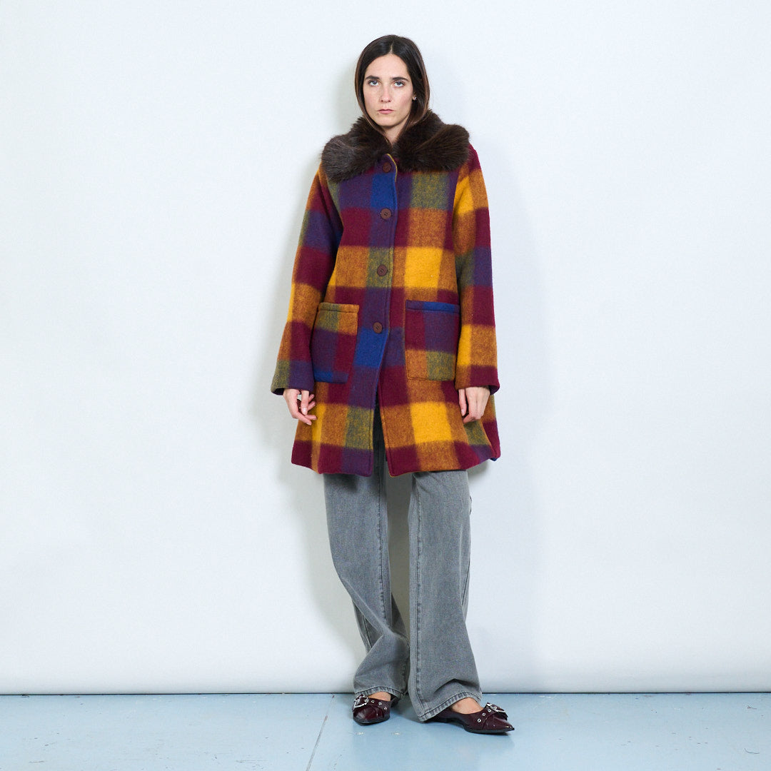 Cappotto di lana a scacchi con colletto in finto pelliccia e bottone all'ingrosso