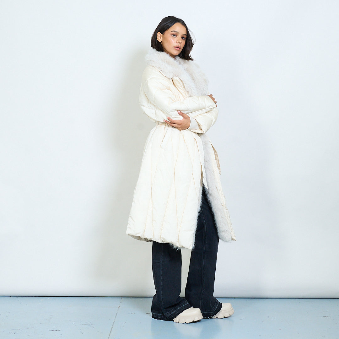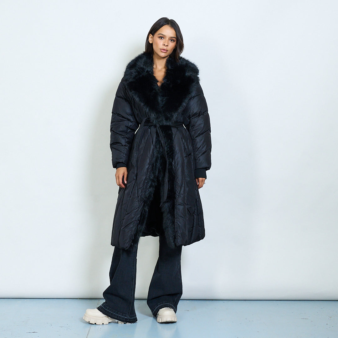 Cappotto imbottito lungo con cintura con rivestimento in finto pelliccia all'ingrosso