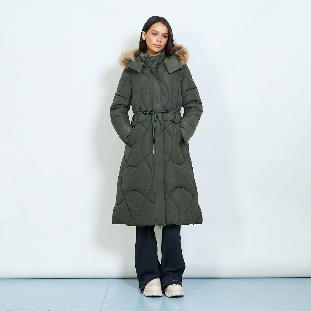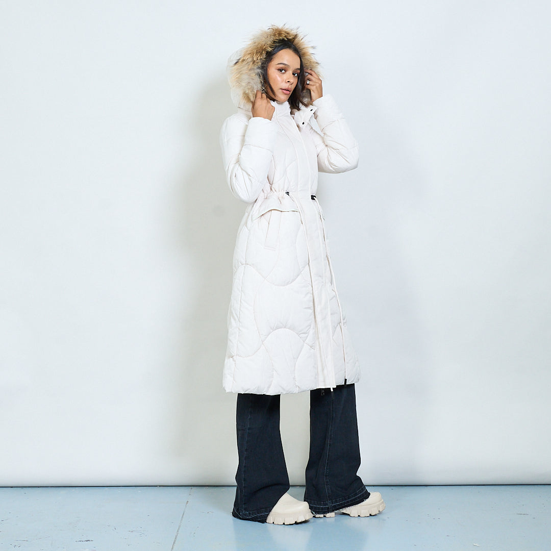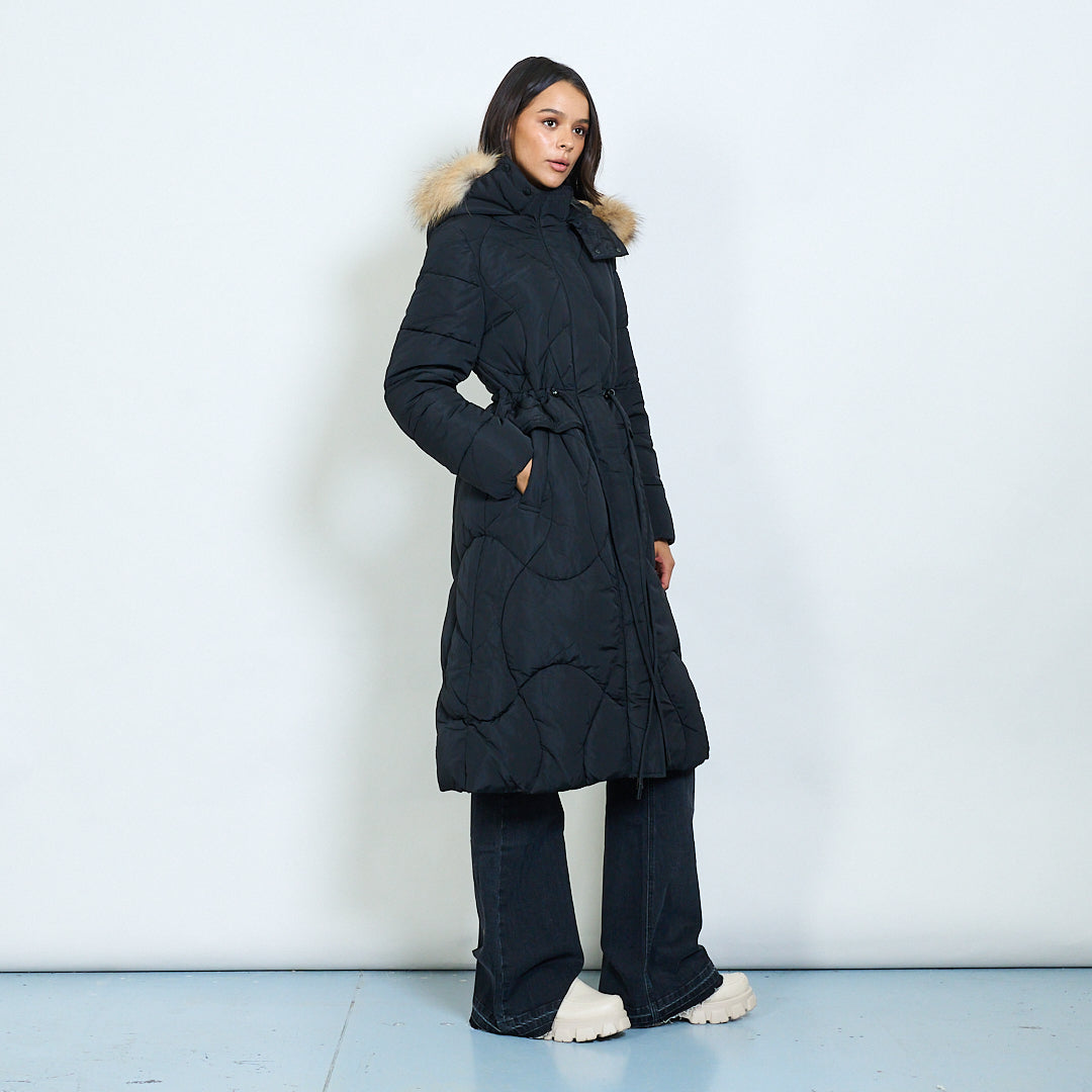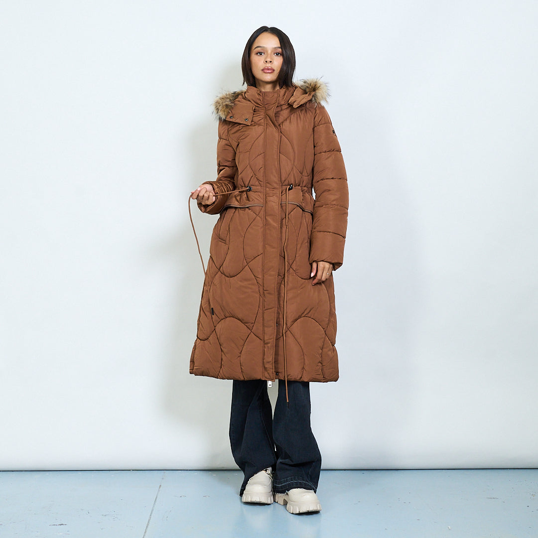 Cappotto imbottito lungo trapuntato con cappuccio in finta pelliccia all'ingrosso