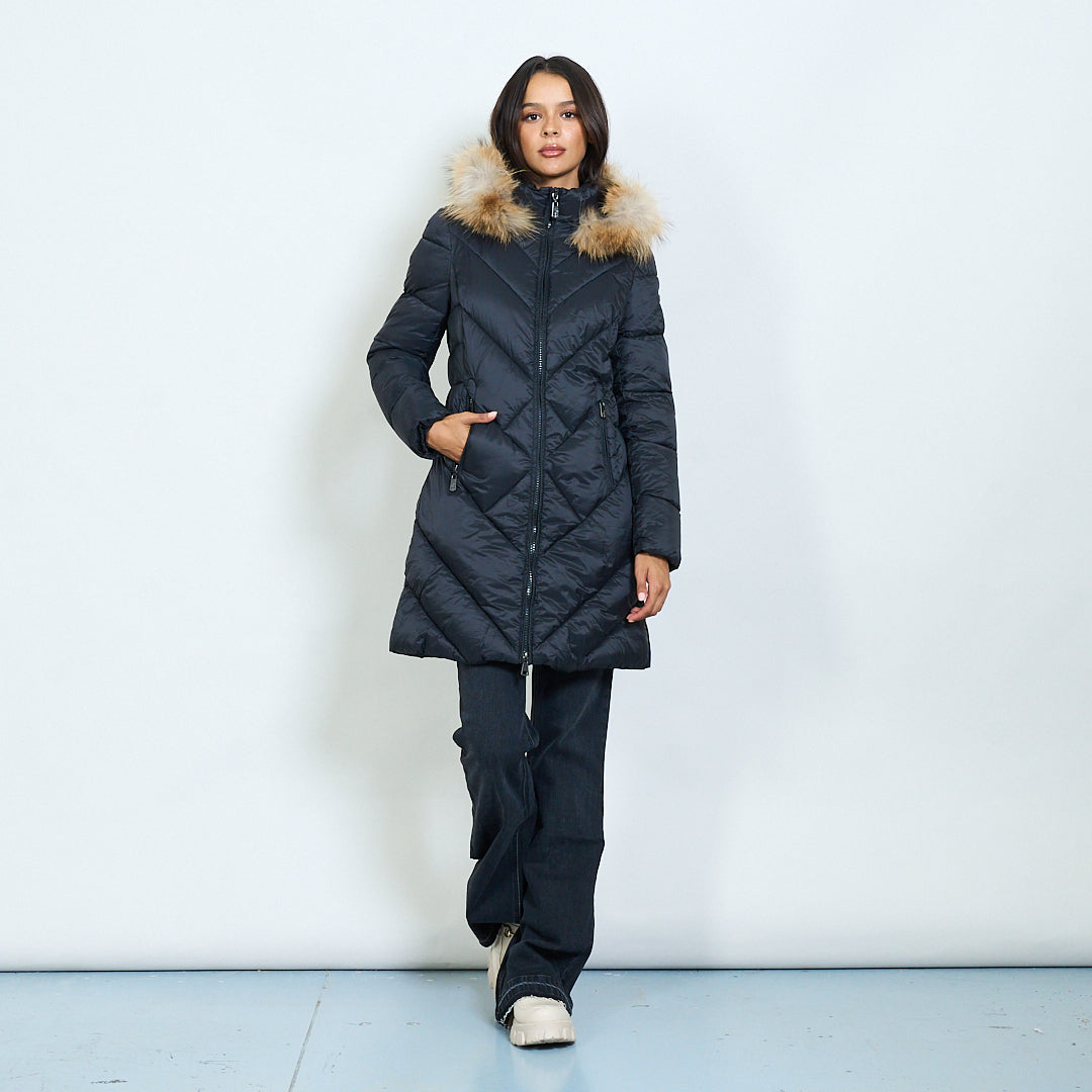 Cappotto imbottito trapuntato chevron con cappuccio in finta pelliccia all'ingrosso