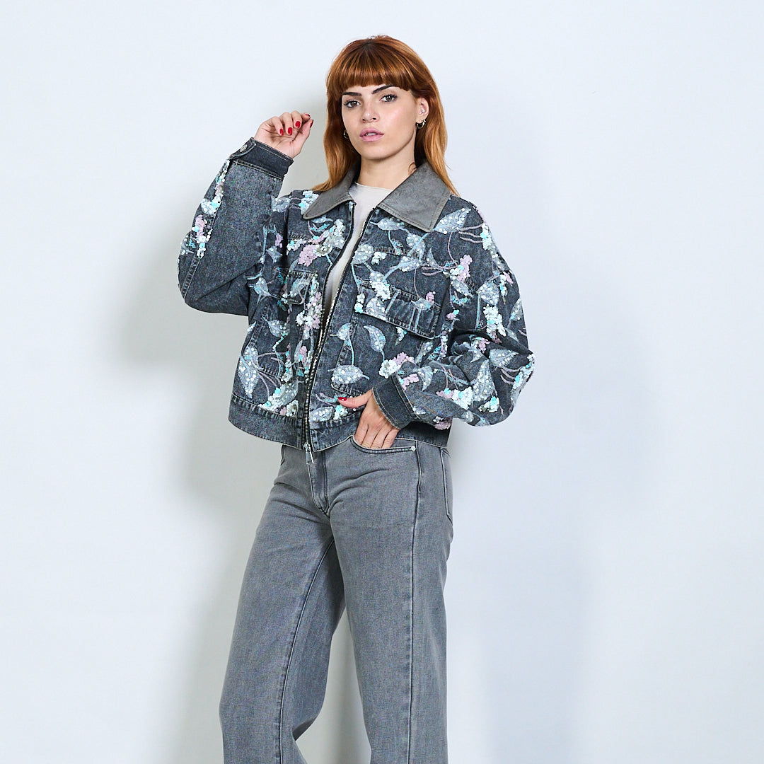 Giacca in jeans ricamata con paillettes floreali con colletto a contrasto all'ingrosso