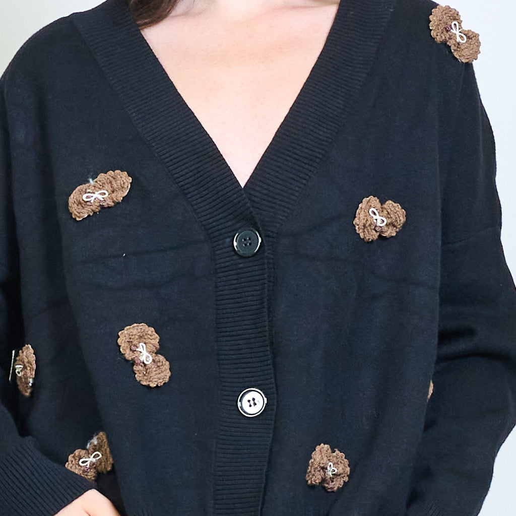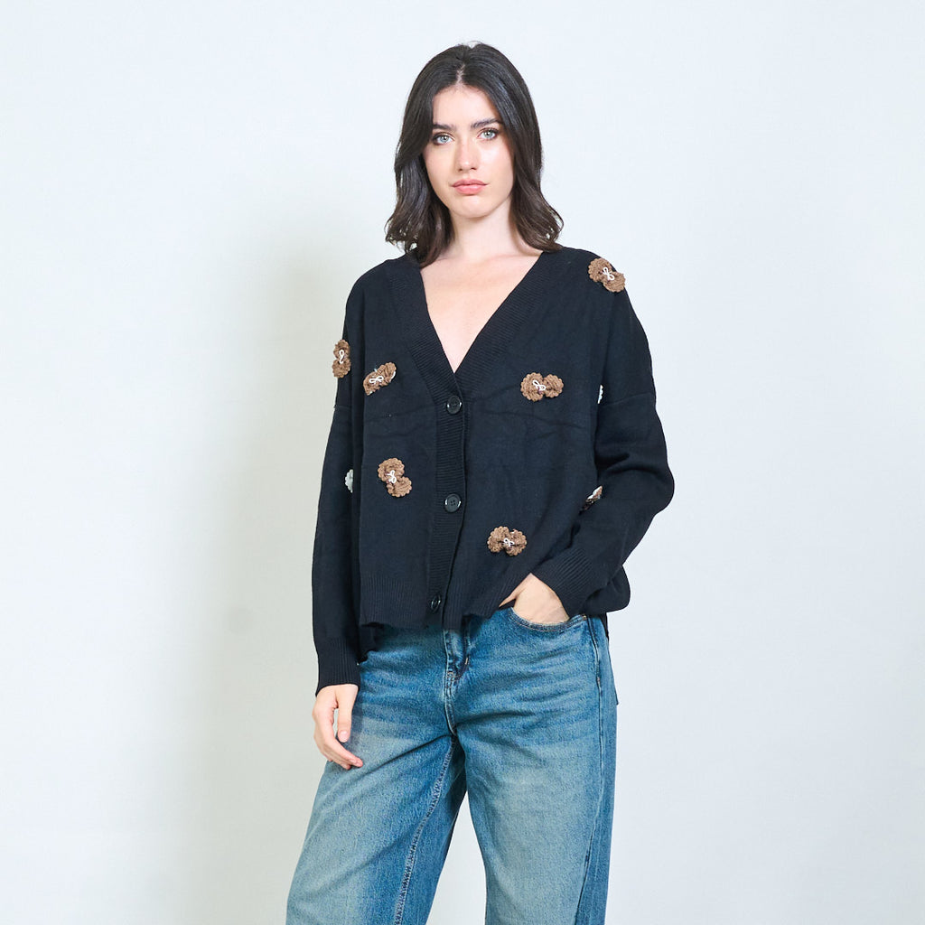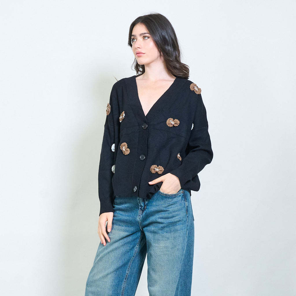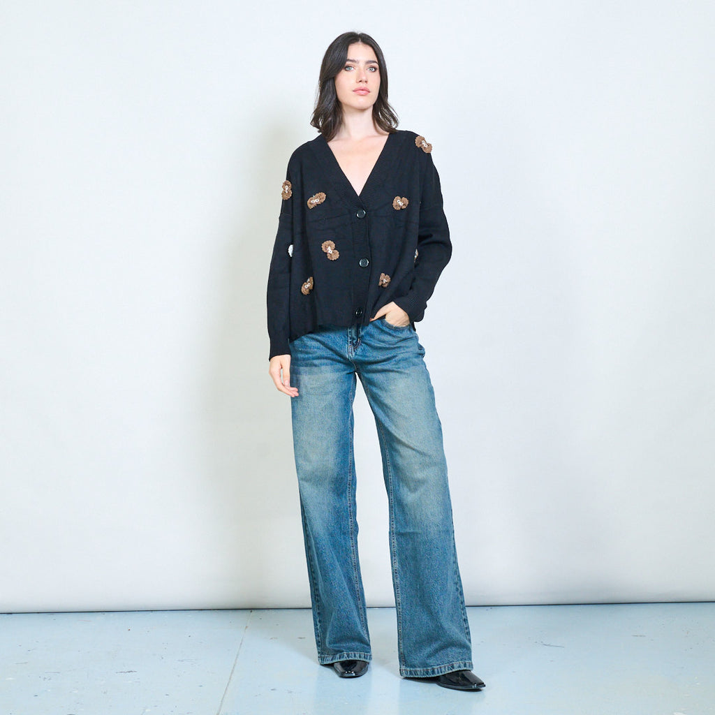 - Cardigan a maglia morbida con una linea a V a coste e chiusura a pulsante