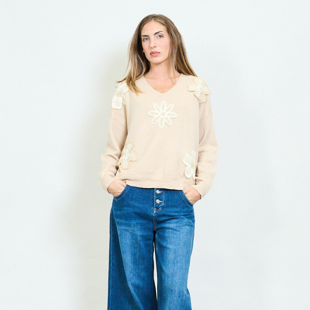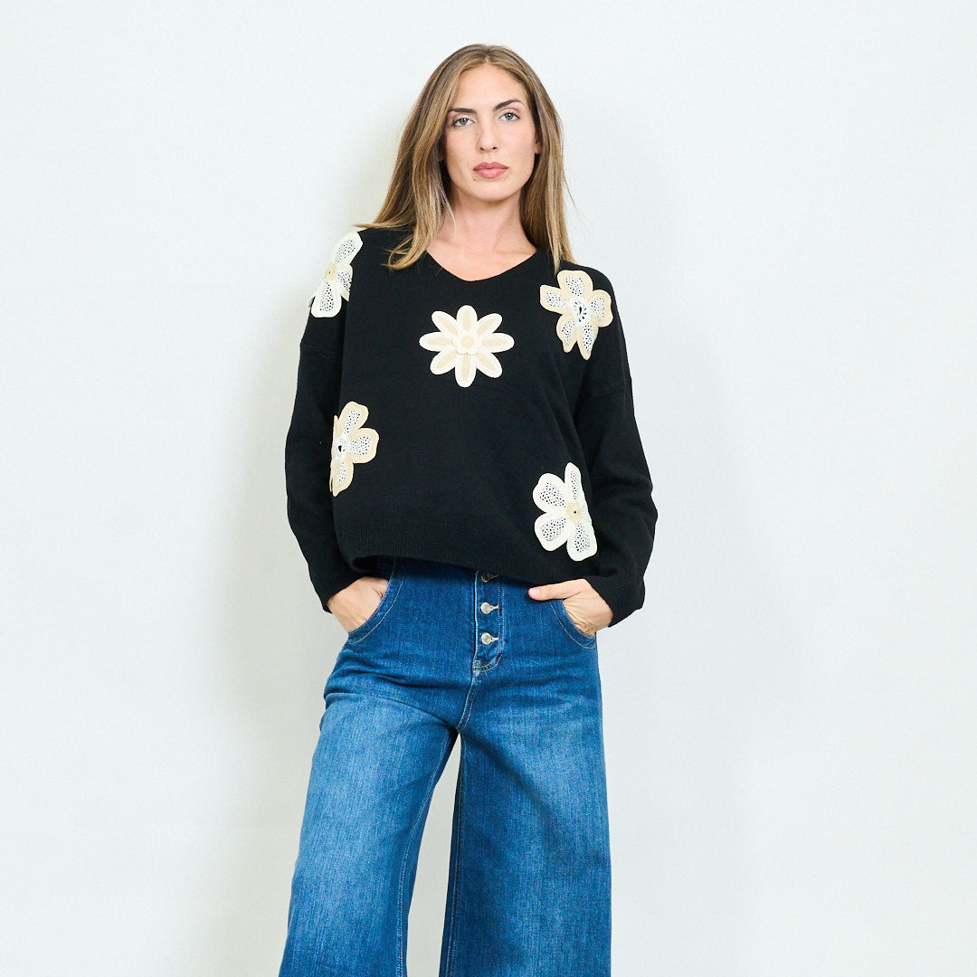 Maglione a forma di appliqué floreale di grandi dimensioni all'uncinetto all'ingrosso