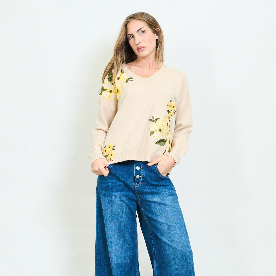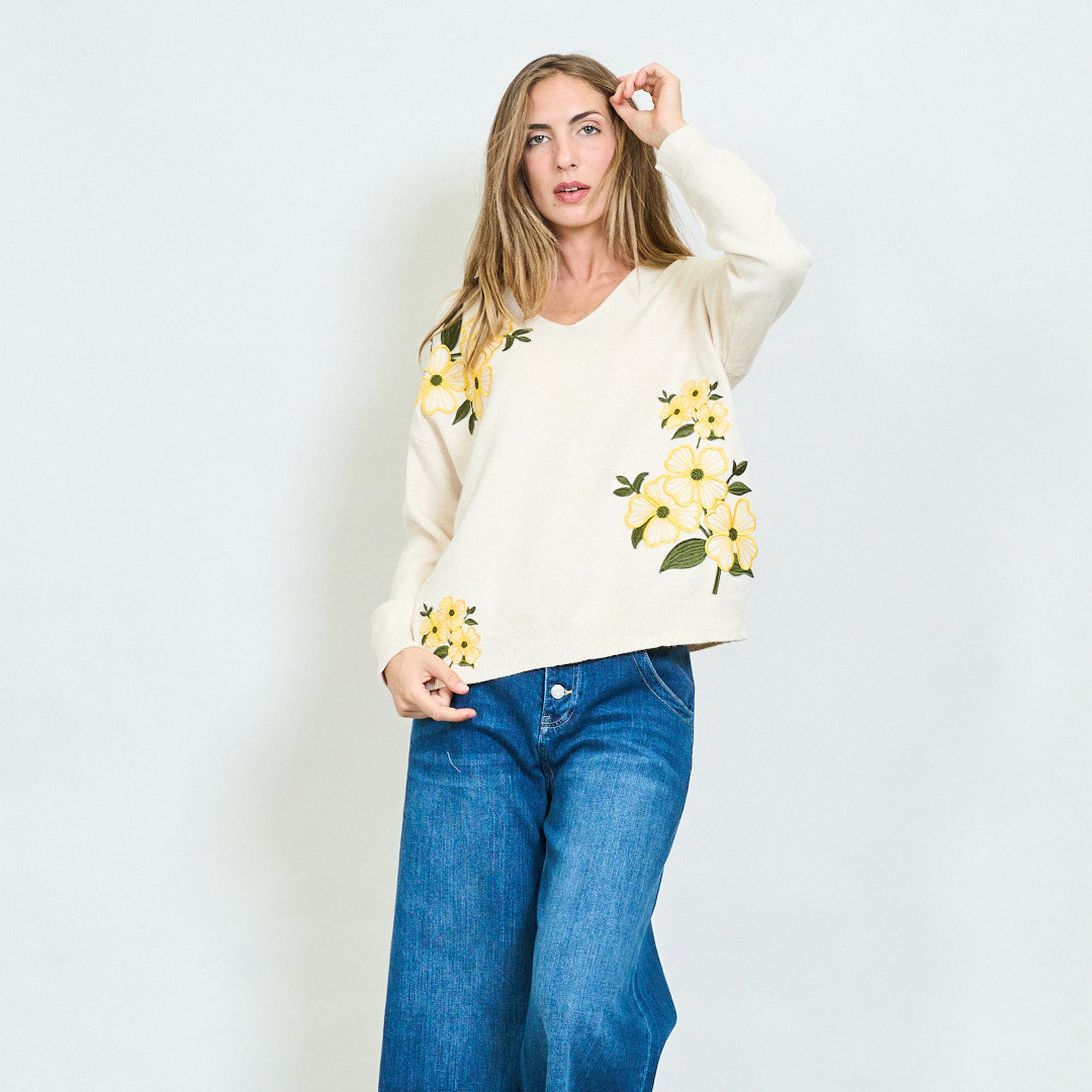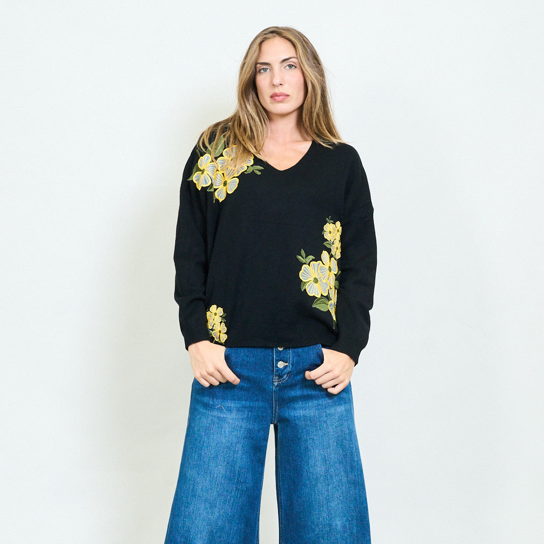 - Maglione morbido con scollo a V con audaci ricami floreali
