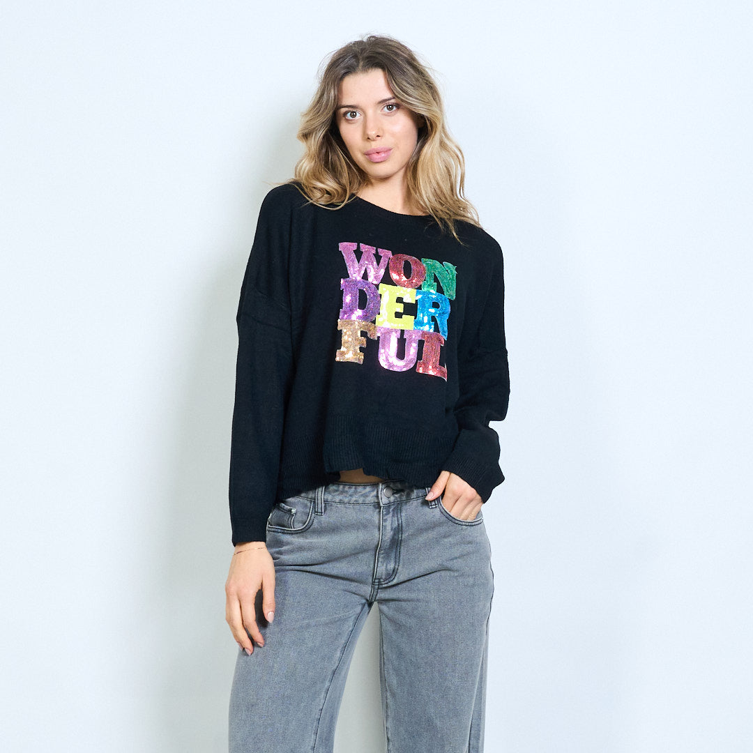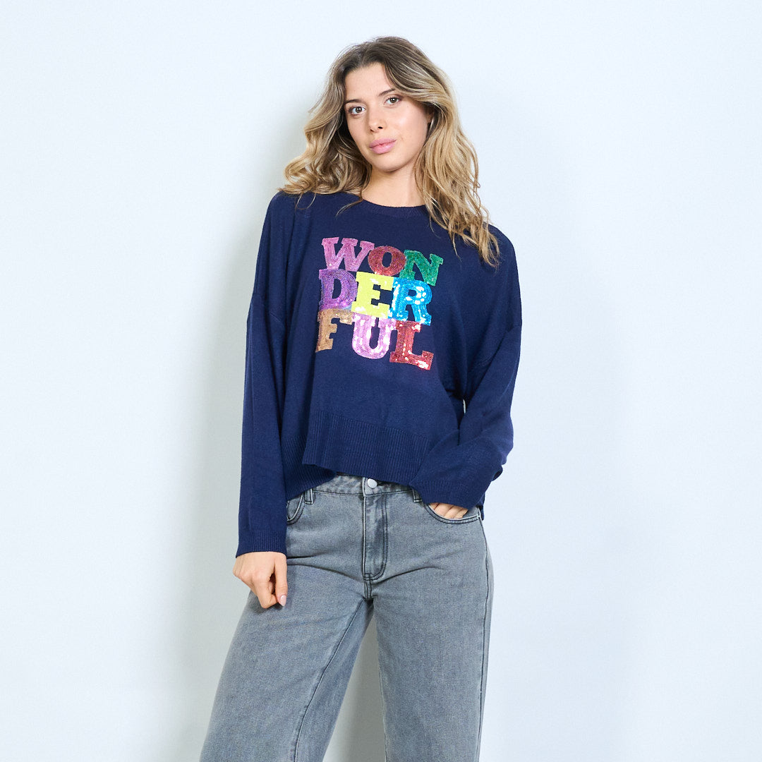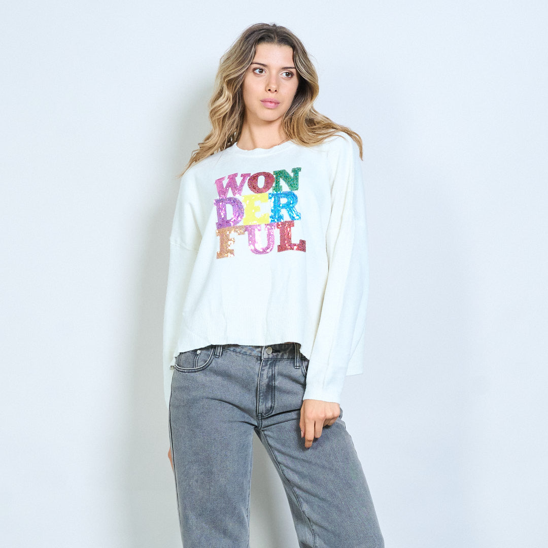 - Maglione girocollo con audace scritta grafica arcobaleno "Wonderful".