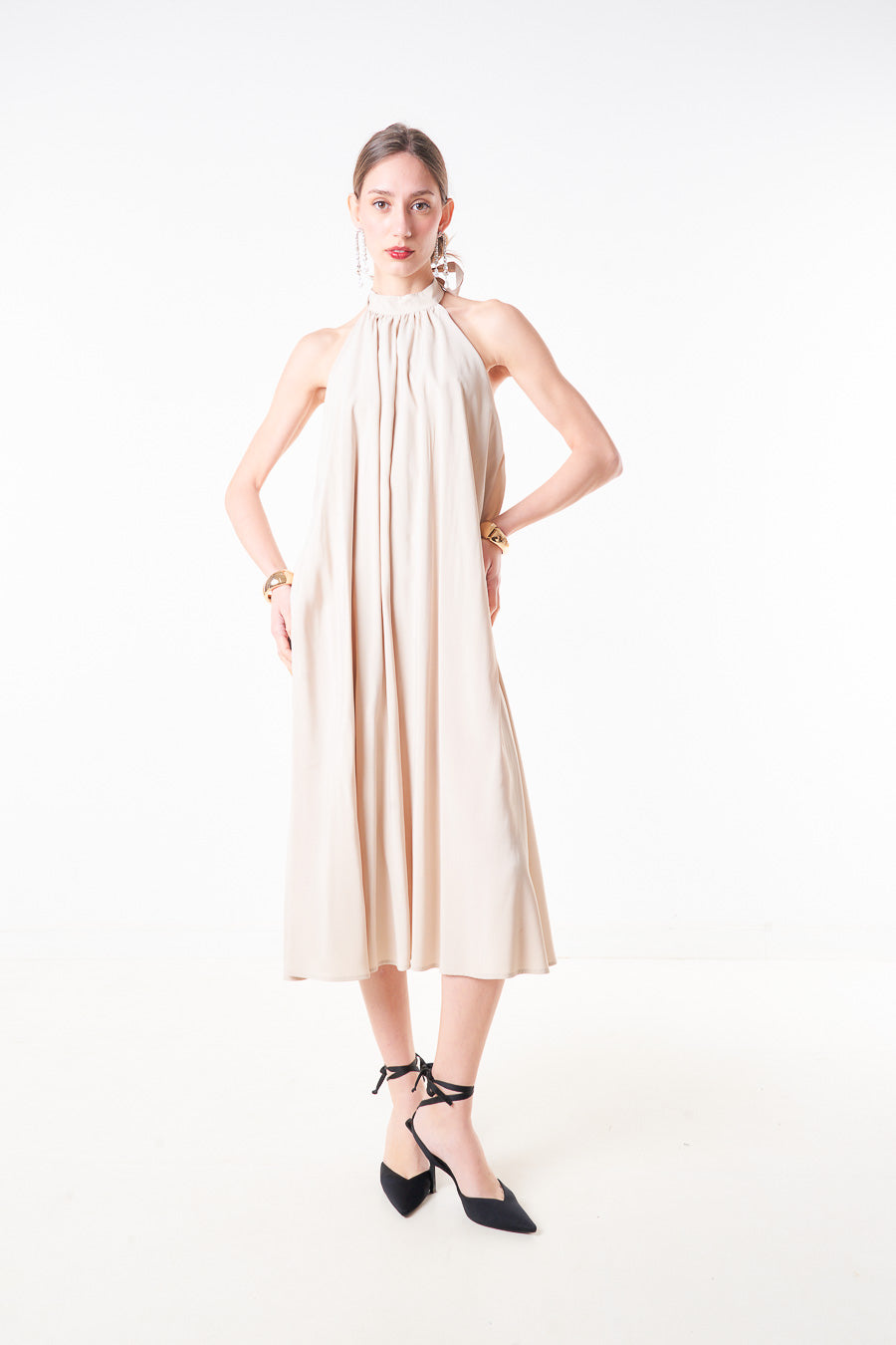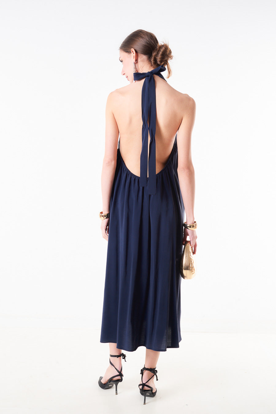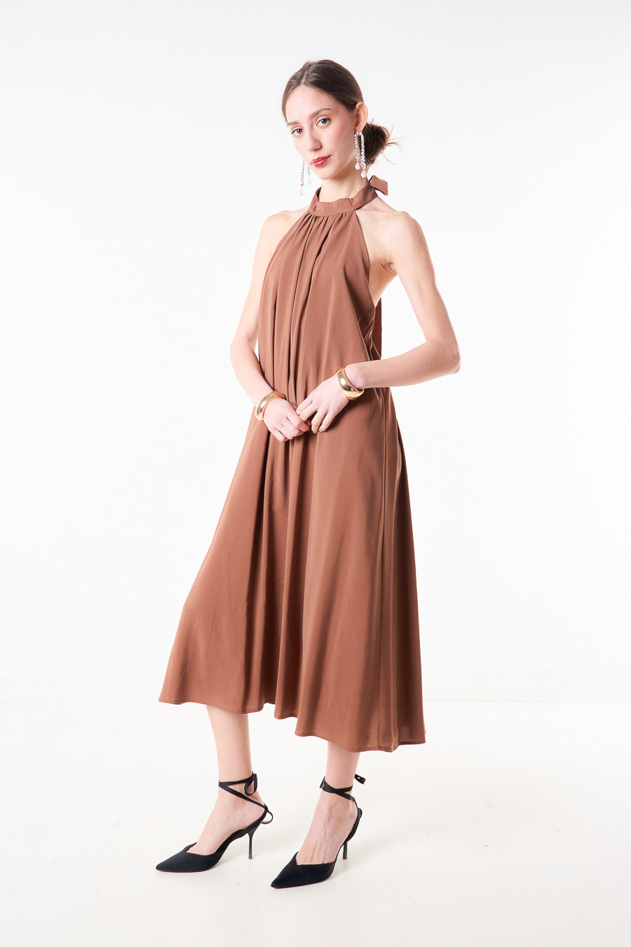 Abito midi plissettato con scollo all'americana e scollo allacciato sul retro