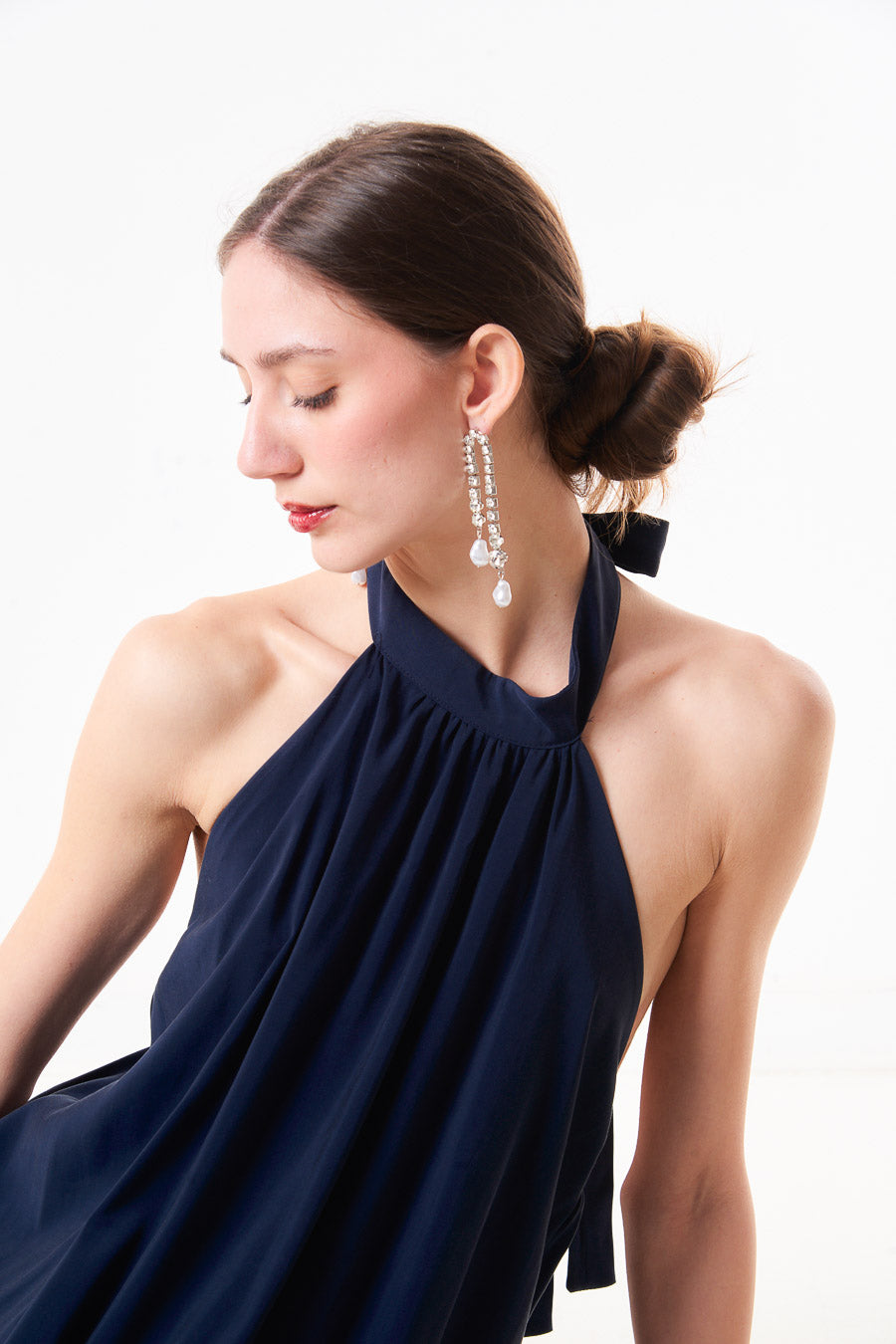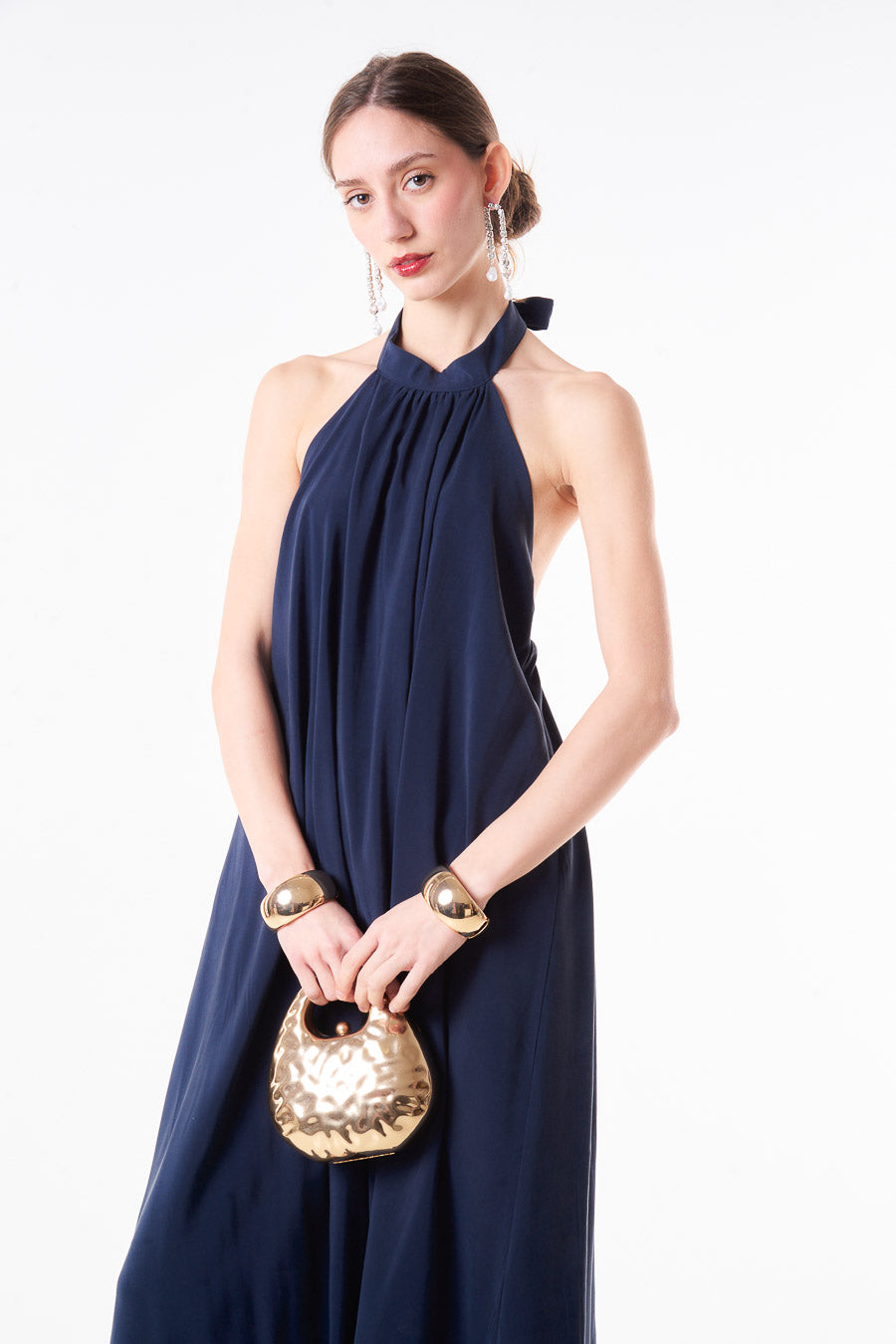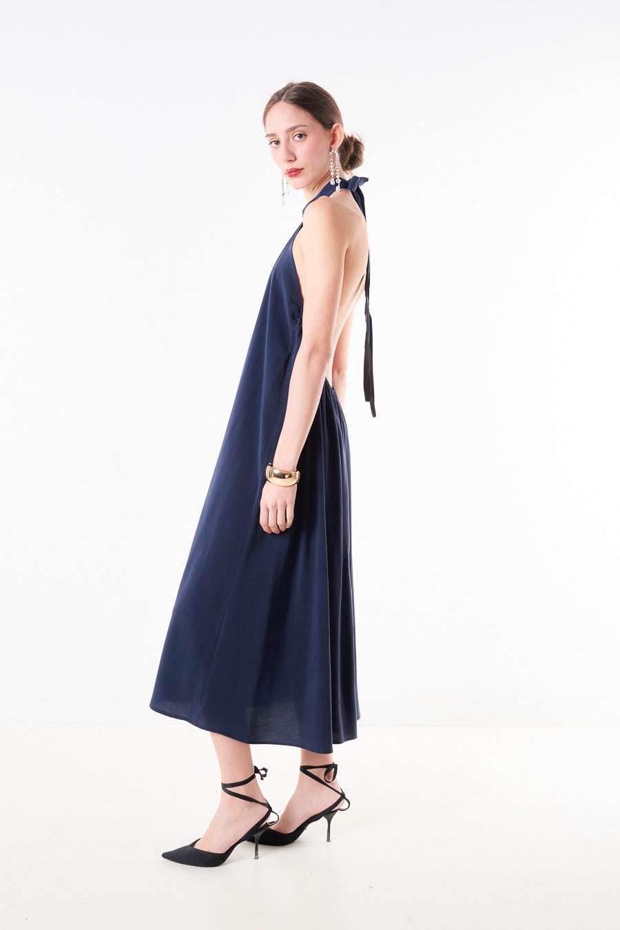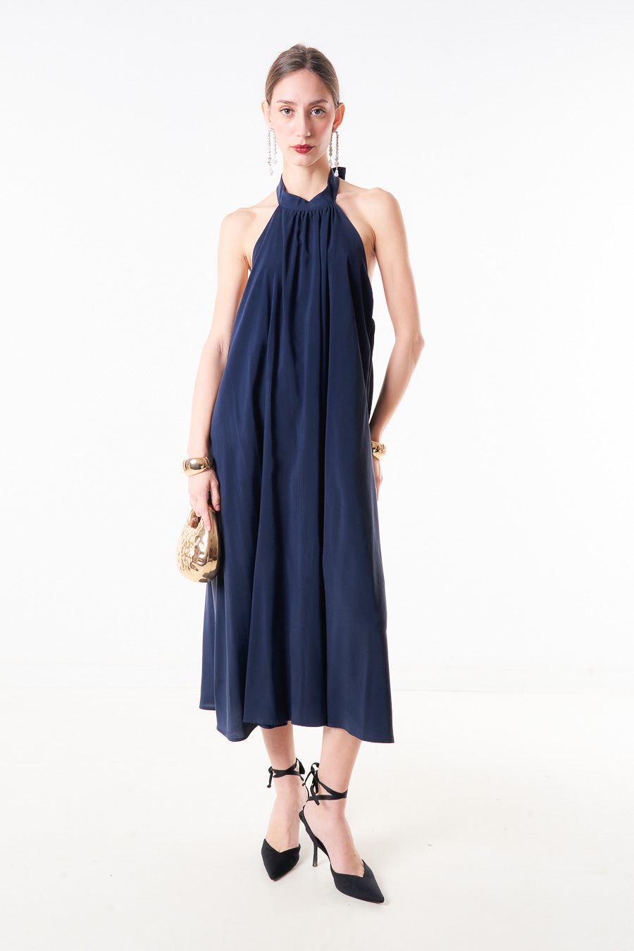 Abito midi plissettato con scollo all'americana e scollo allacciato sul retro