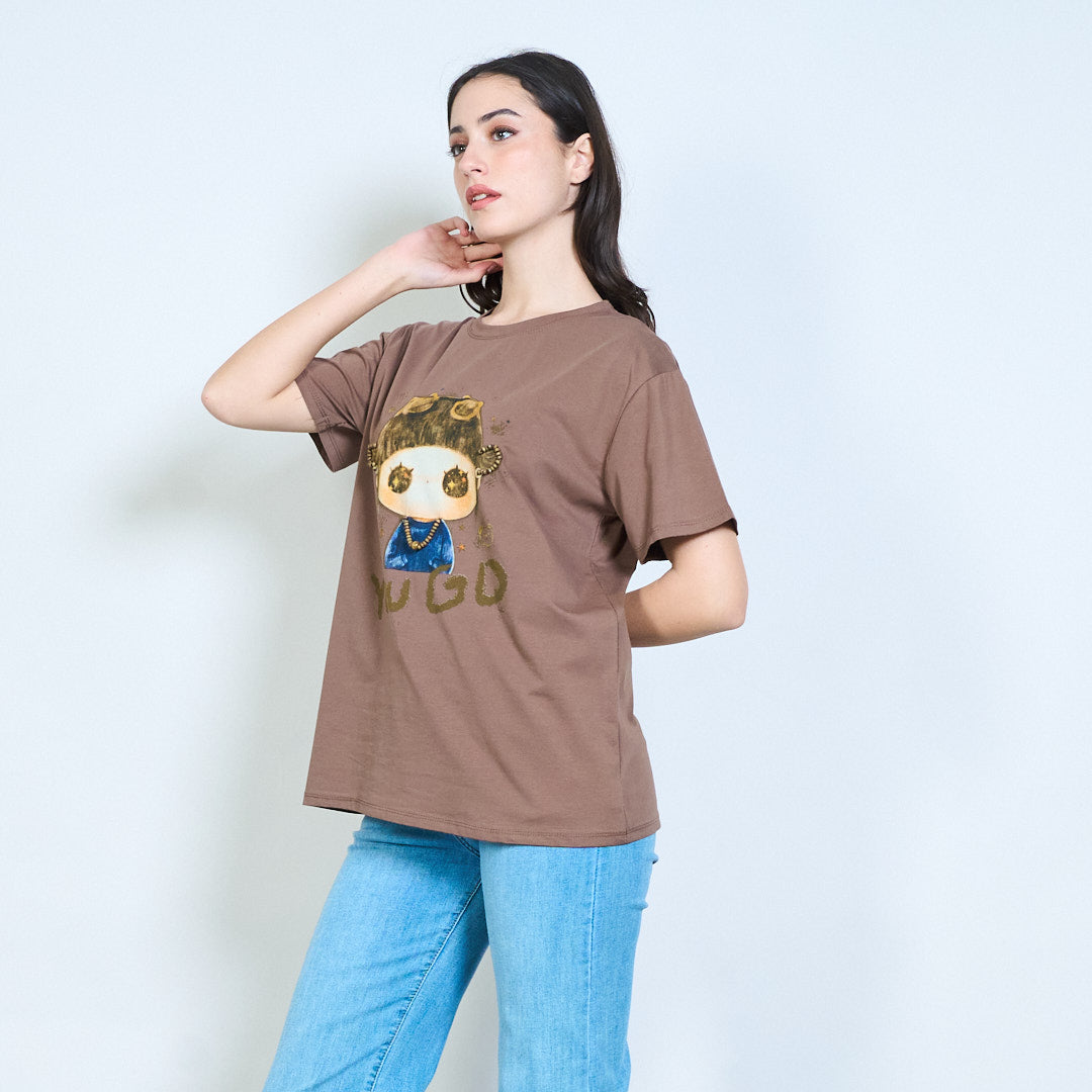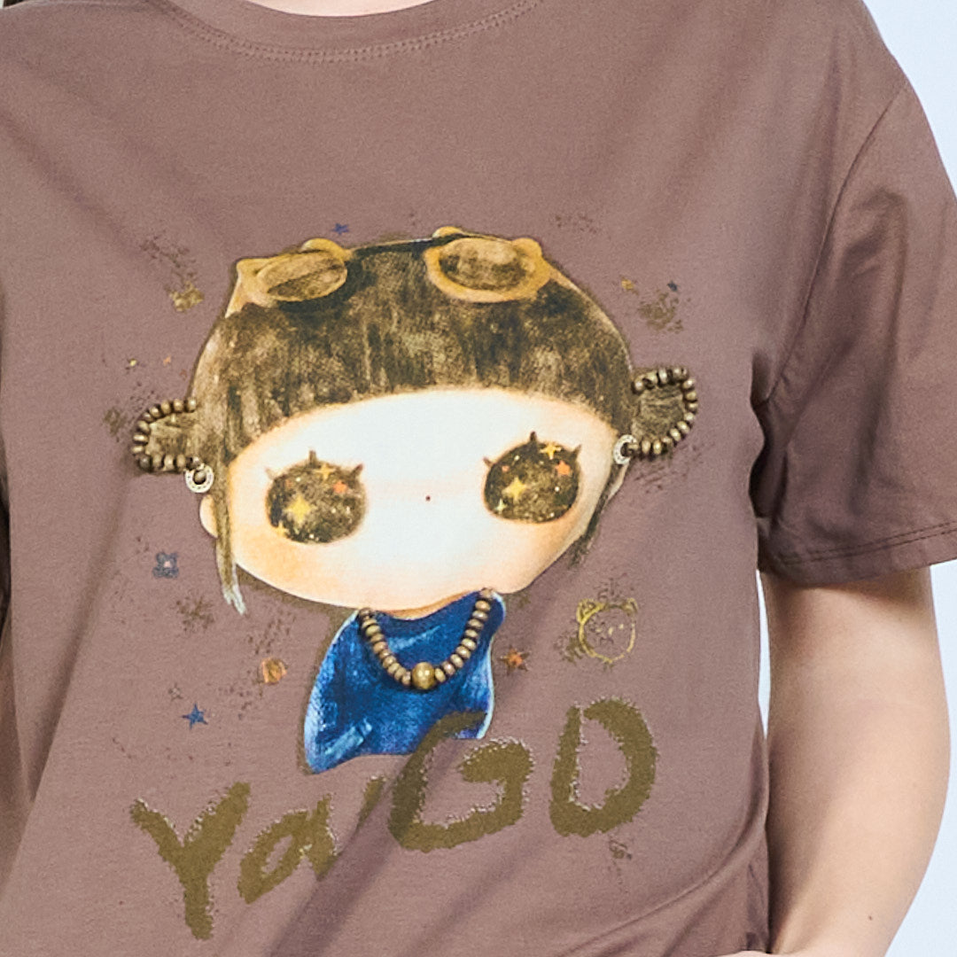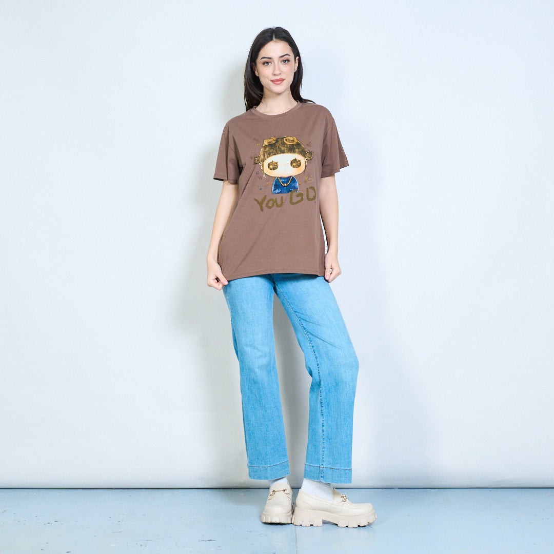T-shirt girocollo a maniche corte con stampa bambola "you go" all'ingrosso