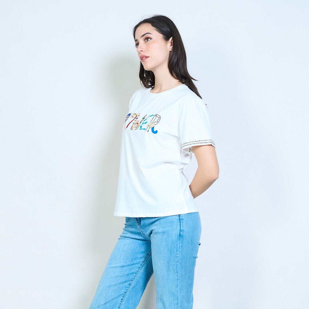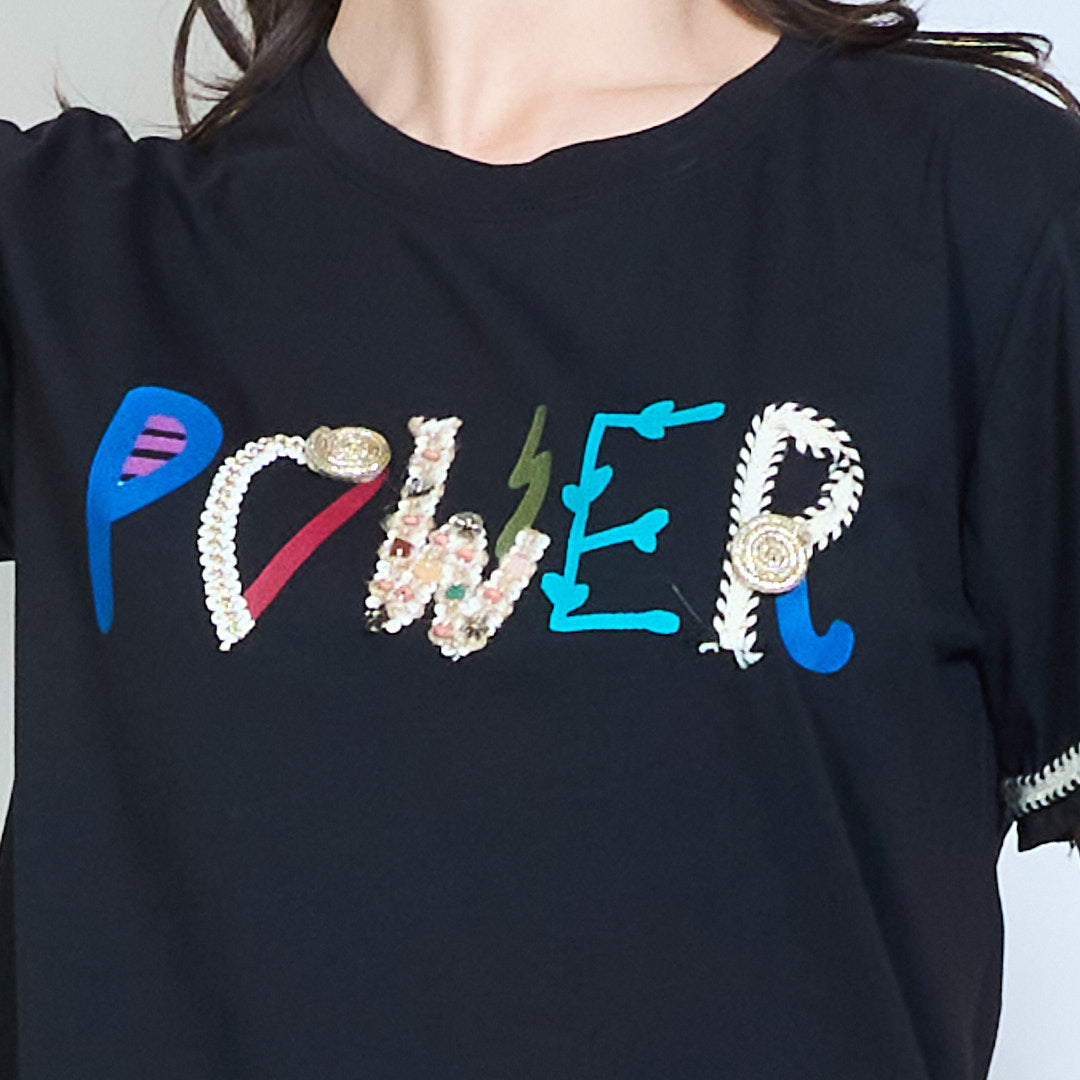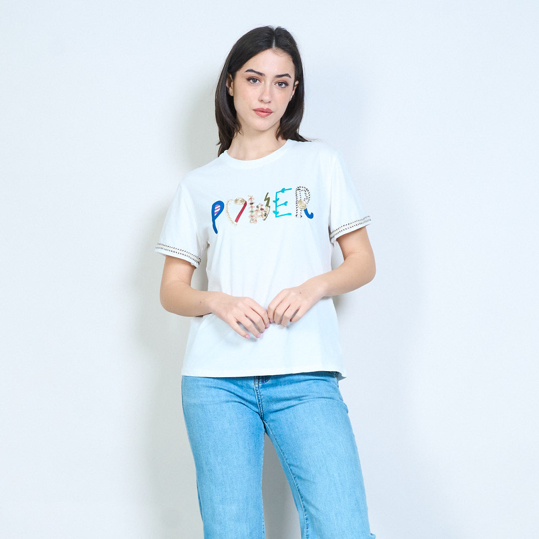 T-shirt girocollo a maniche corte con stampa di scritte impreziosite dal potere all'ingrosso