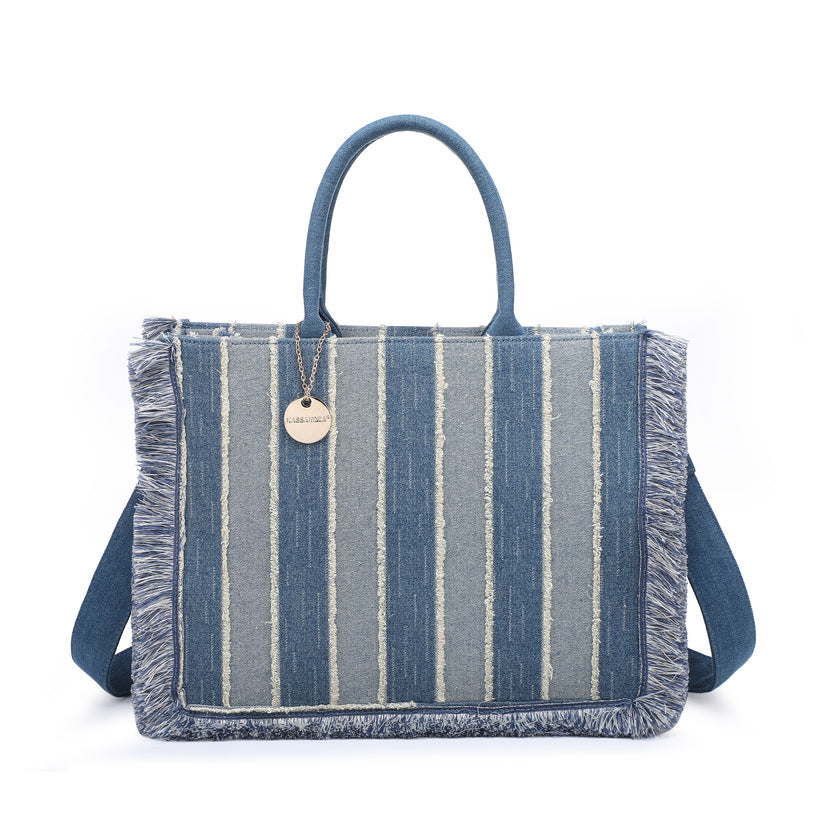 Borsa in denim a strisce con finiture con frange e silhouette strutturata all'ingrosso