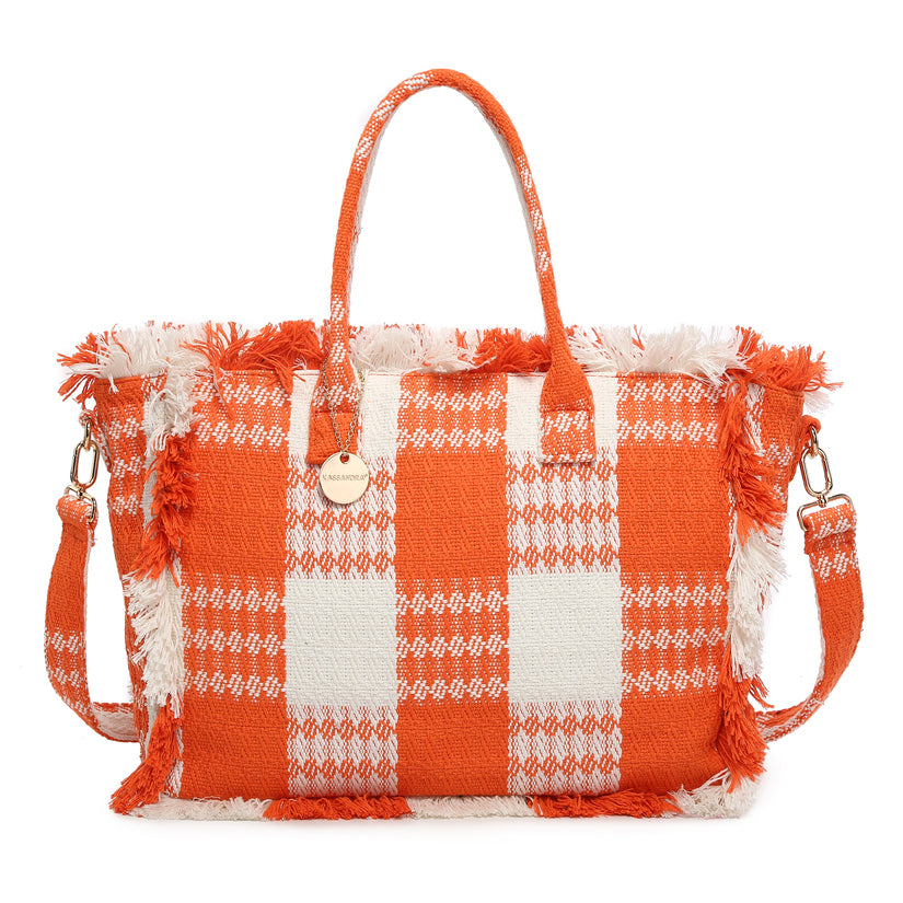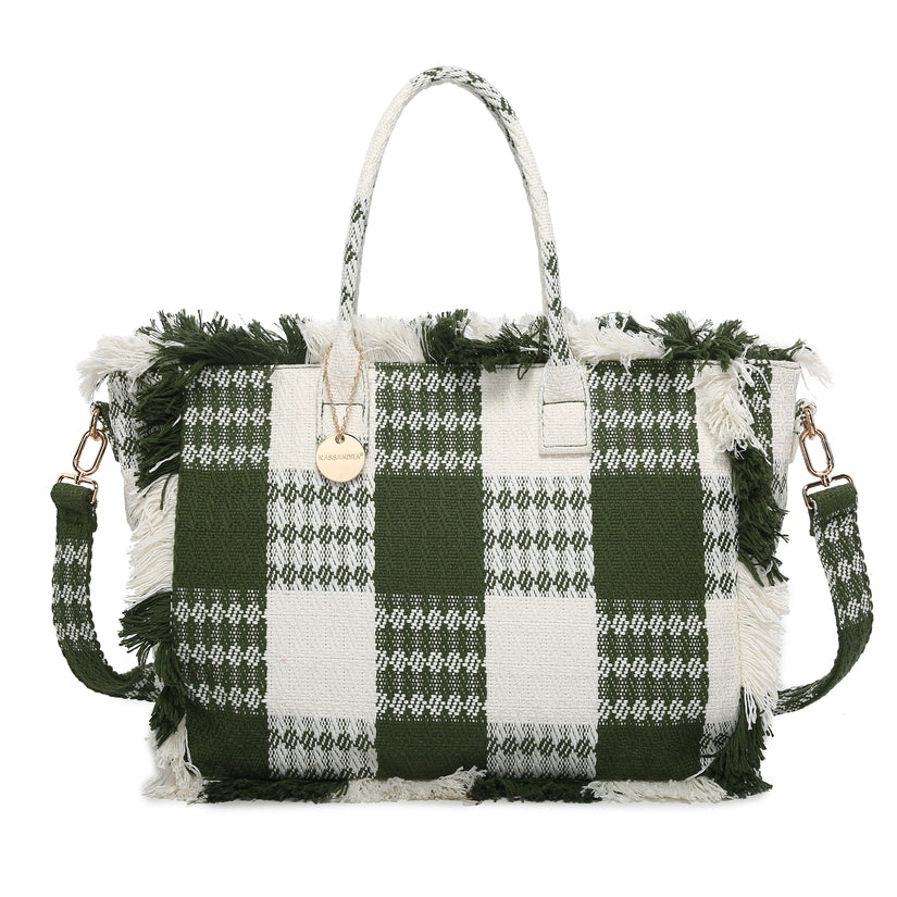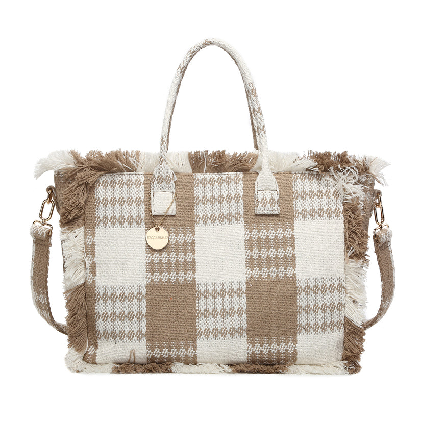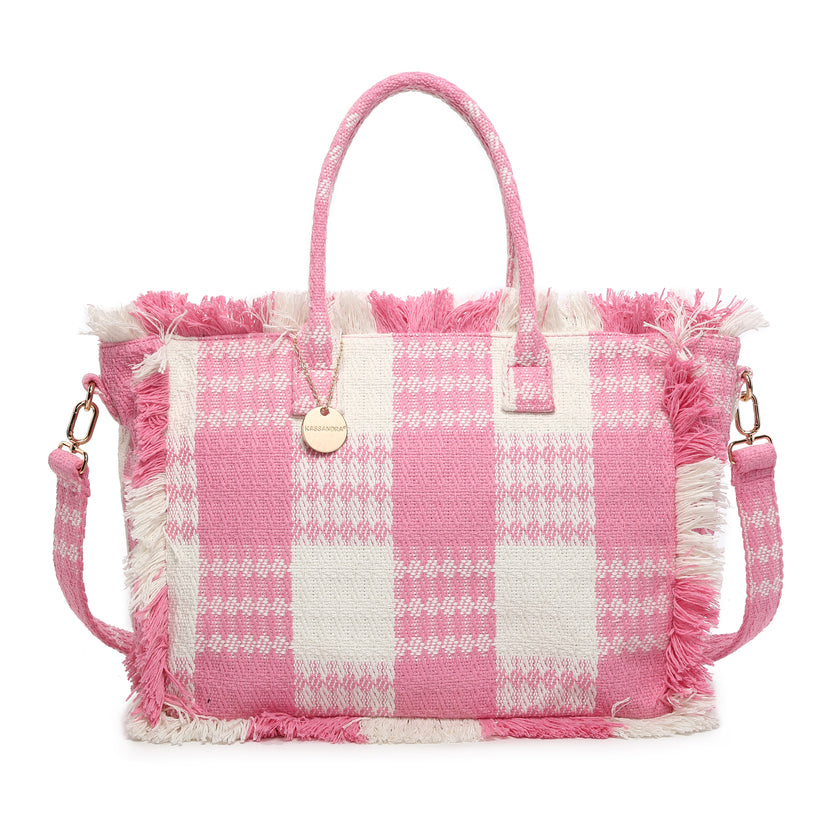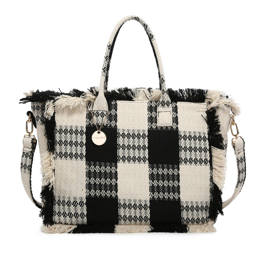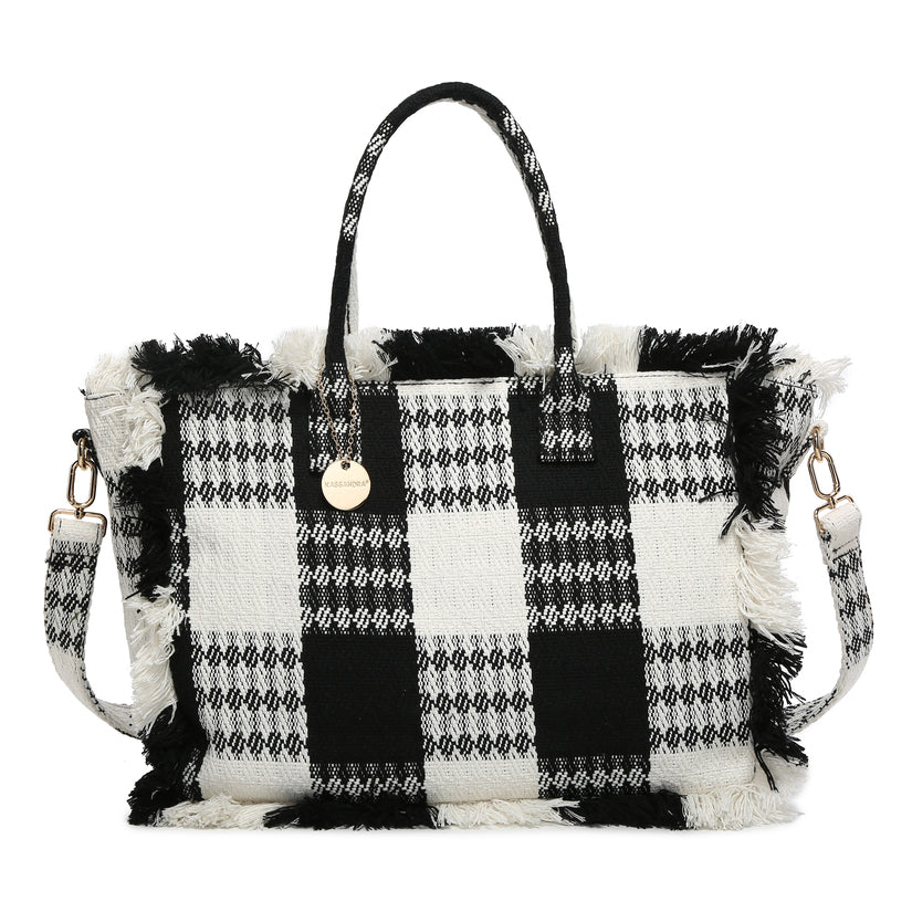 Borsa con frangia a scacchi intrecciata con doppie maniglie e spalla all'ingrosso