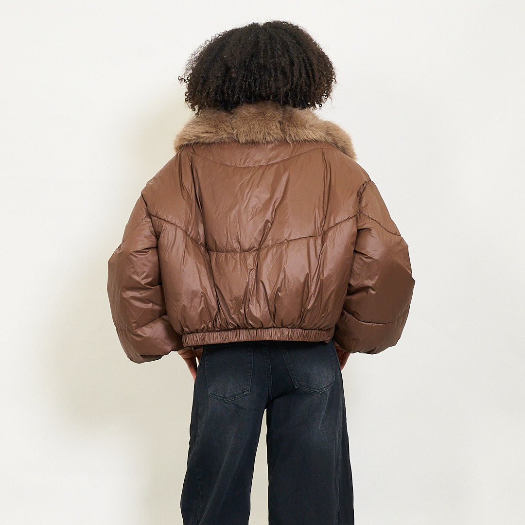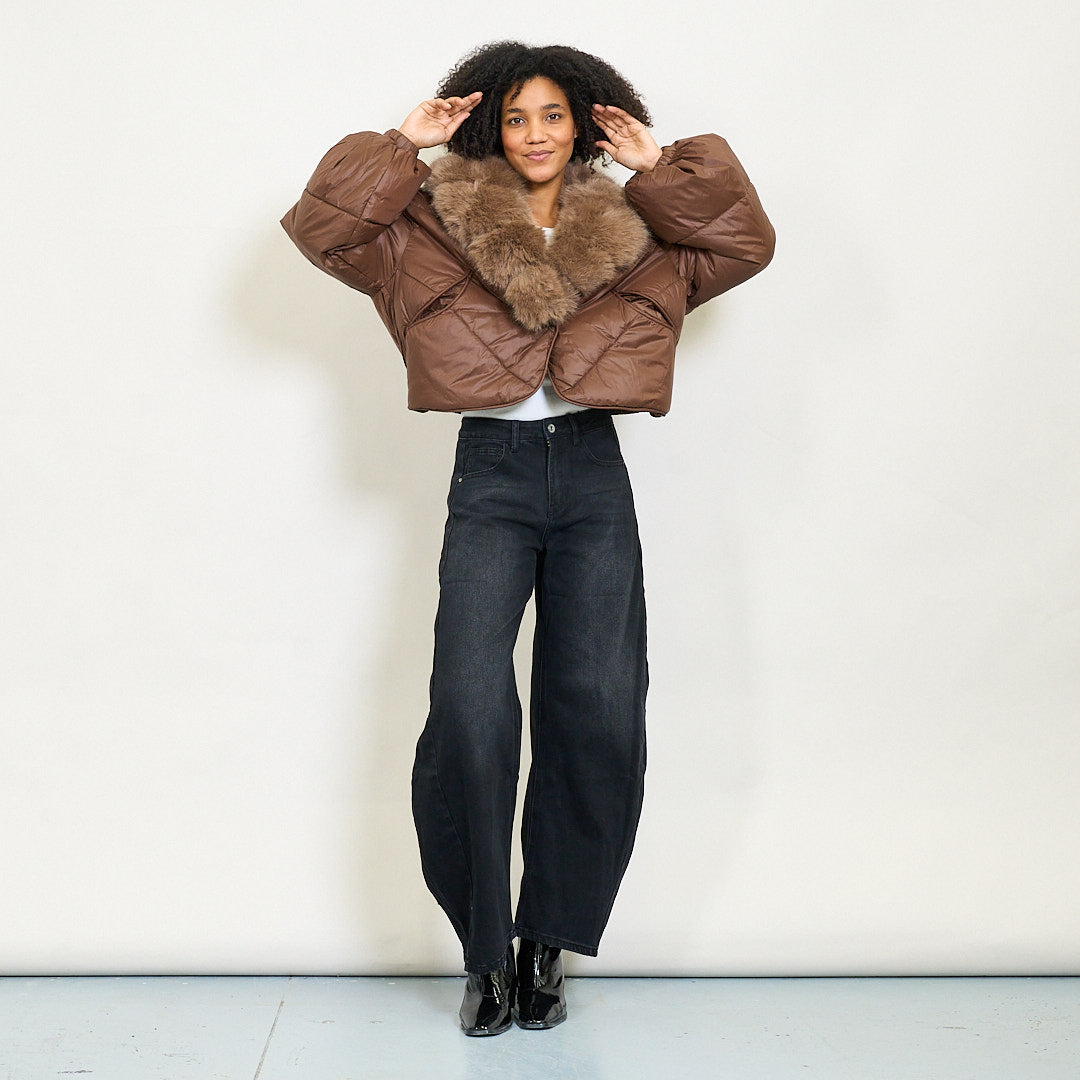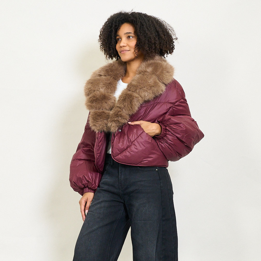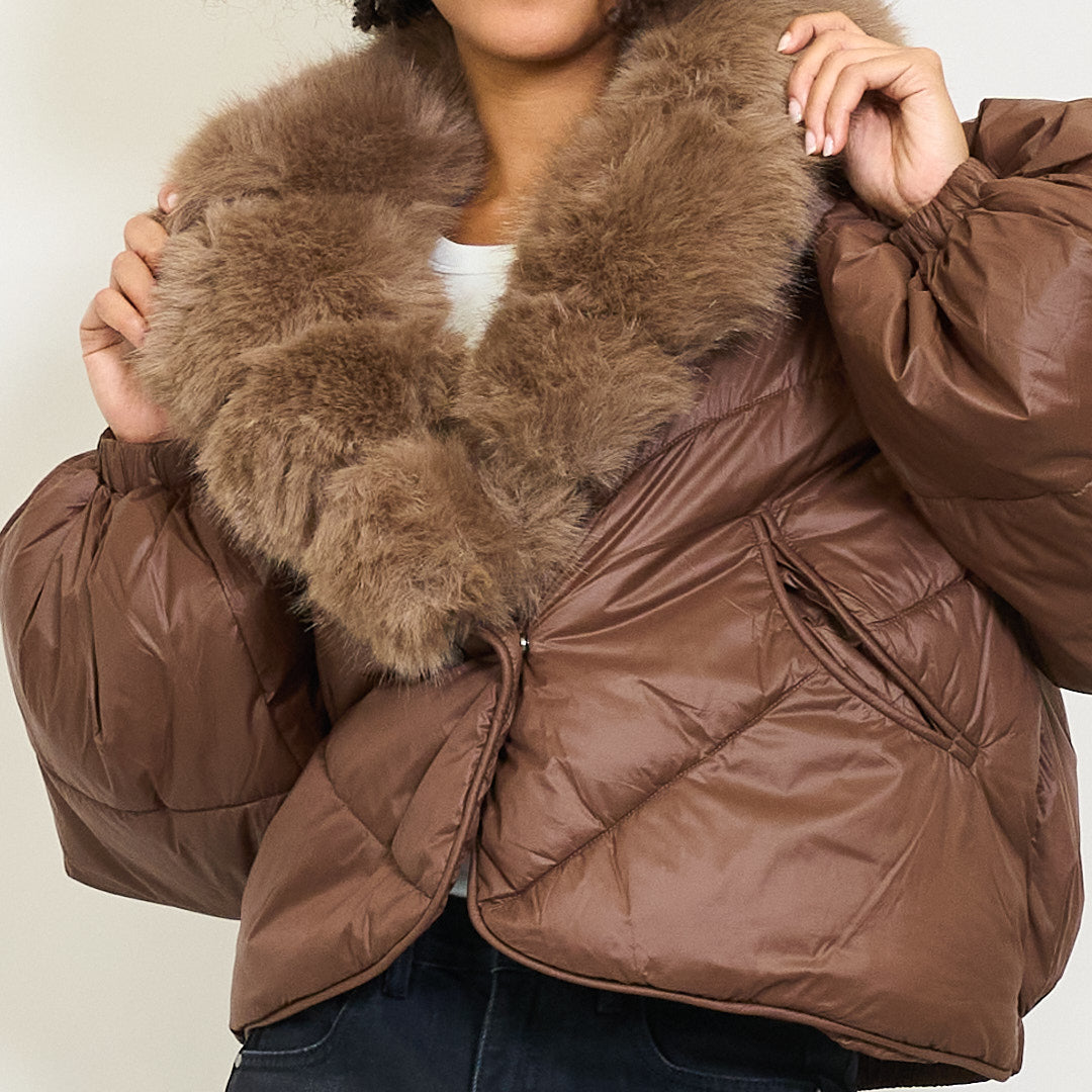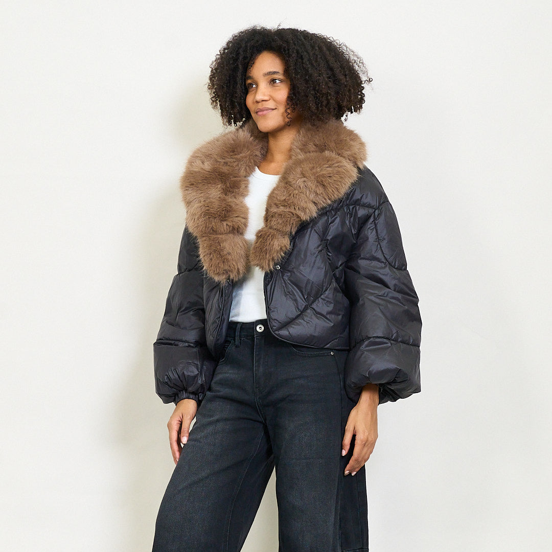 Giacca imbottita ritagliata con colletto di pelliccia in finto oversize e maniche a soffio all'ingrosso