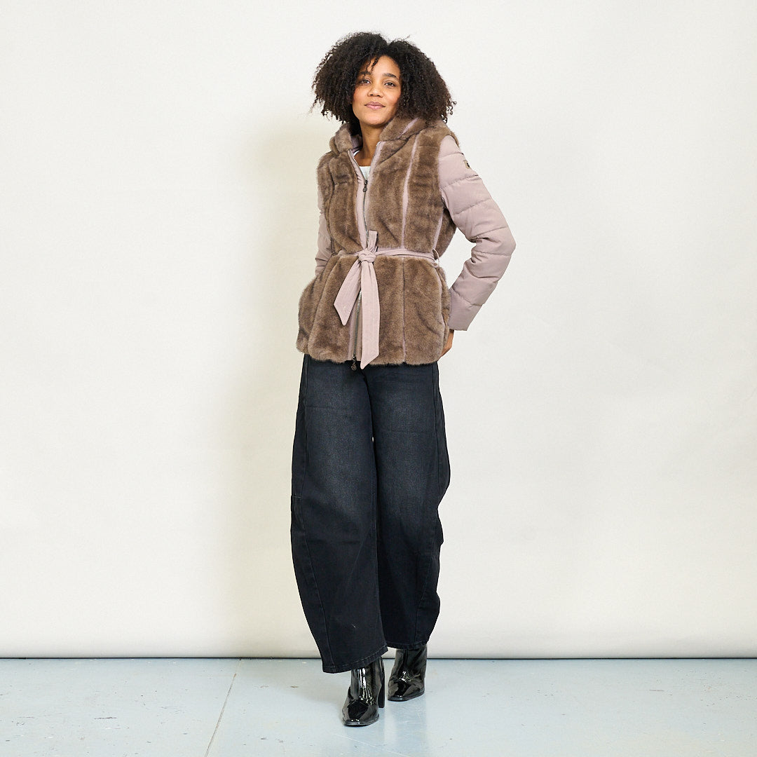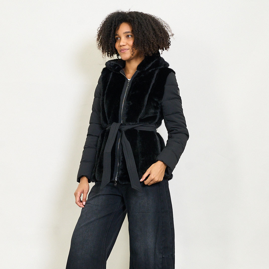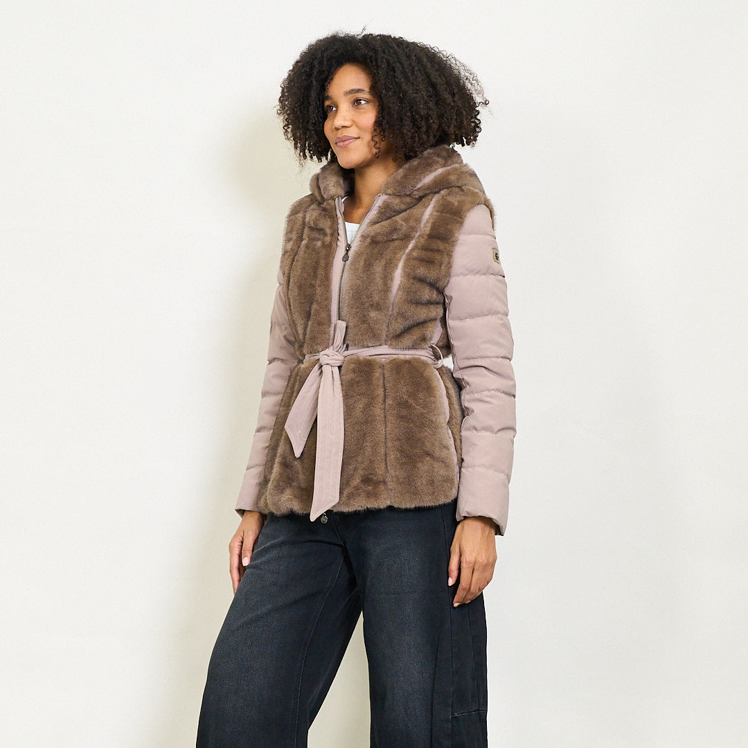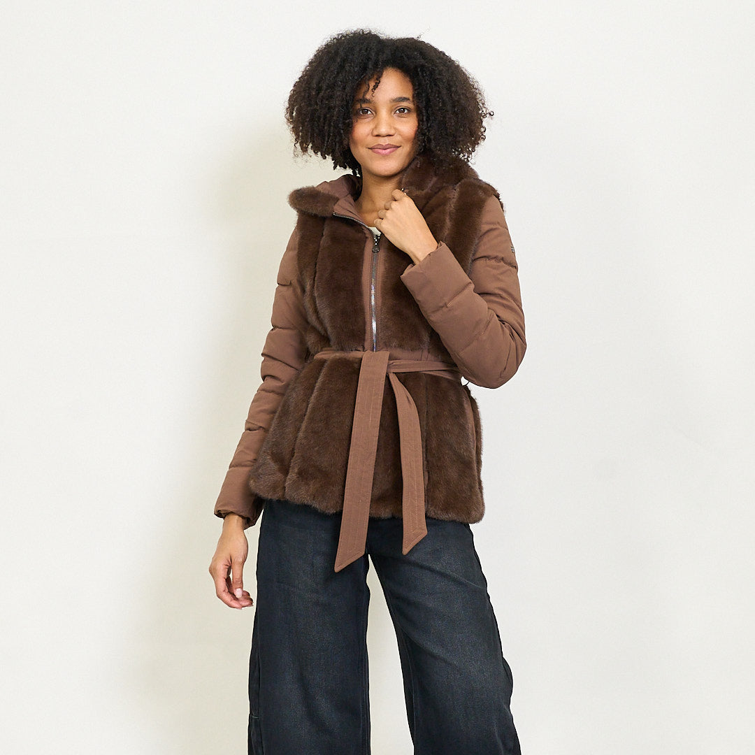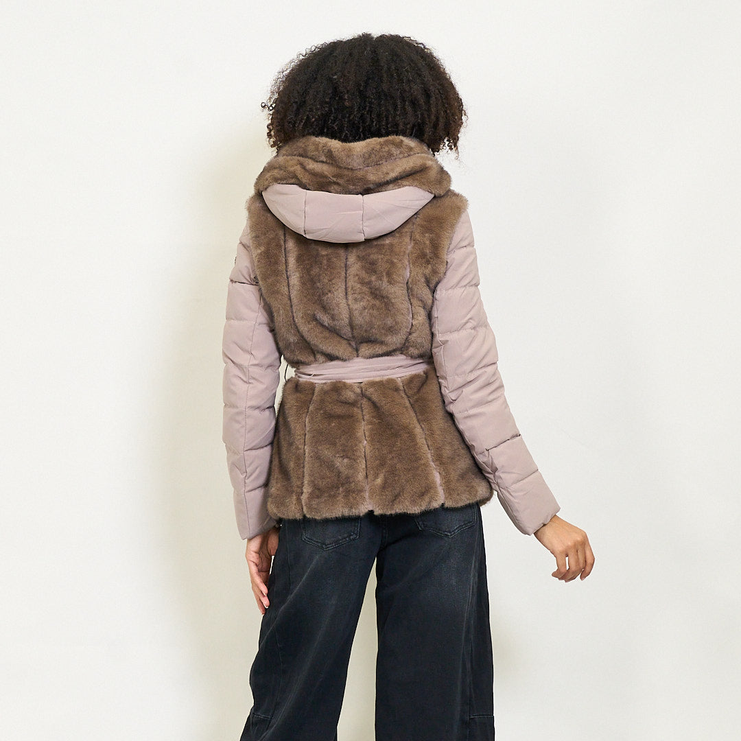 Giacca imbottita aderente con pelliccia in finto e cinghia all'ingrosso