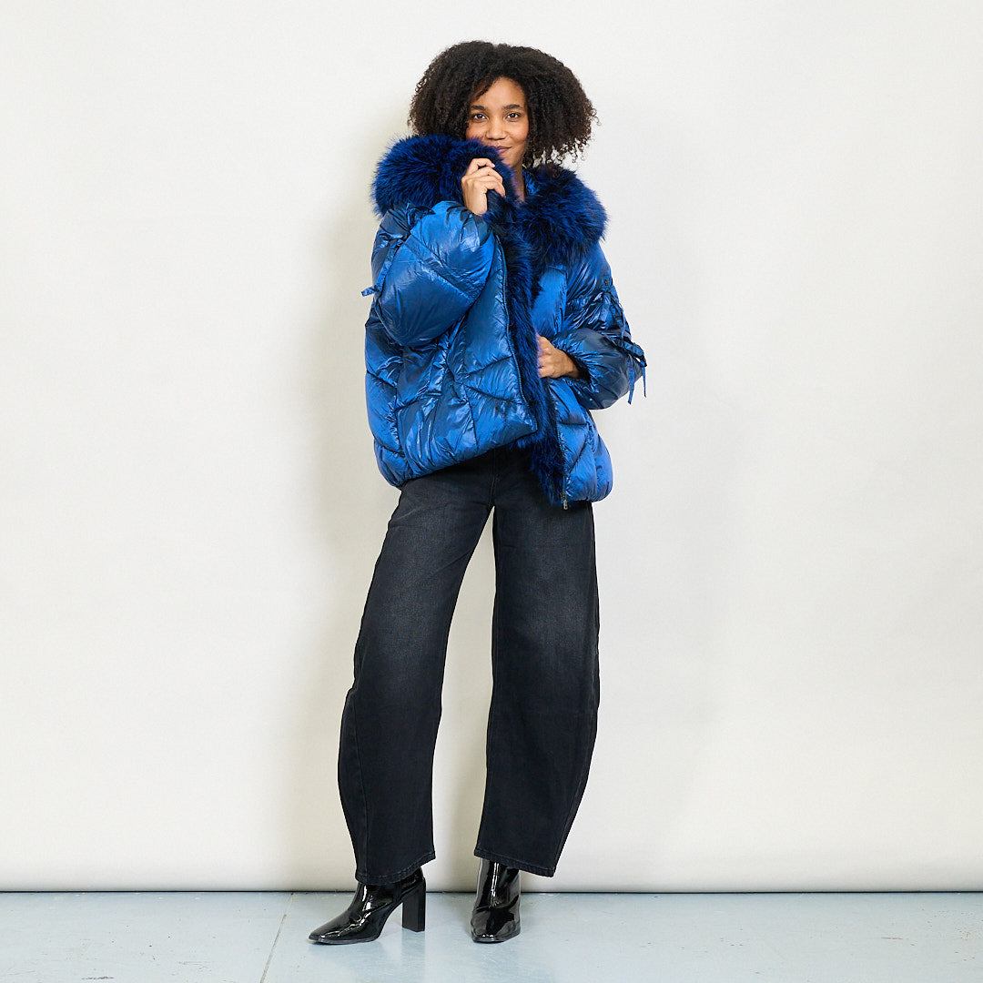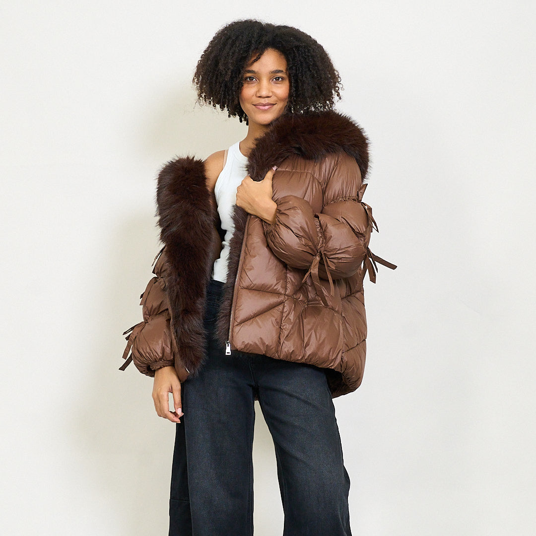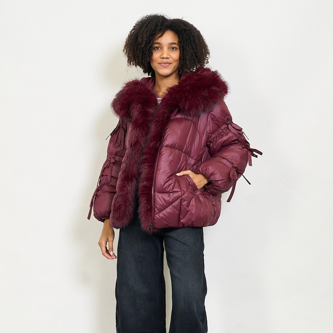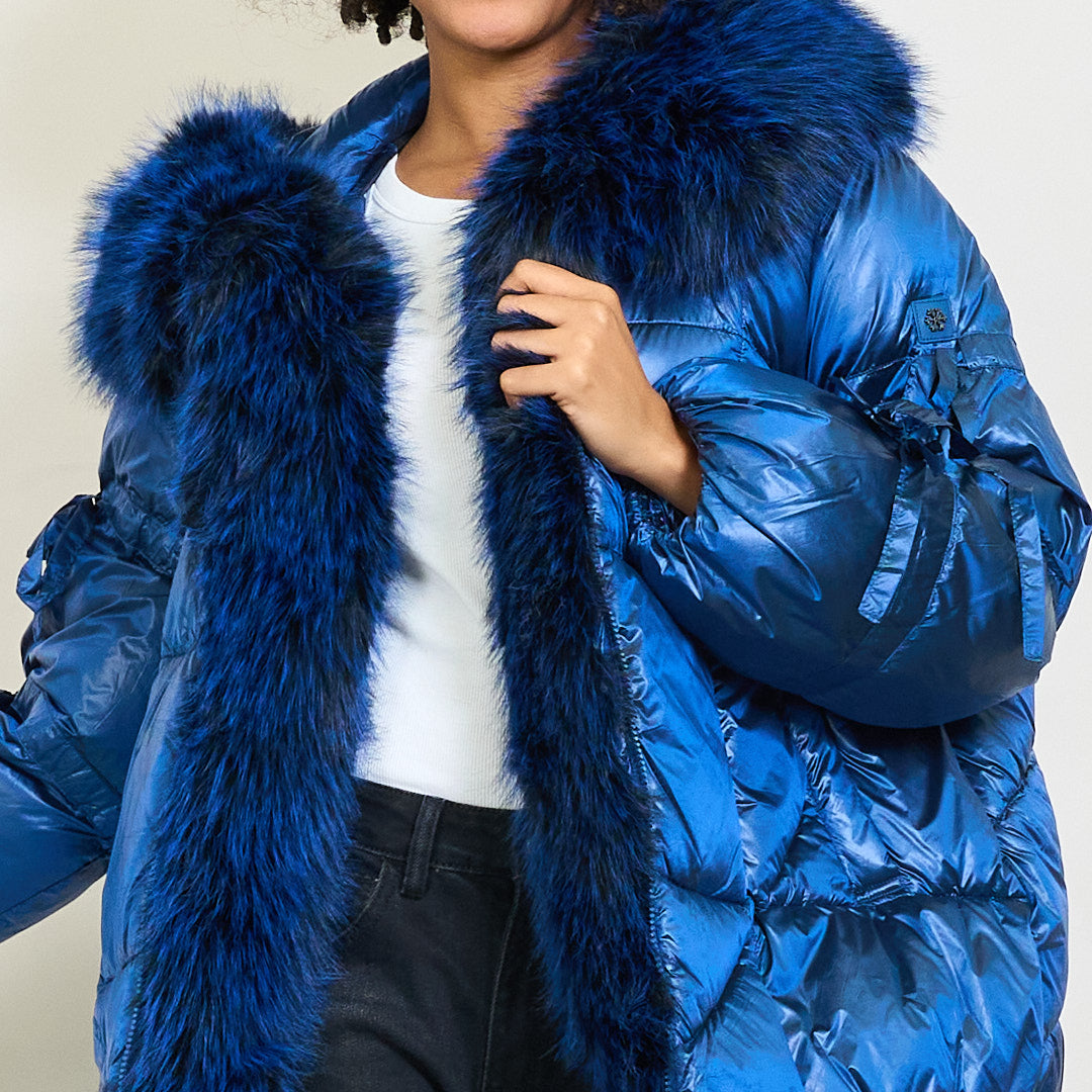 Giacca imbottita lucida con colletto di pelliccia in finto oversize all'ingrosso