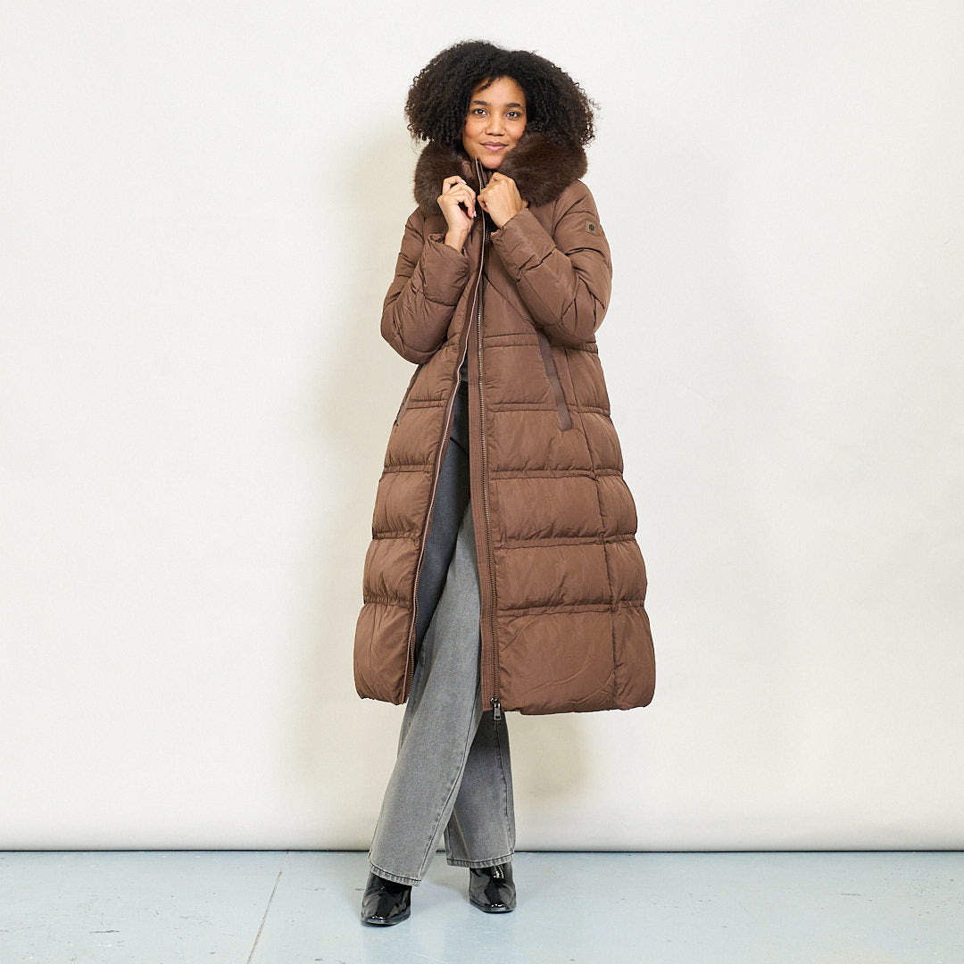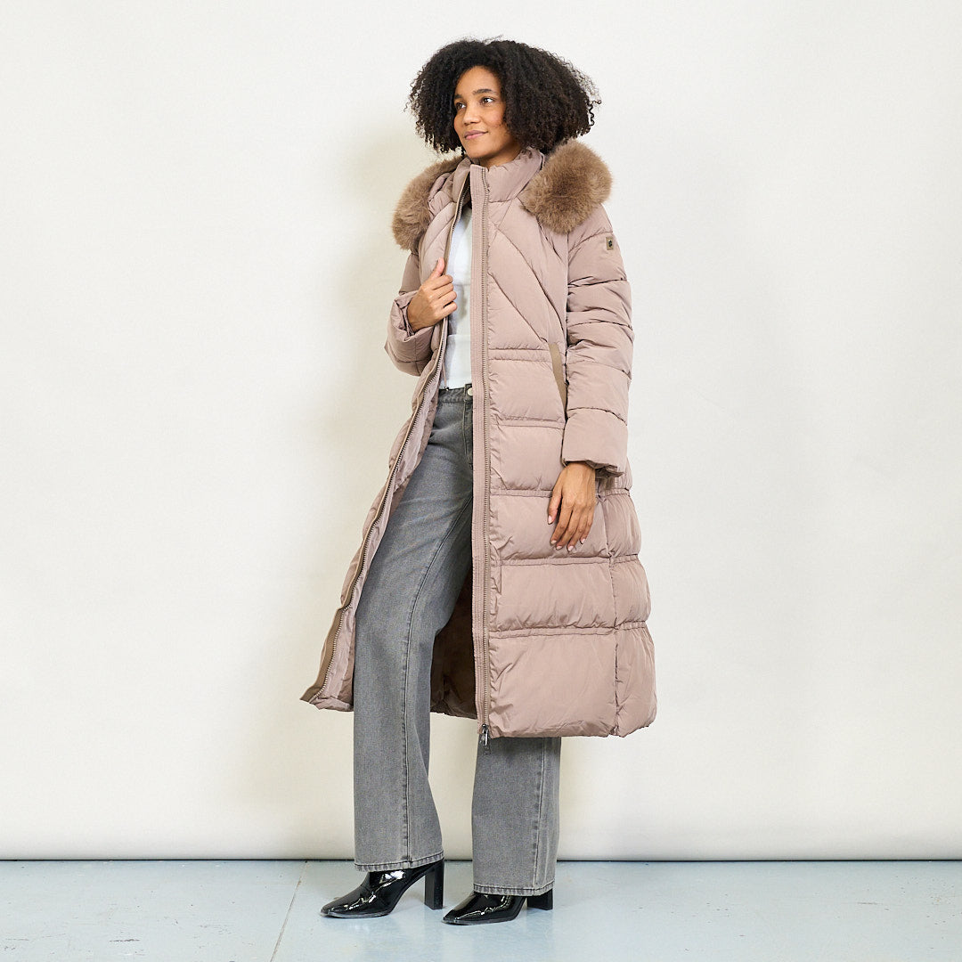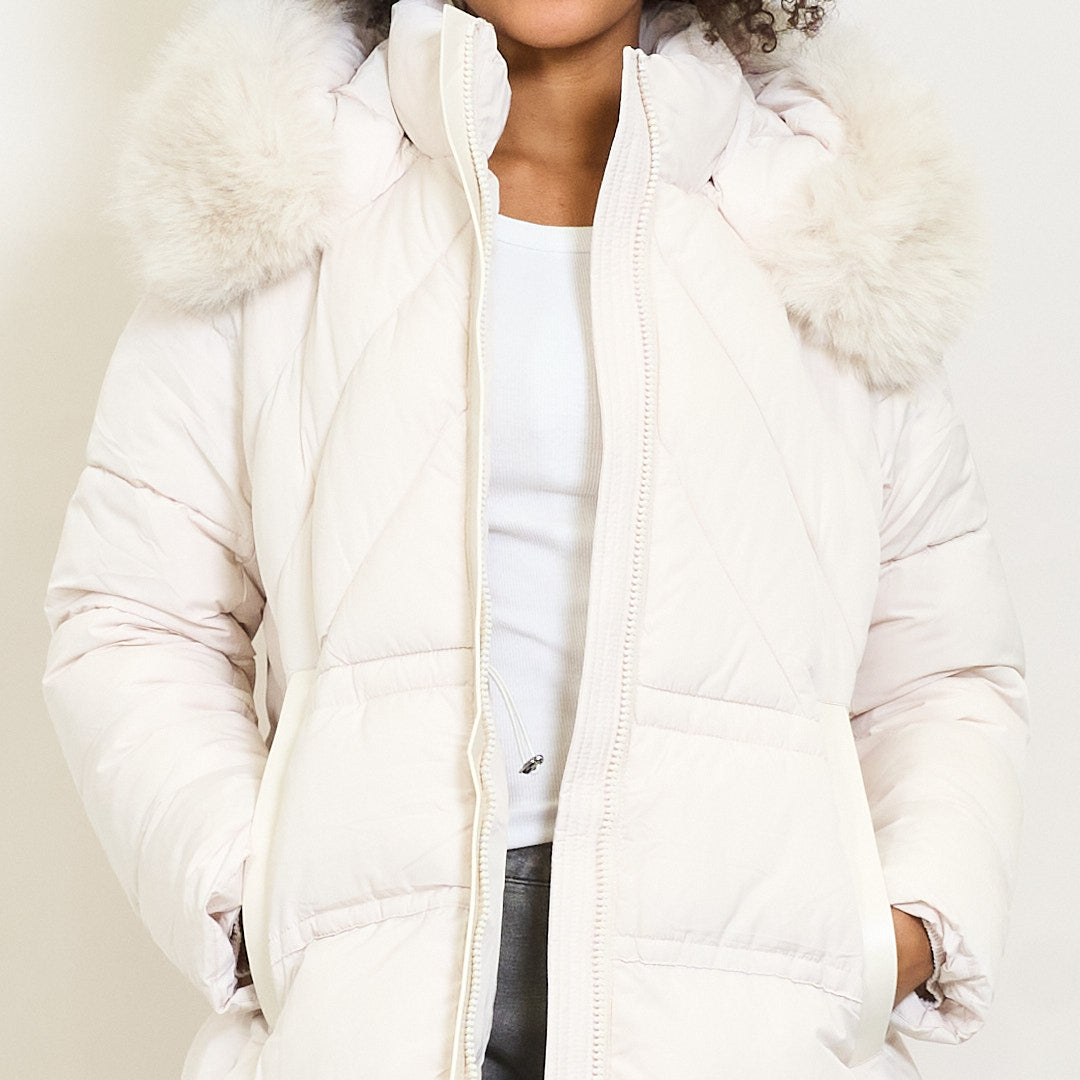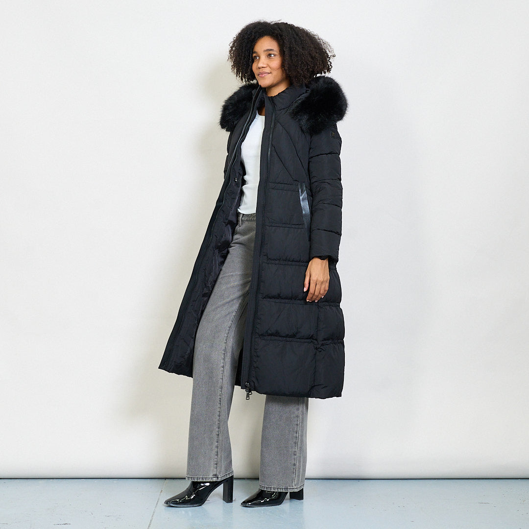 Cappotto imbottito trapuntato lungo con cappuccio in finta pelliccia e cucitura a V-panel all'ingrosso