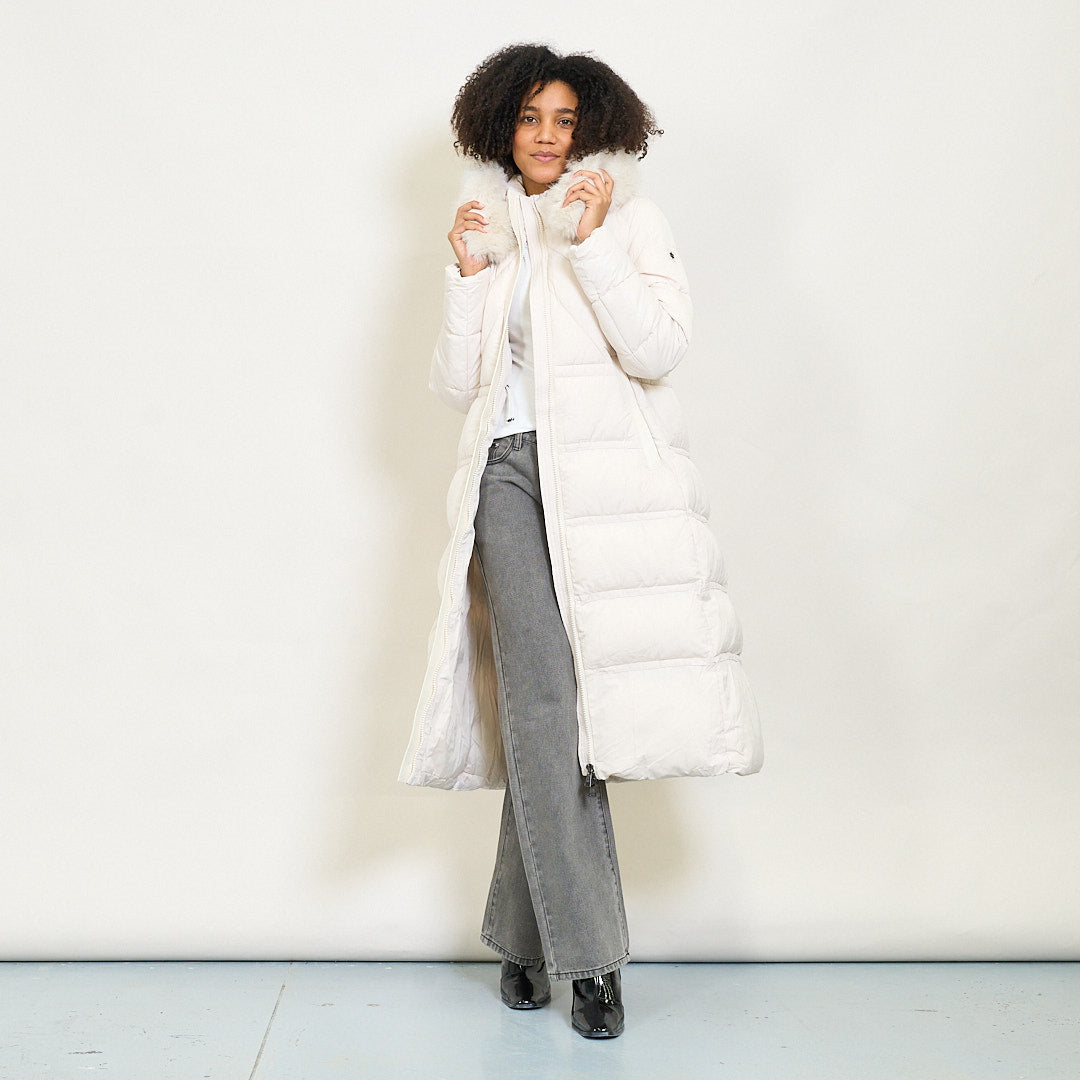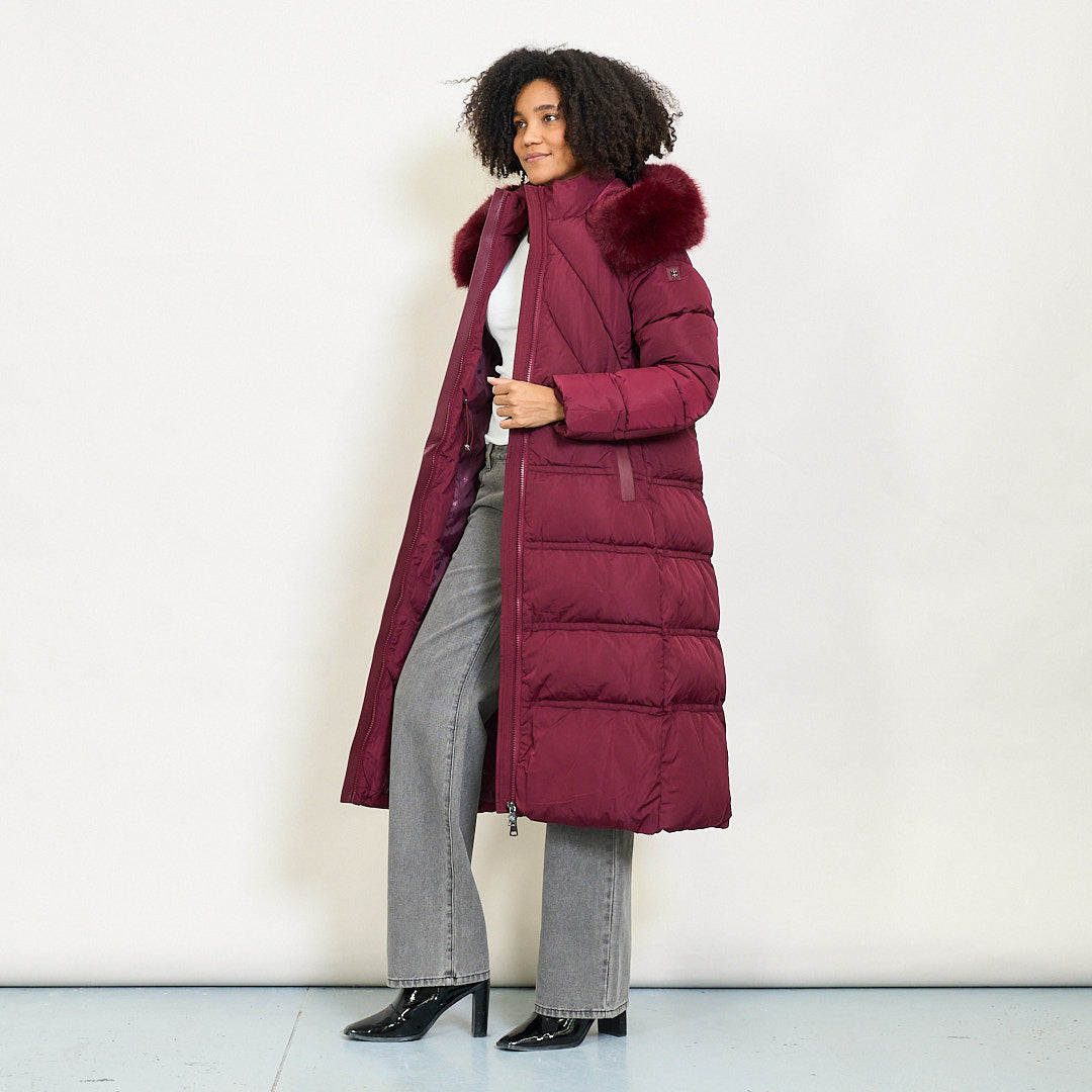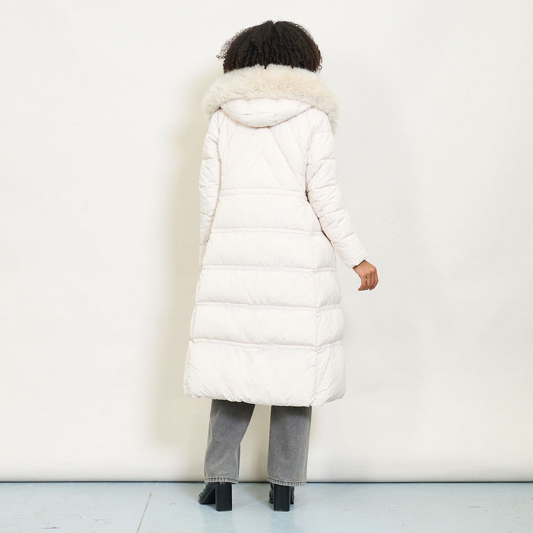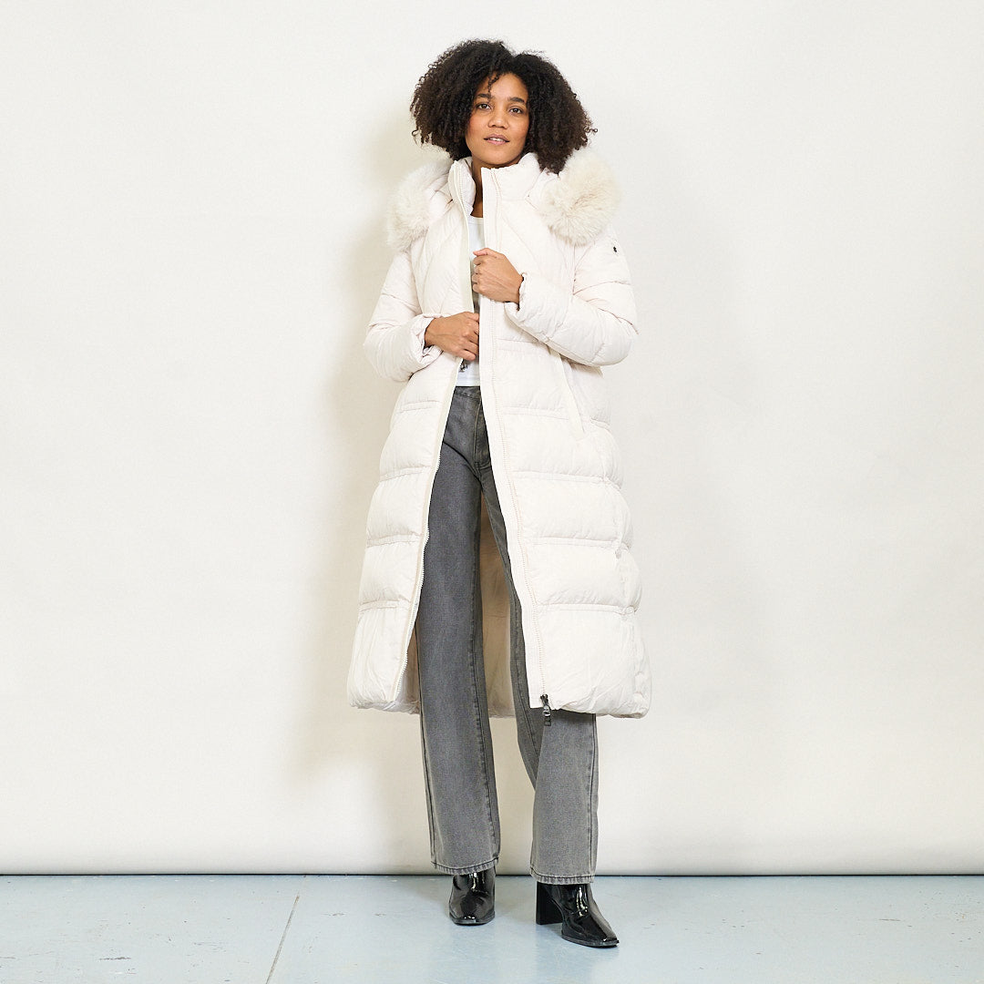 Cappotto imbottito trapuntato lungo con cappuccio in finta pelliccia e cucitura a V-panel all'ingrosso