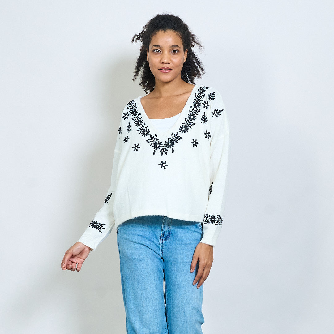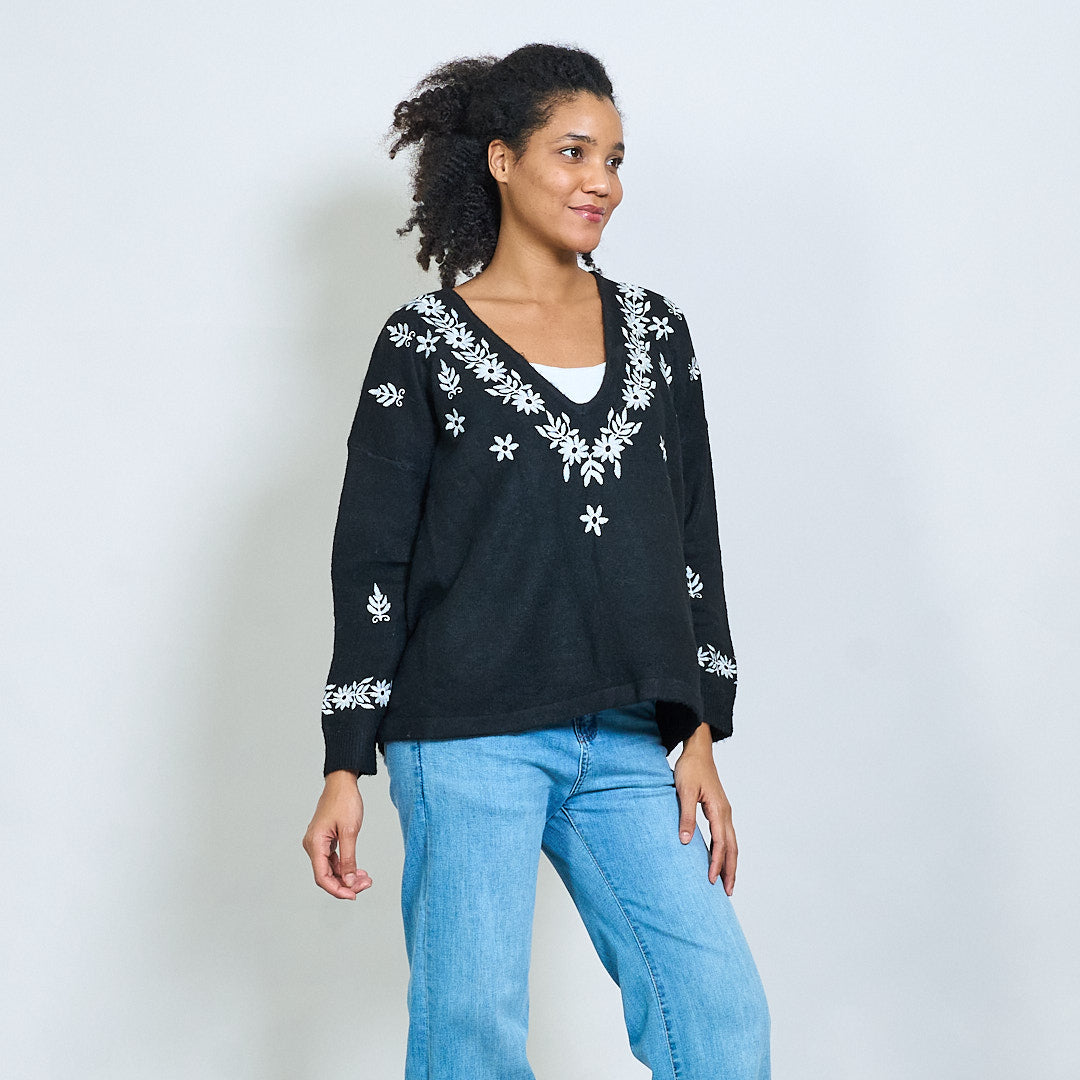 Maglione ricamato a maglia a V floreale all'ingrosso