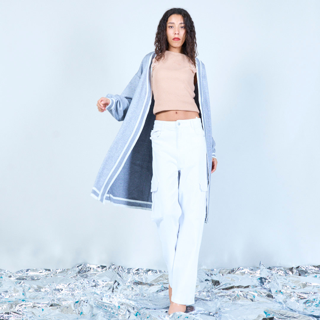 - Dettagli di rifinitura a contrasto su colletto, orlo e polsini