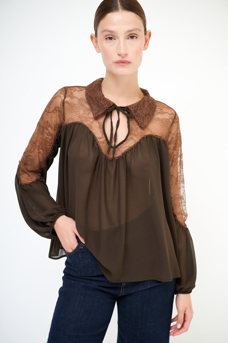 Sheer Lace Yoke Colled Wasleve Chiffon Bloge Wholesale Wholesale