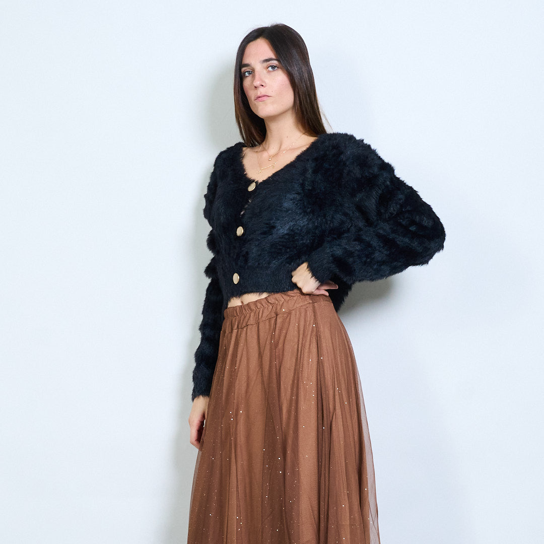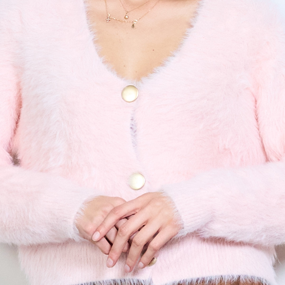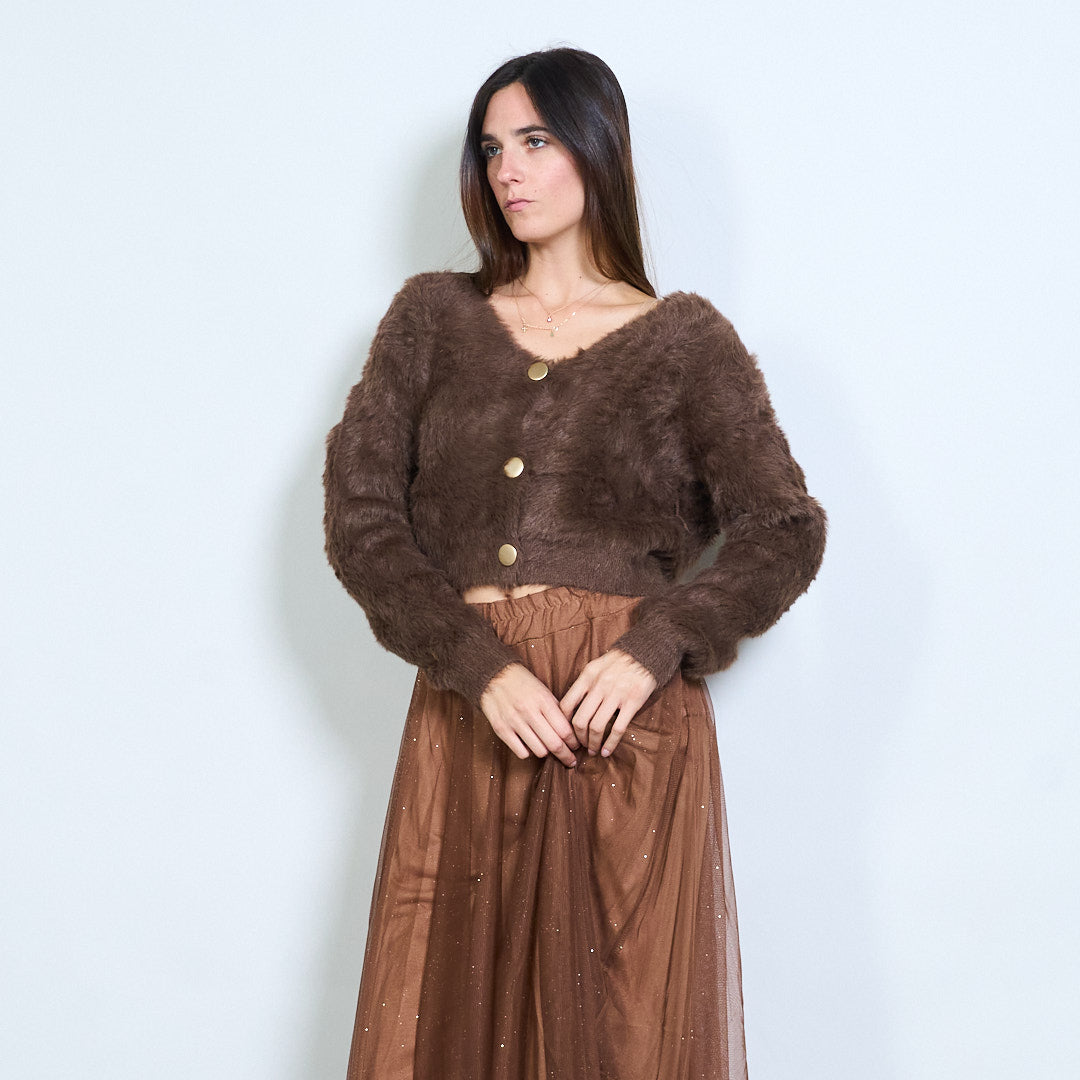 Vendita all'ingrosso di cardigan corto peloso con bottoni morbidi al tatto sul davanti