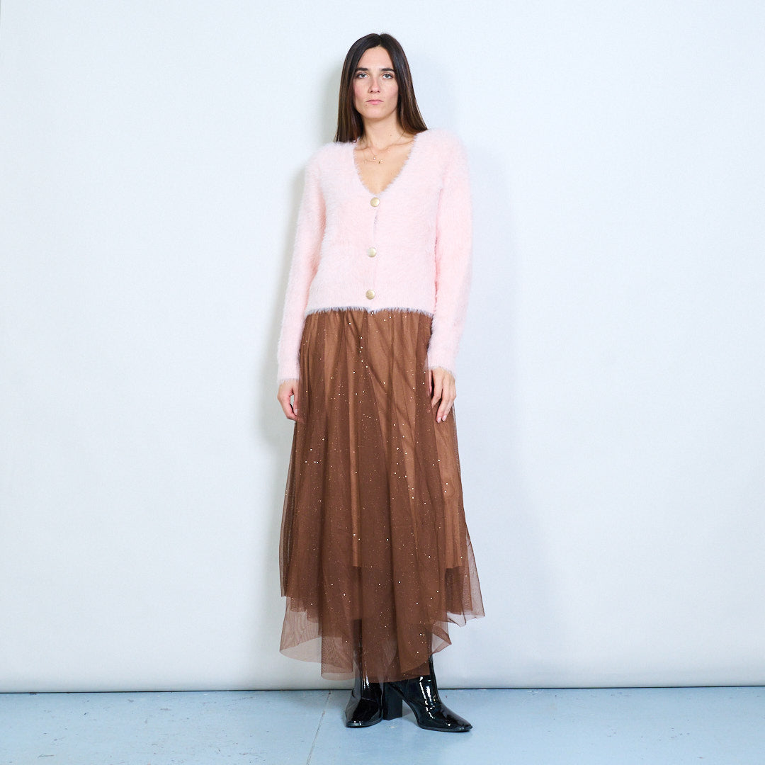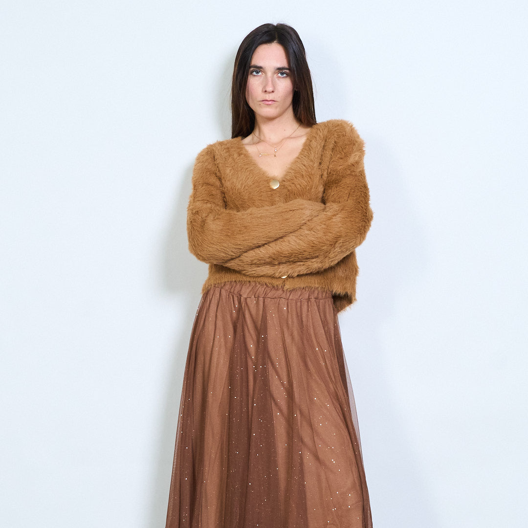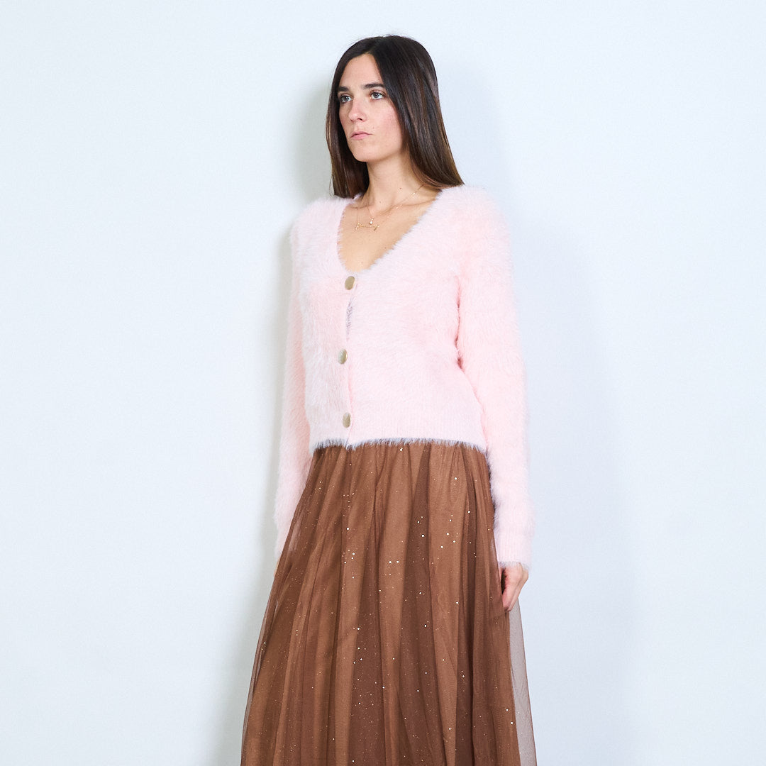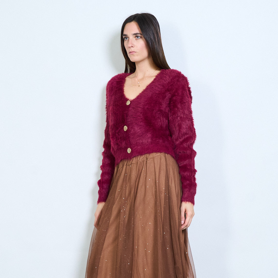 Vendita all'ingrosso di cardigan corto peloso con bottoni morbidi al tatto sul davanti