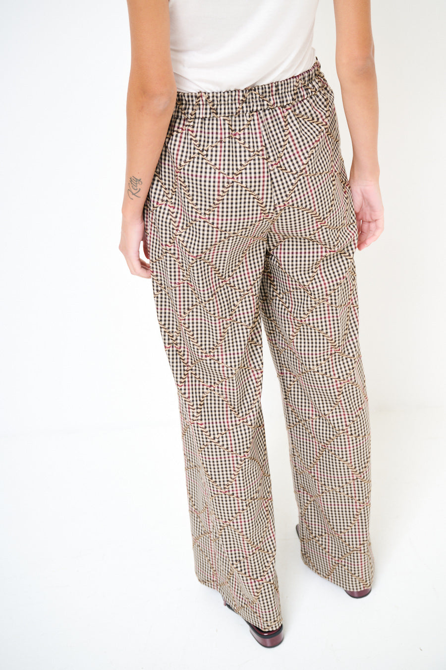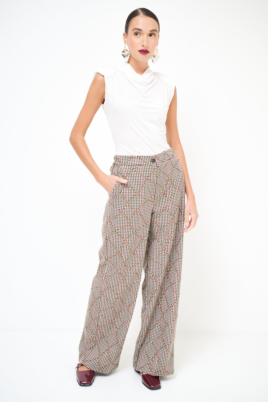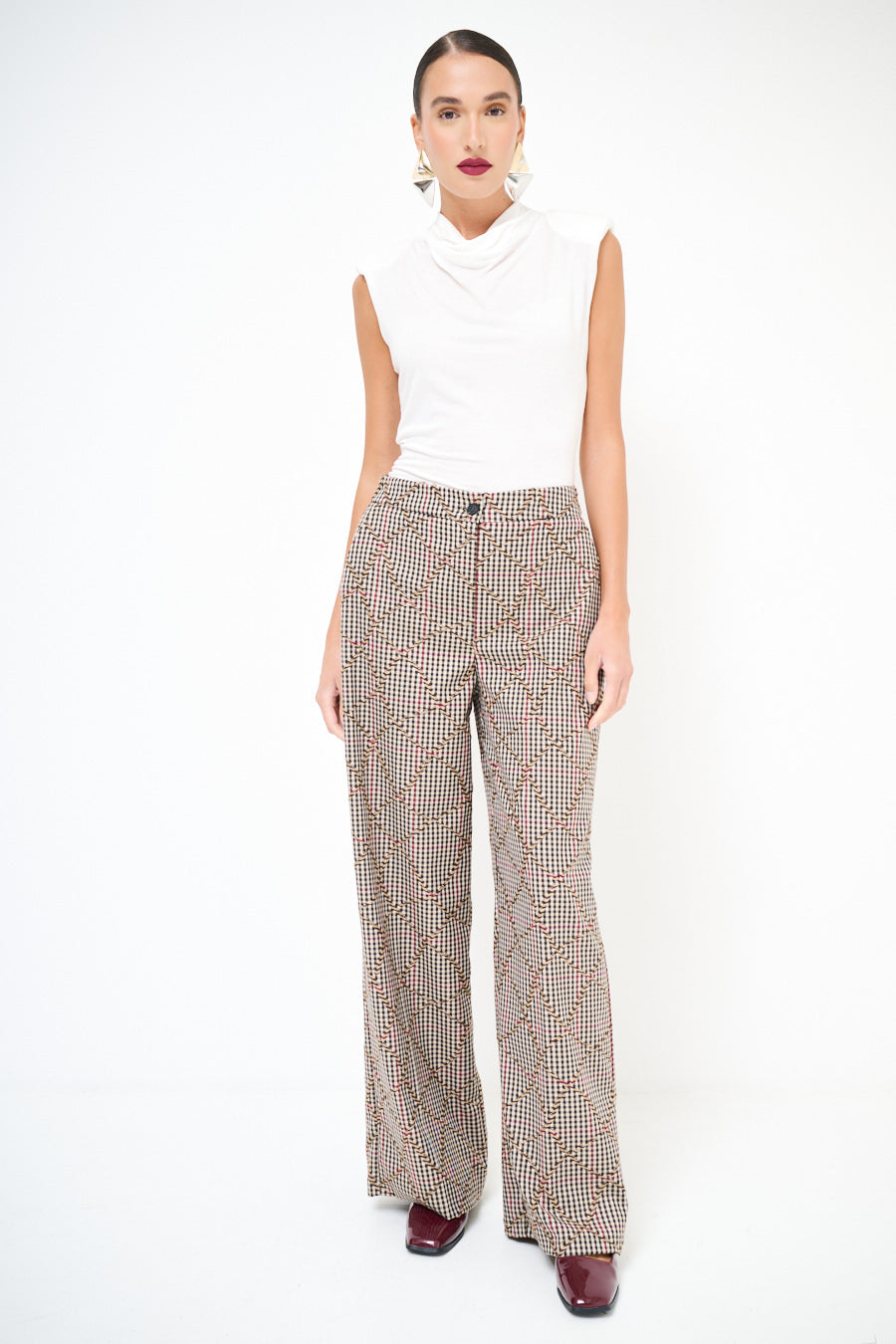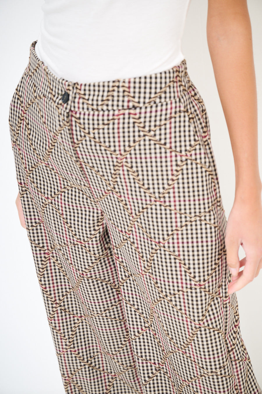 Pantaloni a scacchiera a gamba larga con effetto ricamato a zigzag all'ingrosso