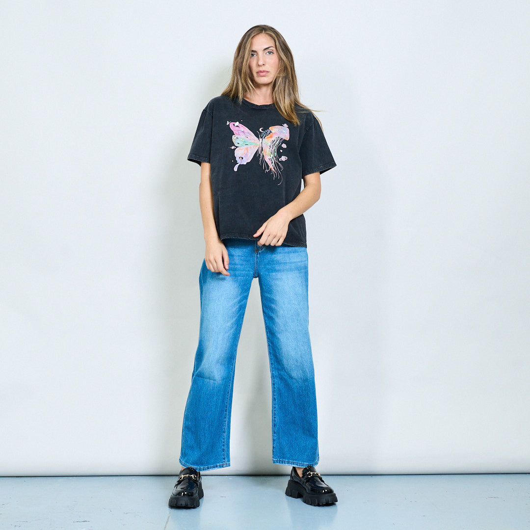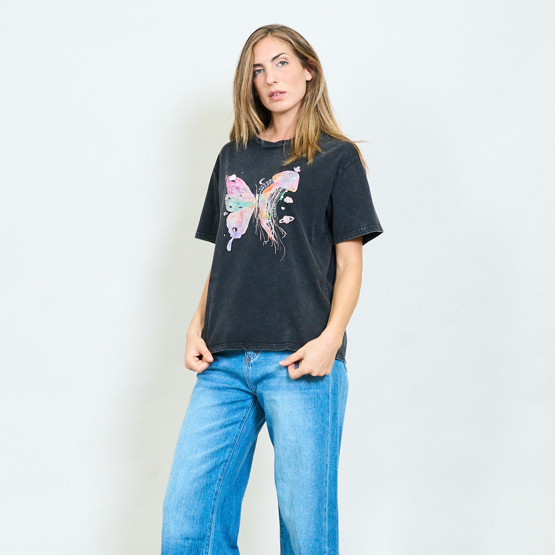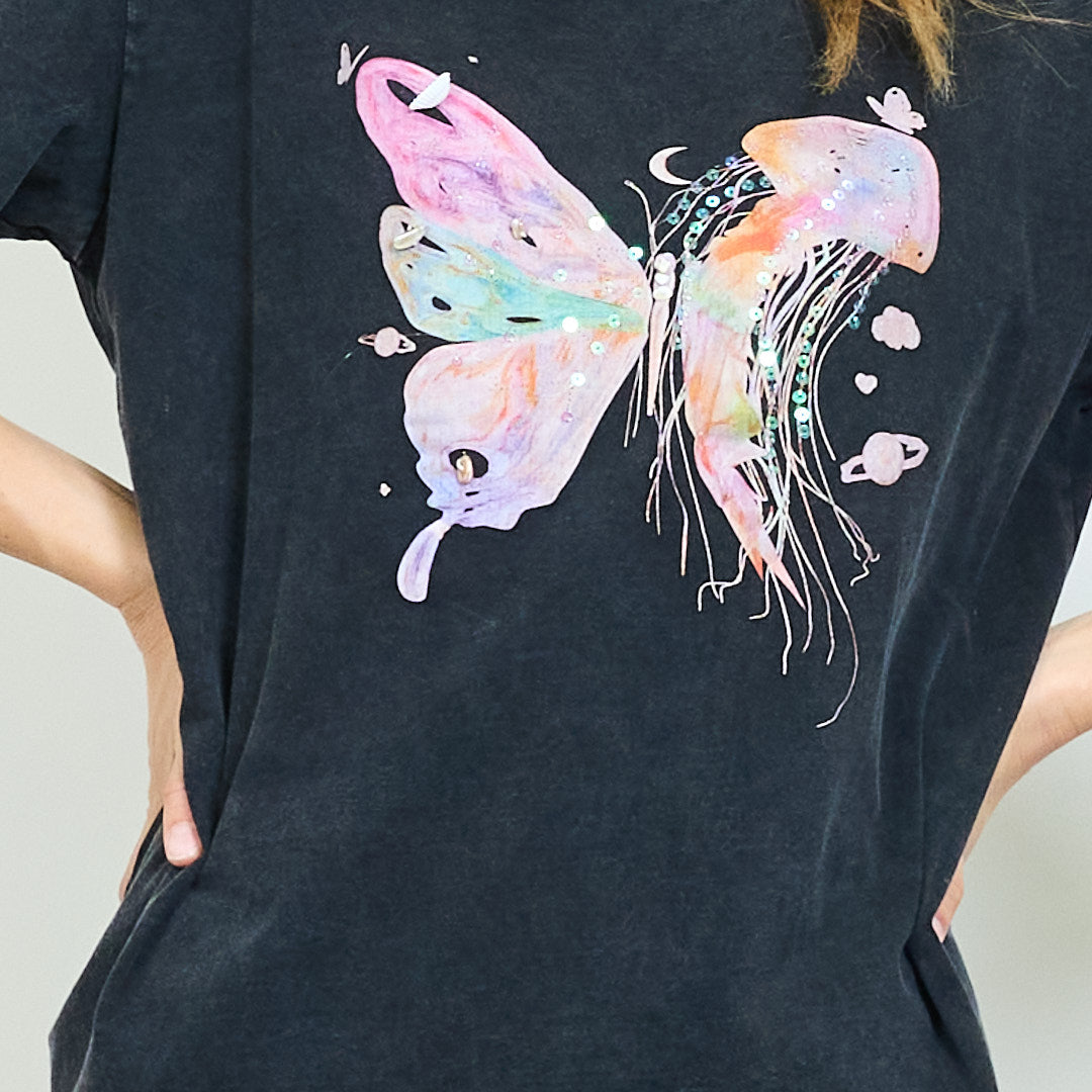 Akvarelės drugelių ir medūzų sintezės atspausdintos nuplauti marškinėliai didmeninė prekyba