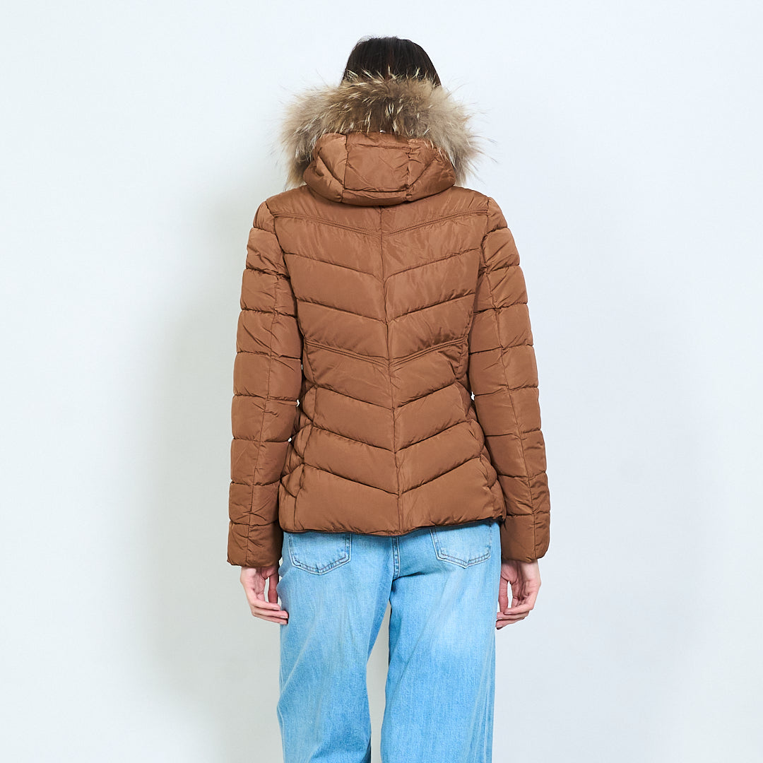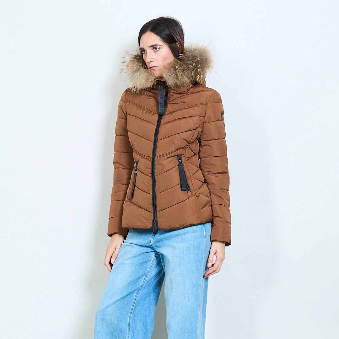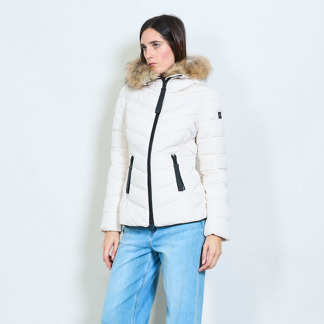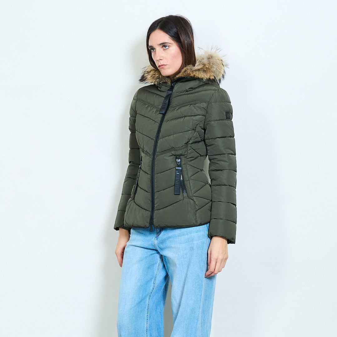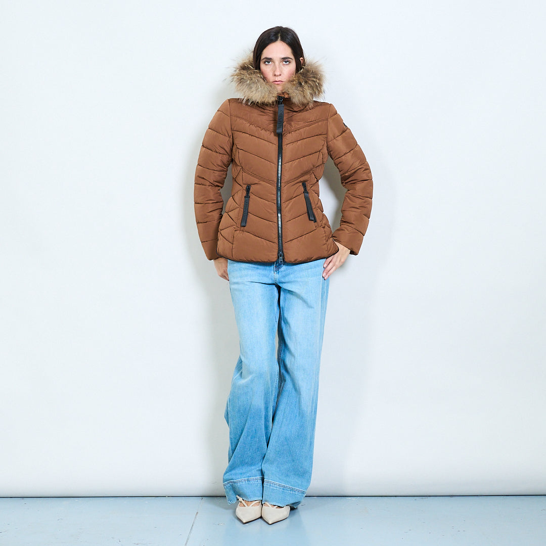 Dygsniuotas zip-up pulsinė striukė su dirbtinio kailio gaubtu detalė didmeninė prekyba