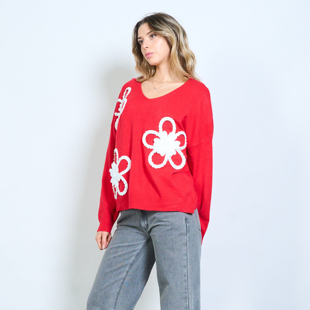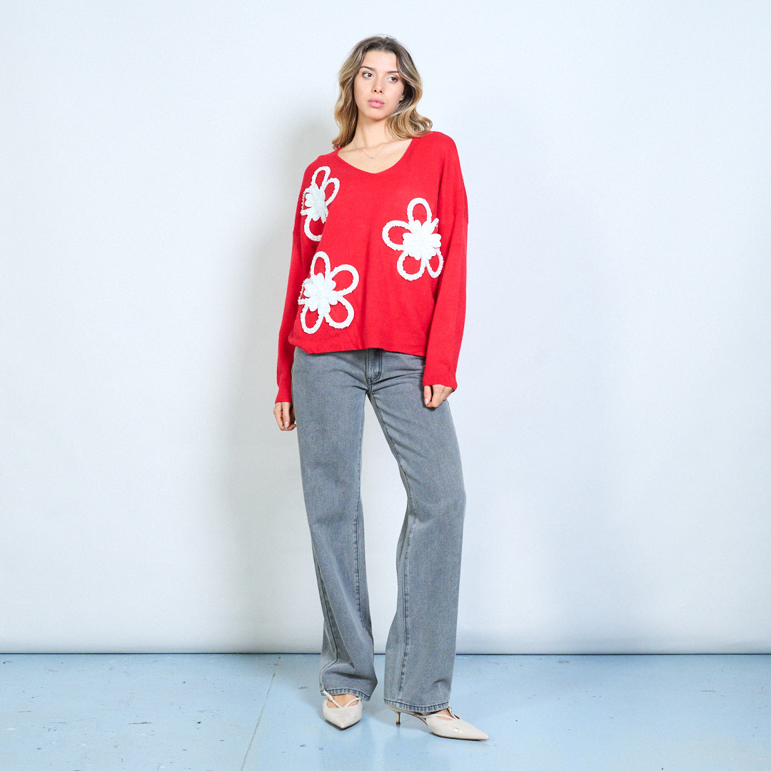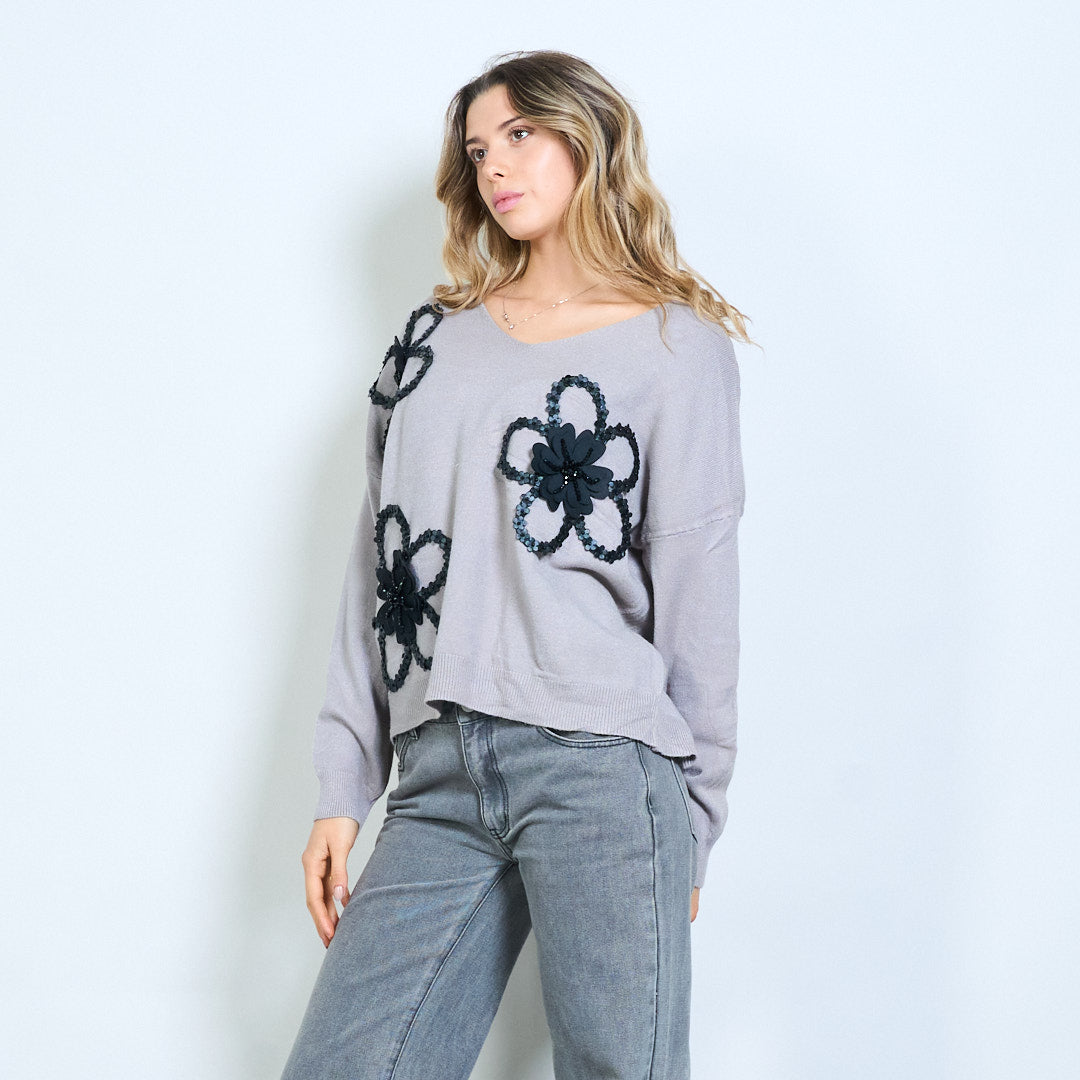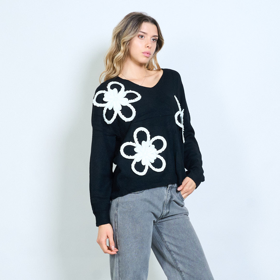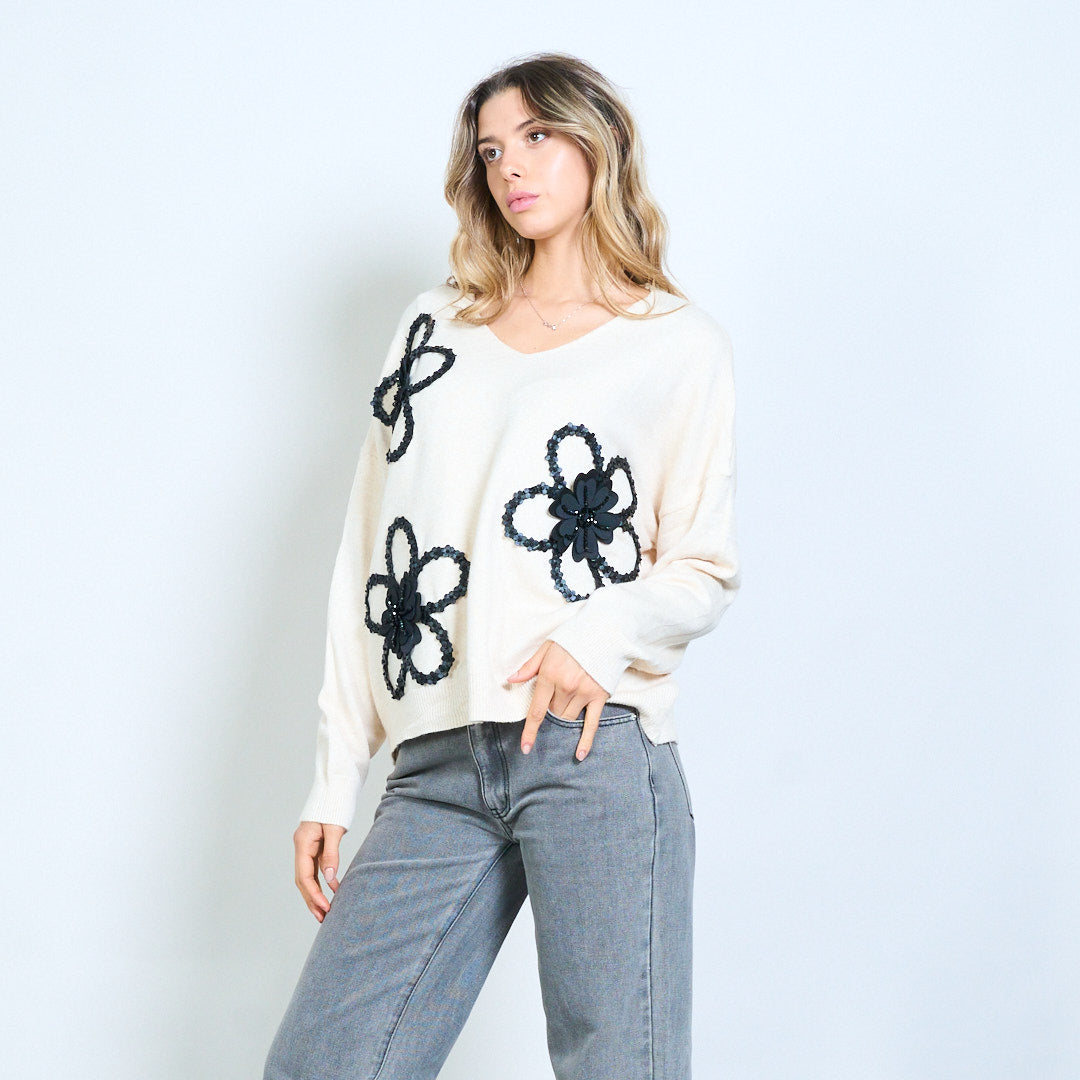 - V kaklo megztinis, patobulintas paryškintais 3D gėlių aplikacijos dizainais