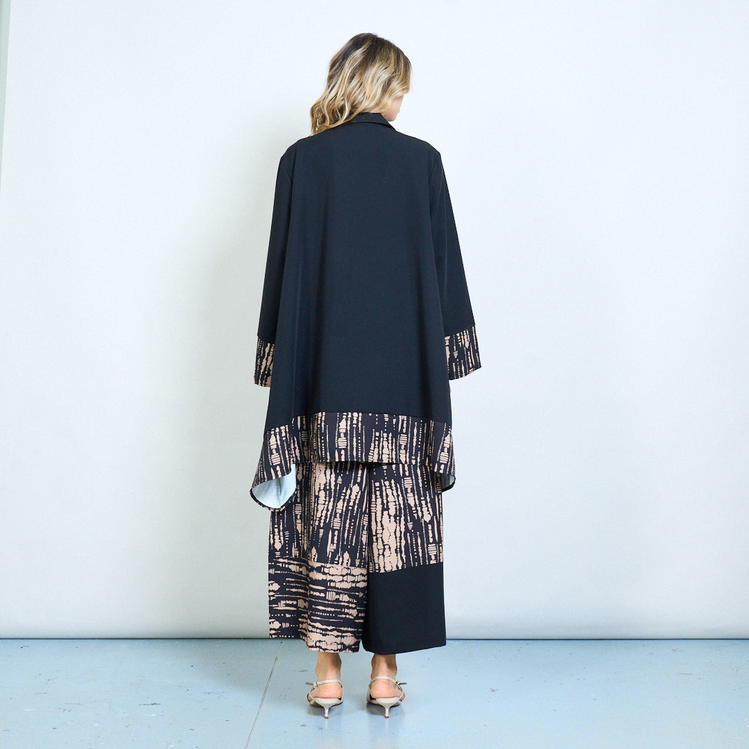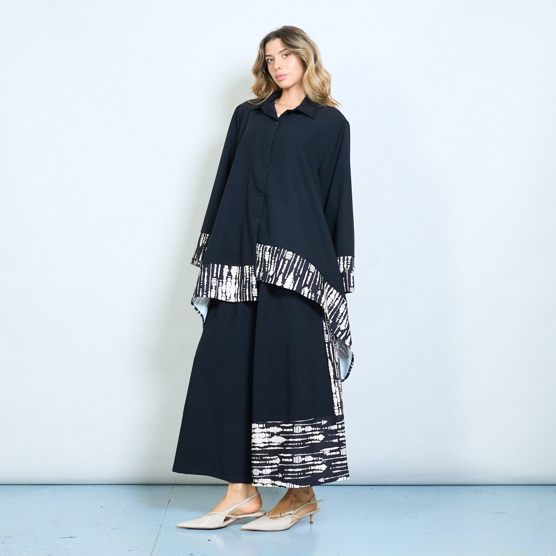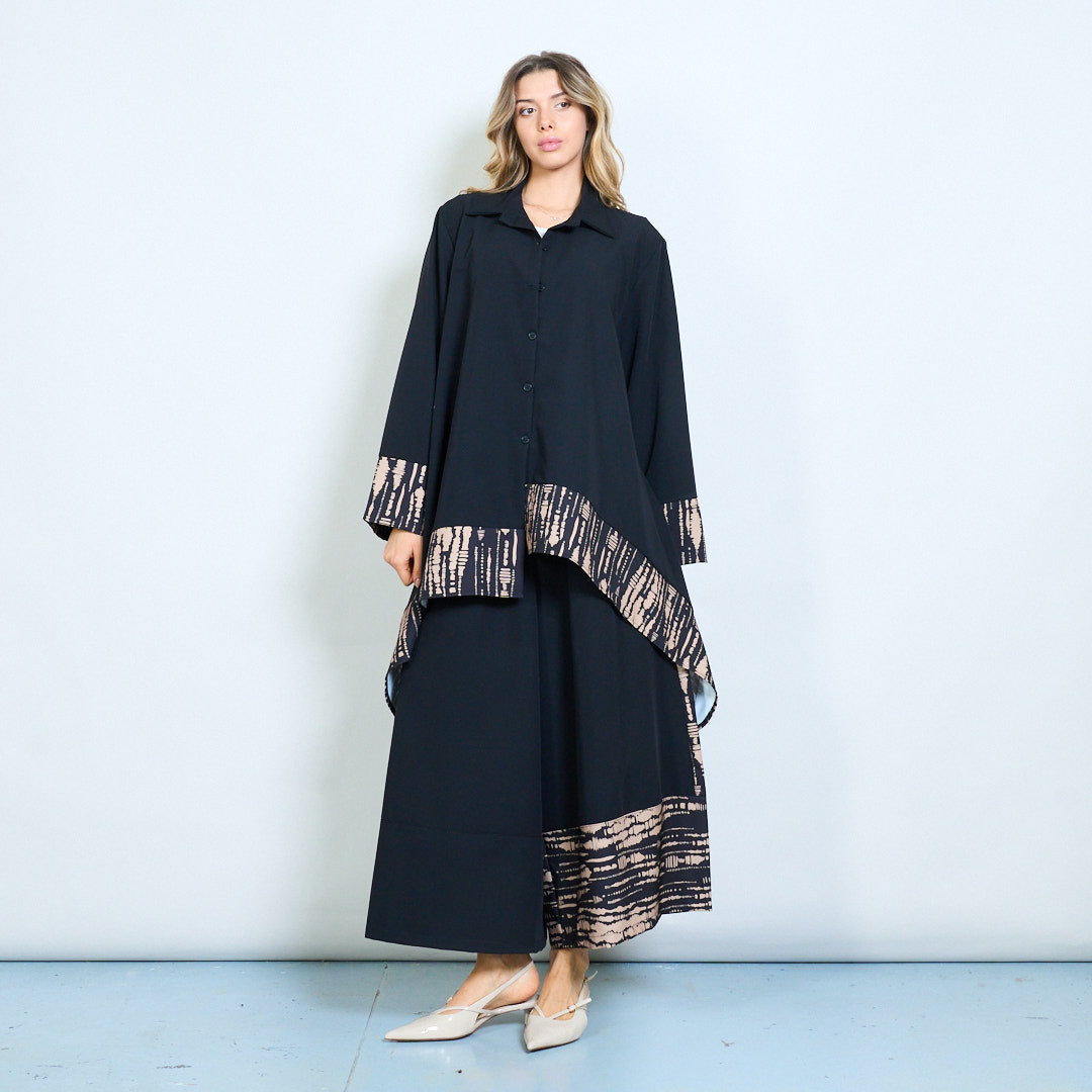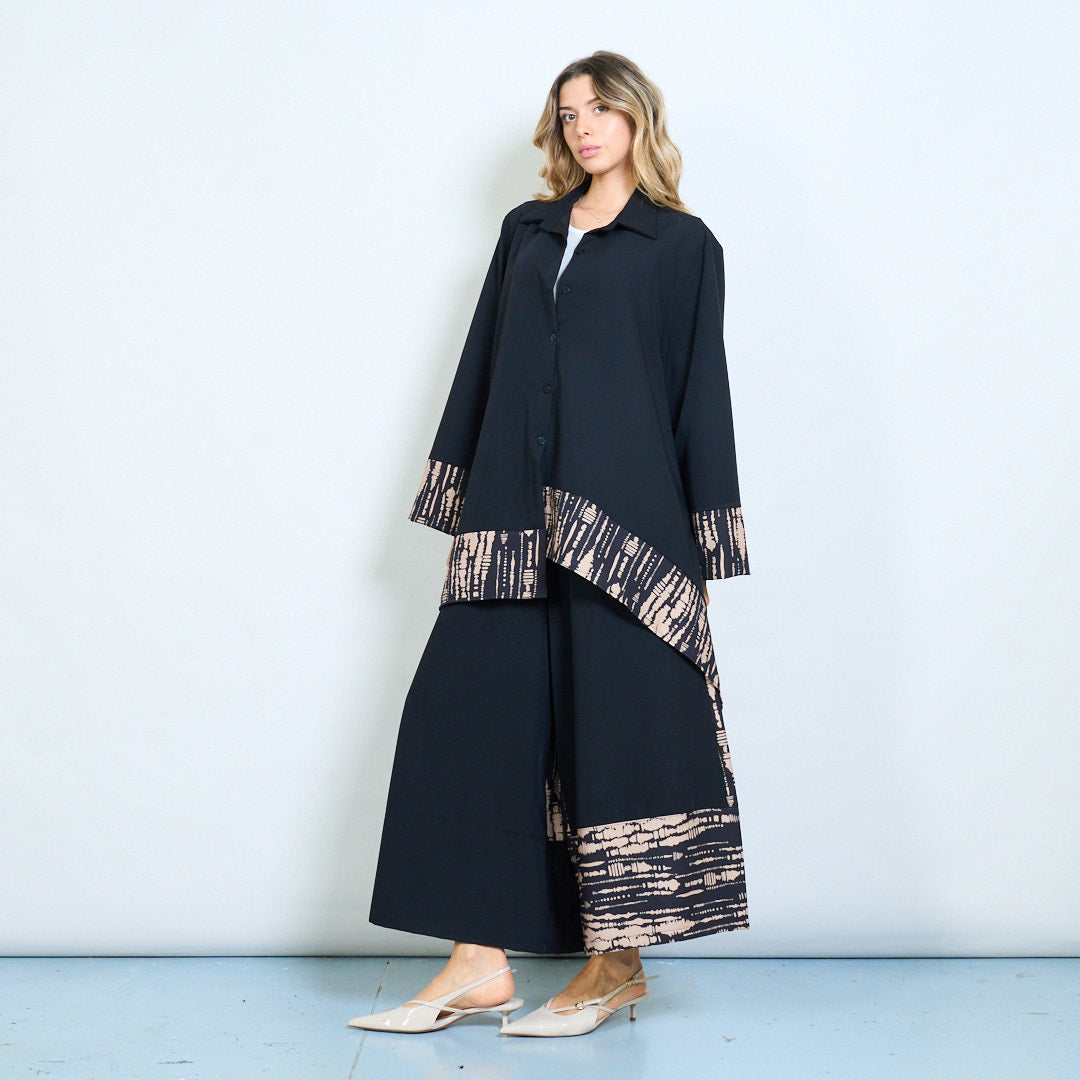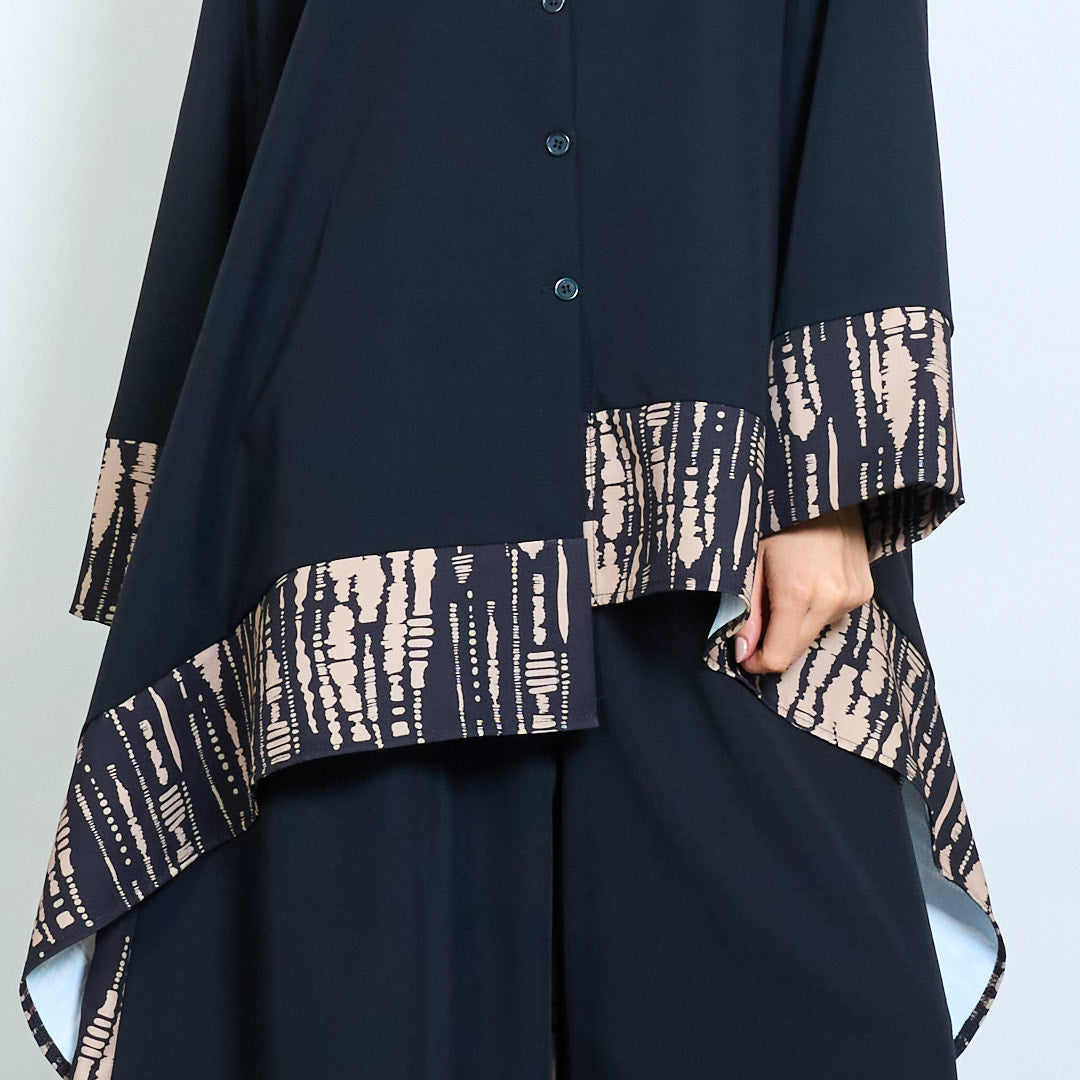 - Hemline ir rankovių rankogaliai, papuošti abstrakčiais genčių įkvėptais modeliais