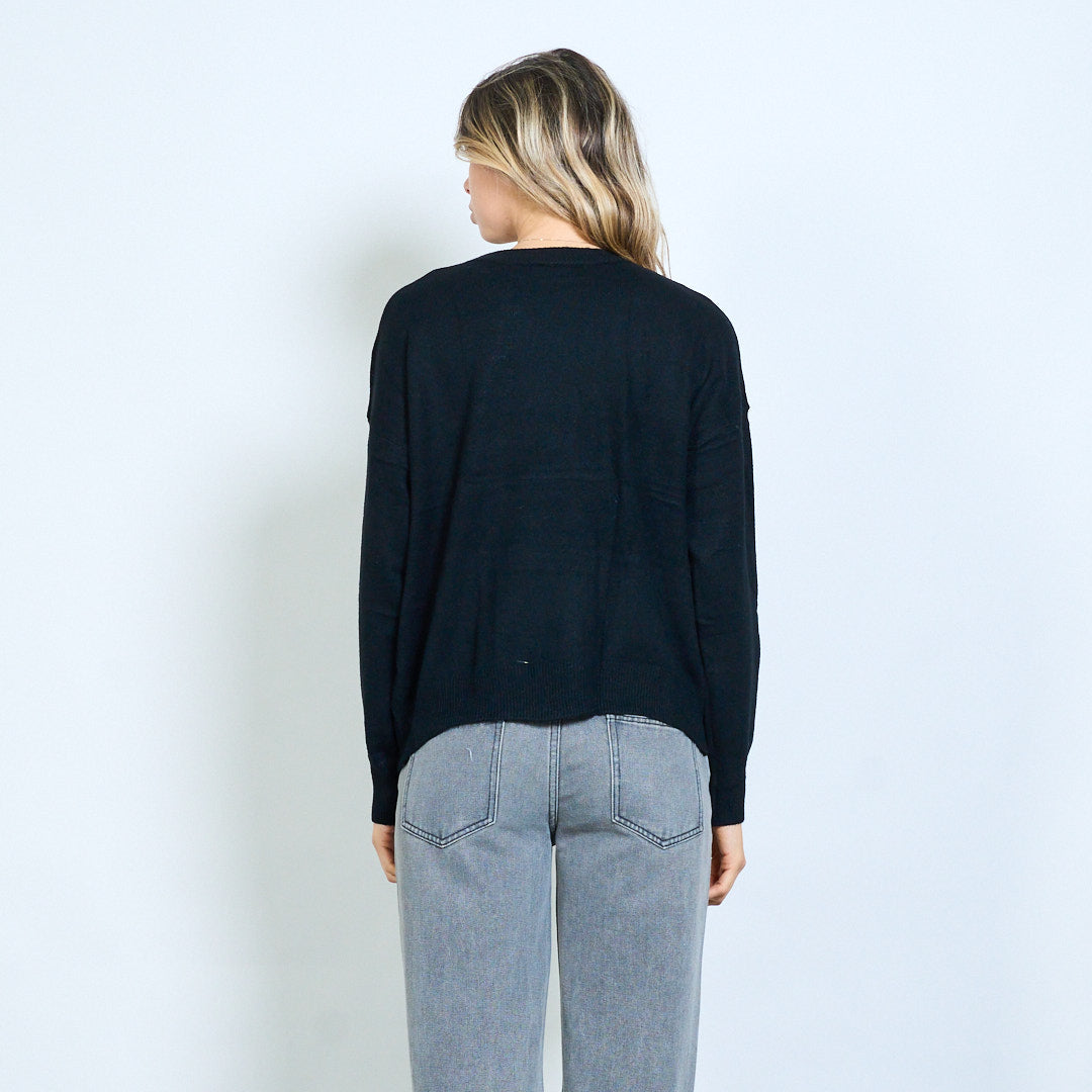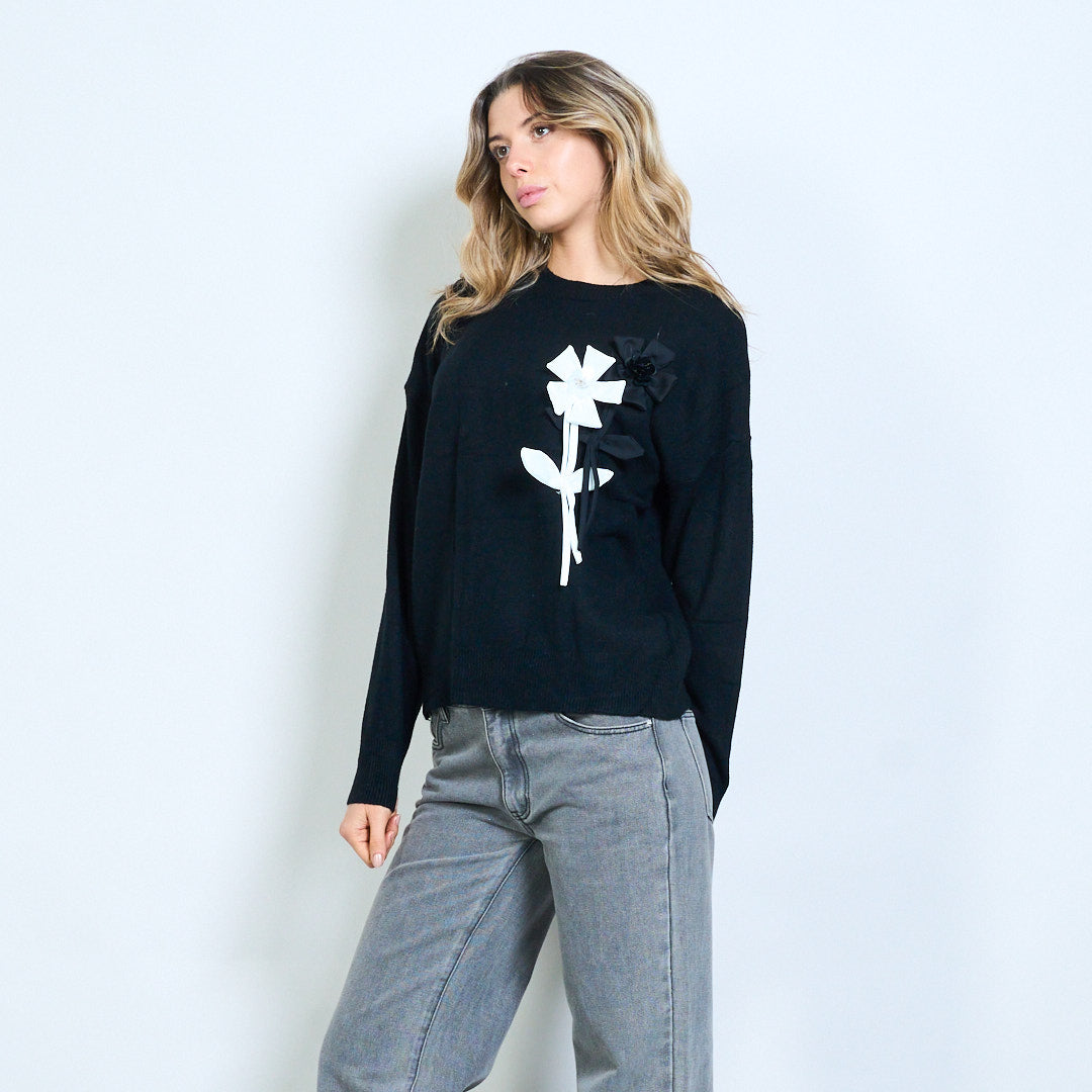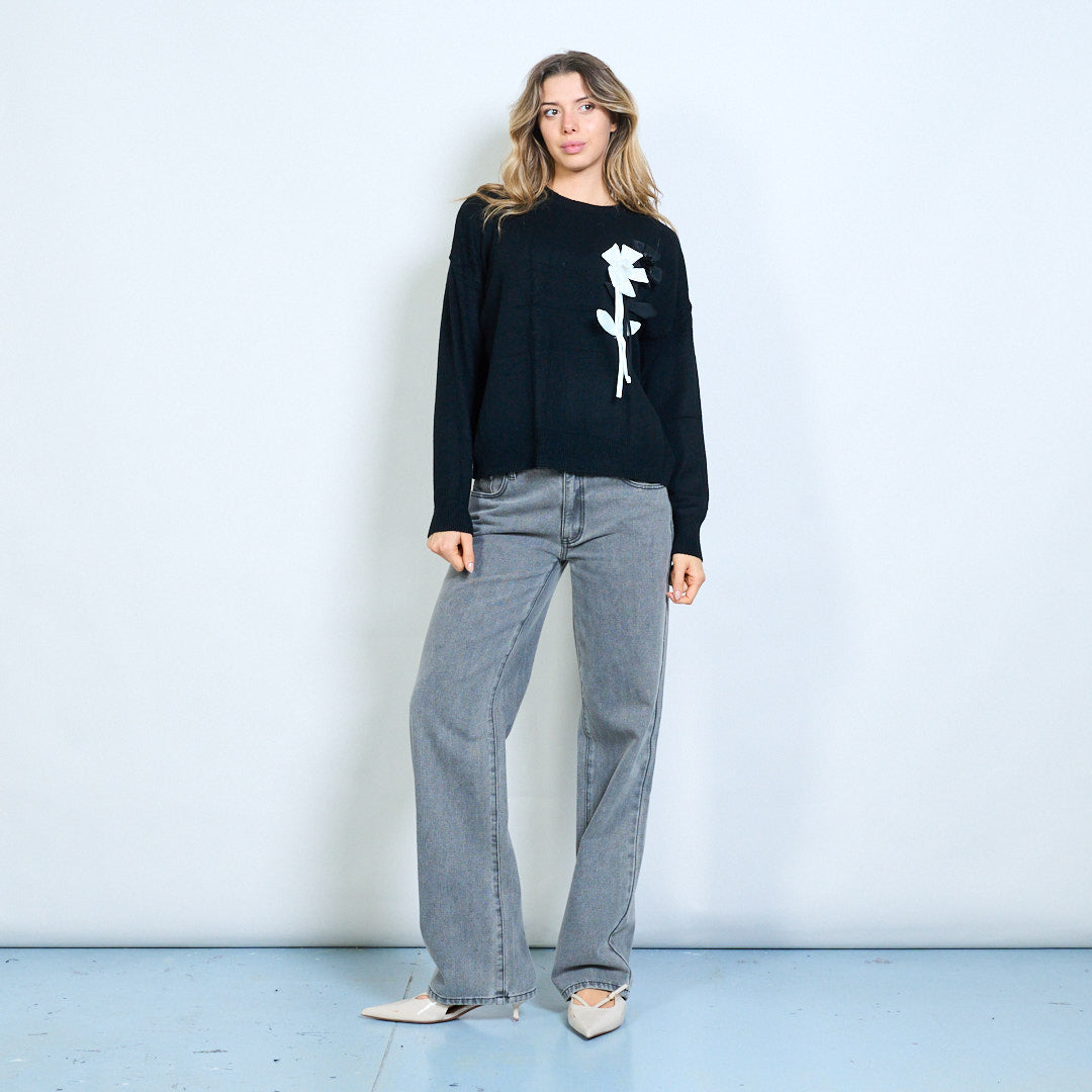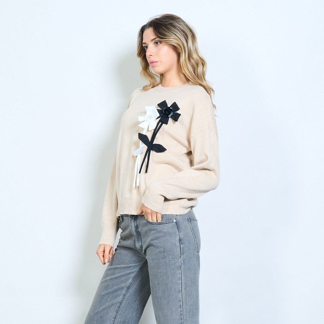 - Įgulos kaklo megztinis, akcentuotas su dideliais lanko aplikacijomis, kontrastingais tonais