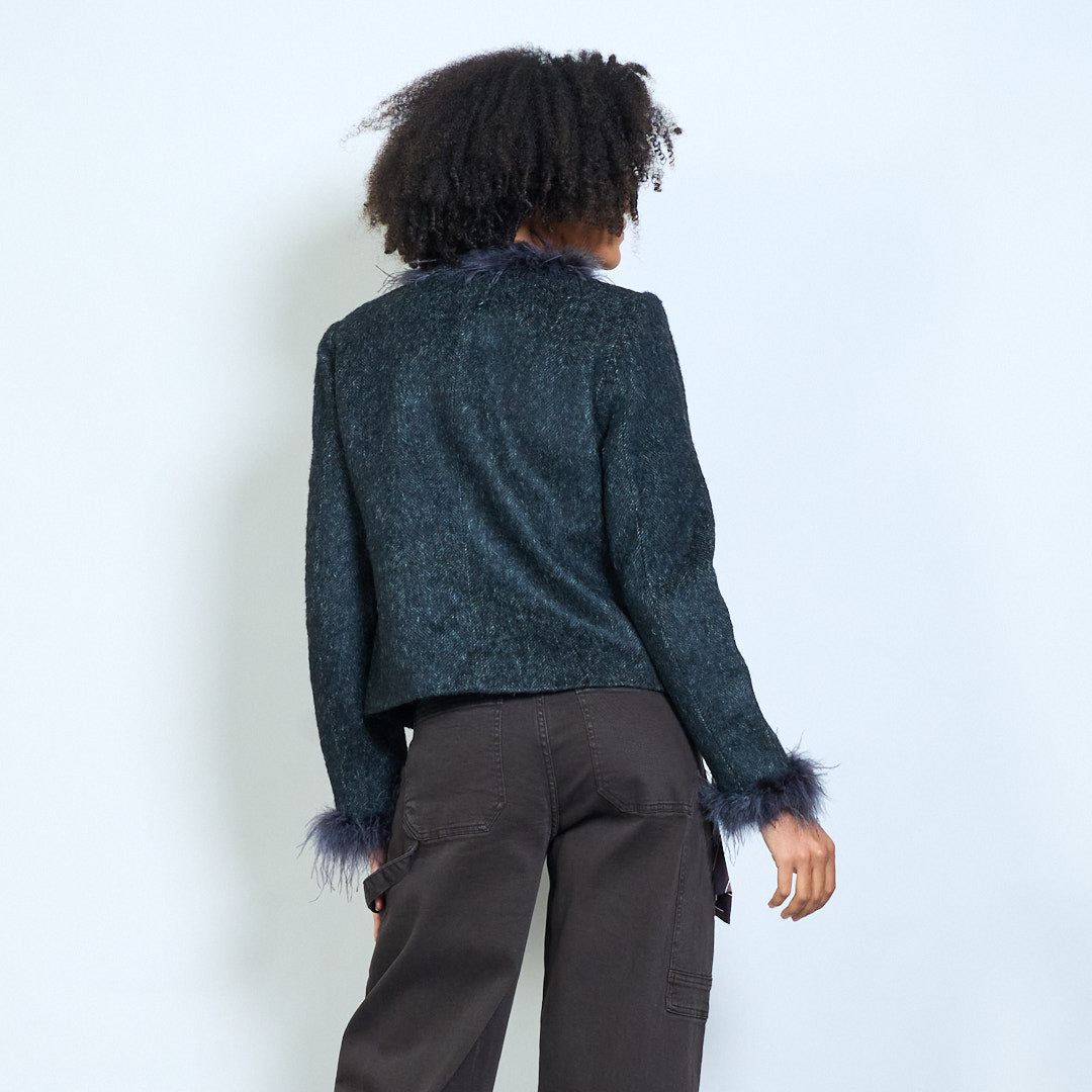 - Puoštas plunksnų apdaila išilgai apykaklės, rankogalių ir priekio, kad būtų prabangus