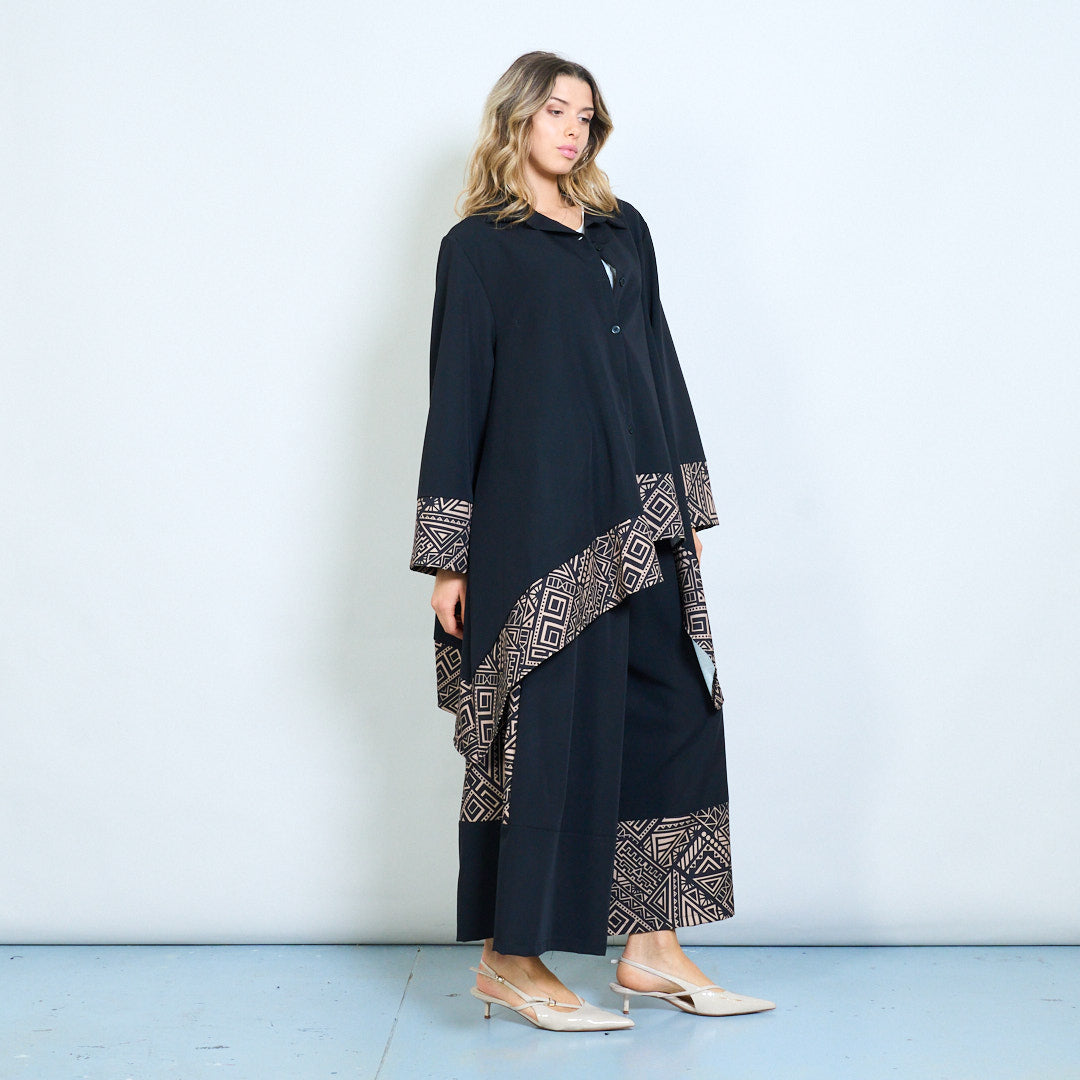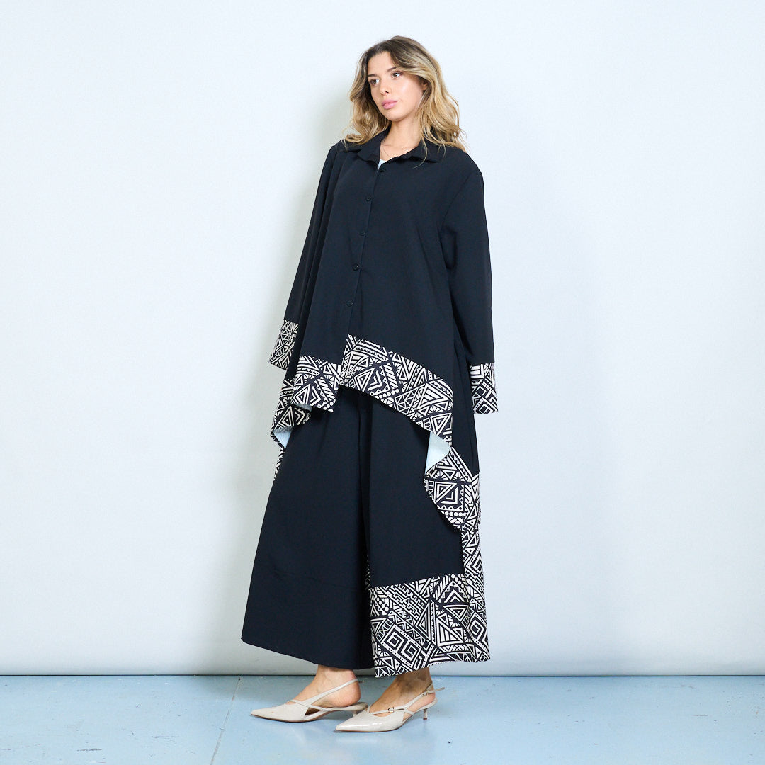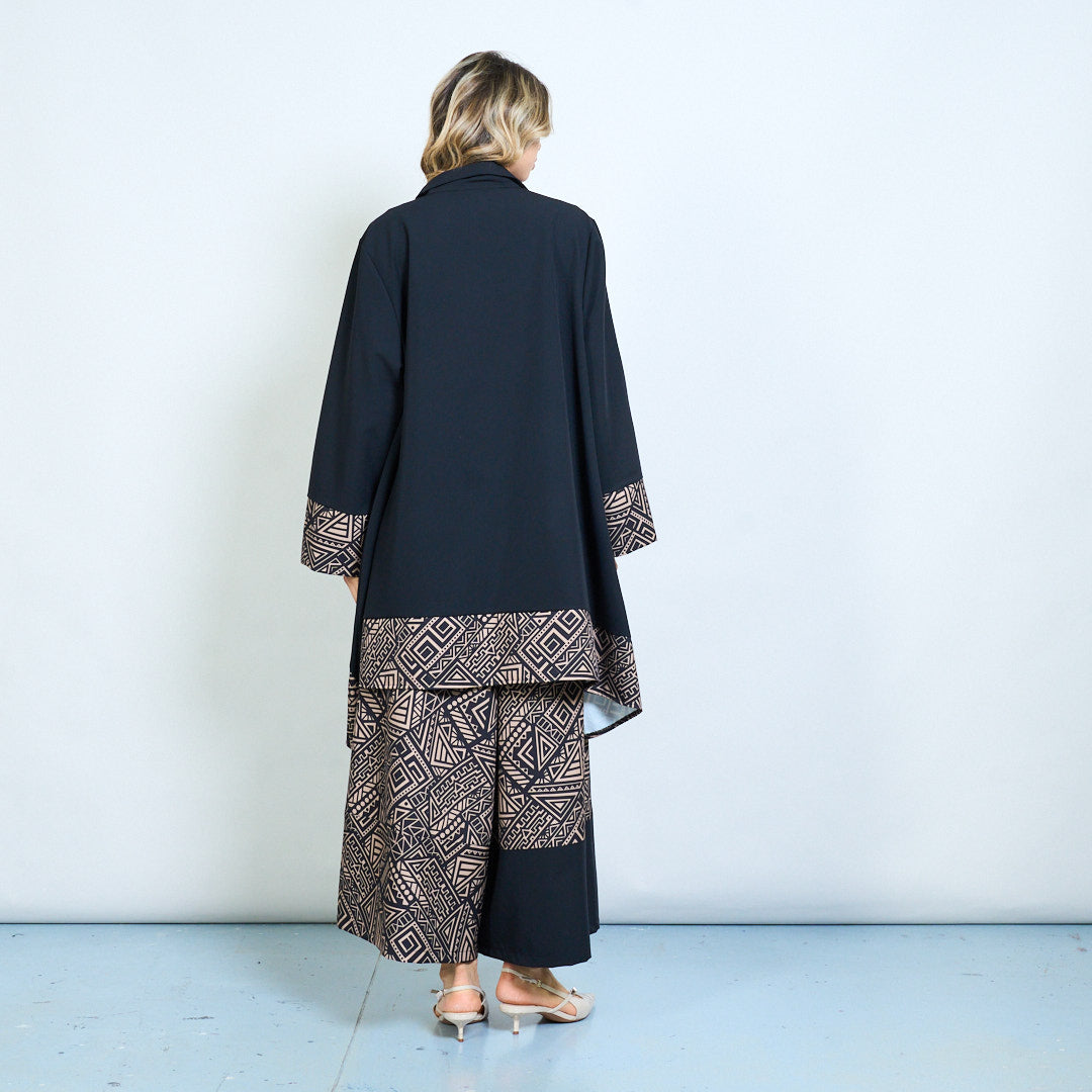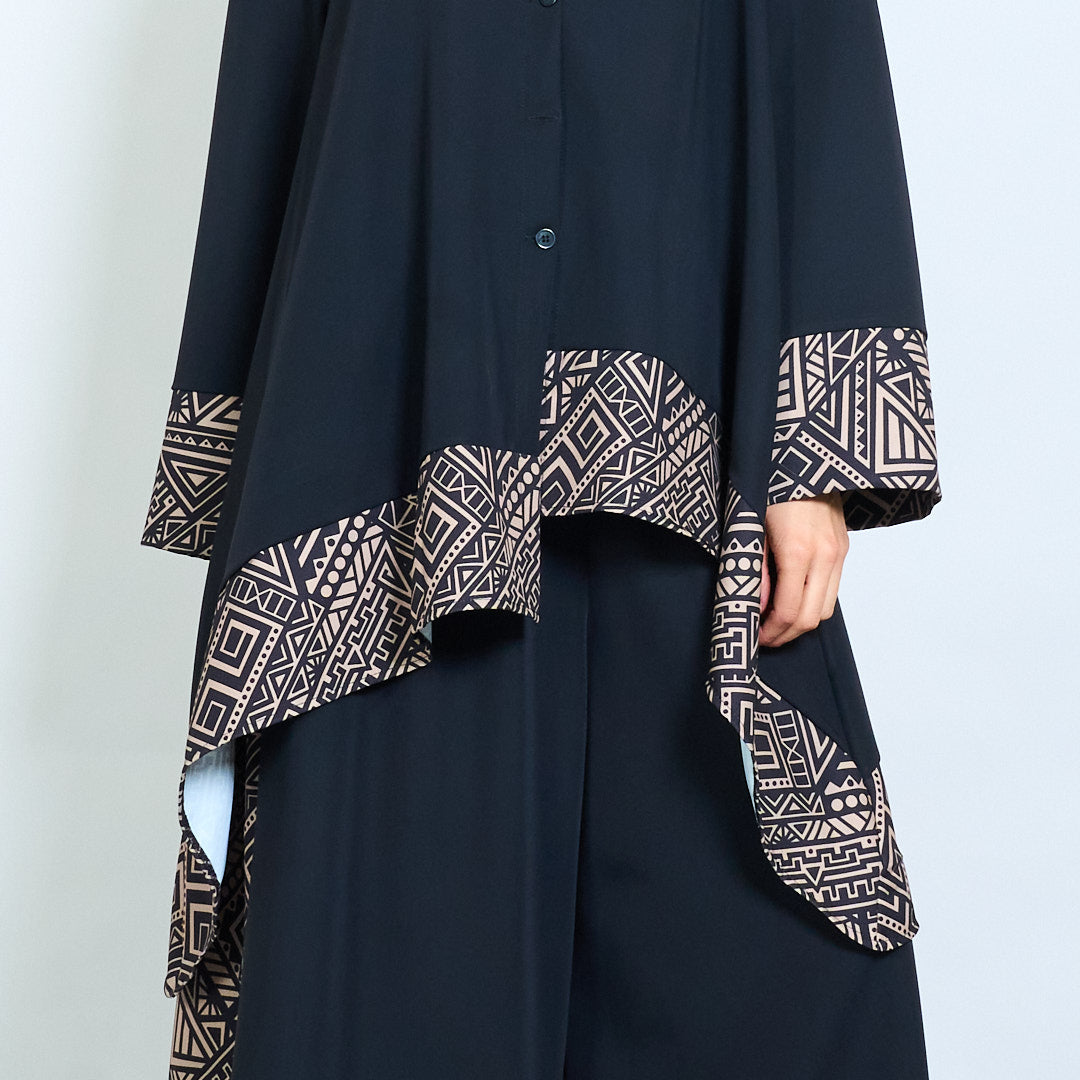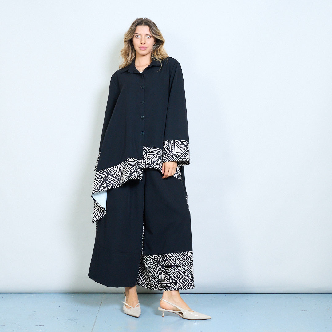 - Ryški geometrinė apdaila išilgai hemline ir rankogalių, kad būtų paryškintas kontrastas