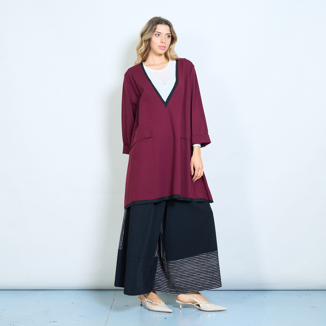Gilioji V formos kaklo kontrasto apdailos tunikos viršus su kišenės detale didmenine prekyba
