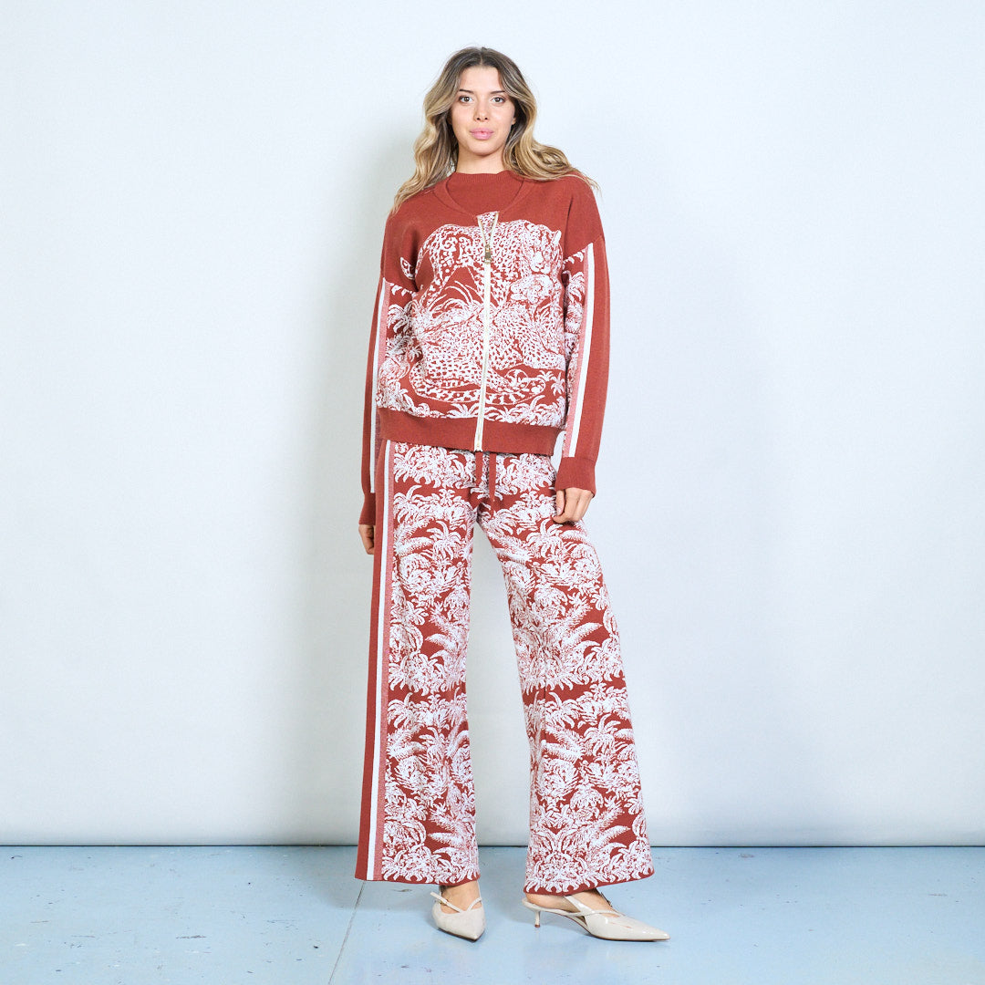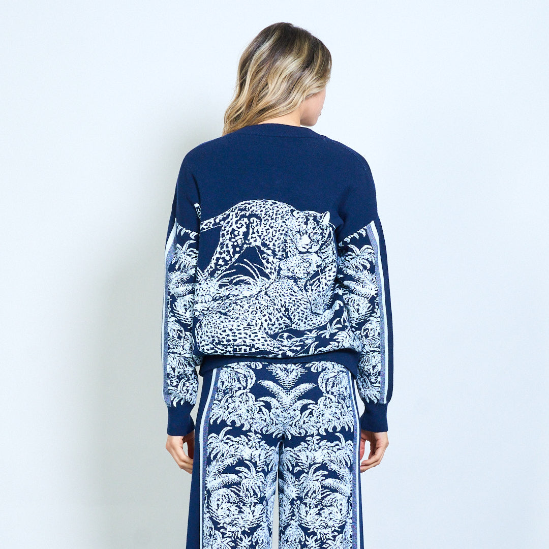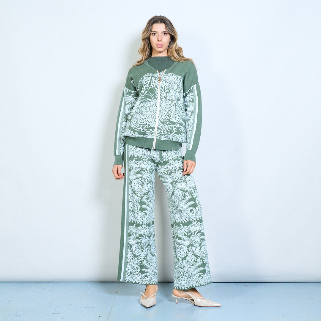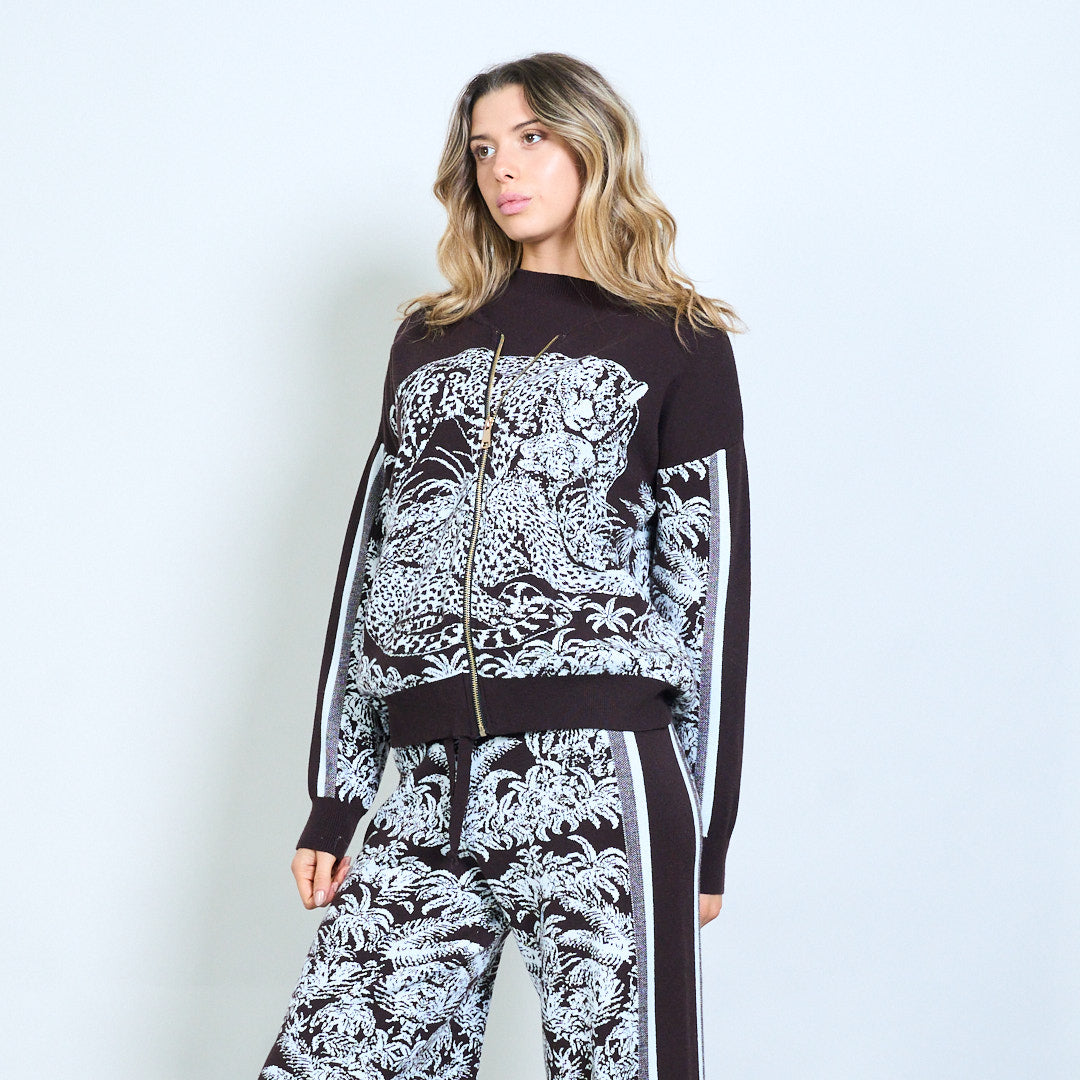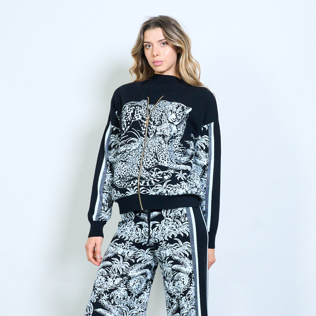 - Megztas megztinis, kuriame yra drąsus „Leopard Jungle“ grafikos dizainas
