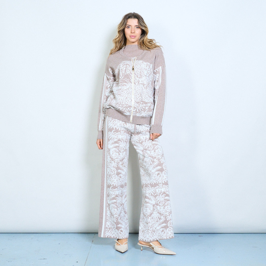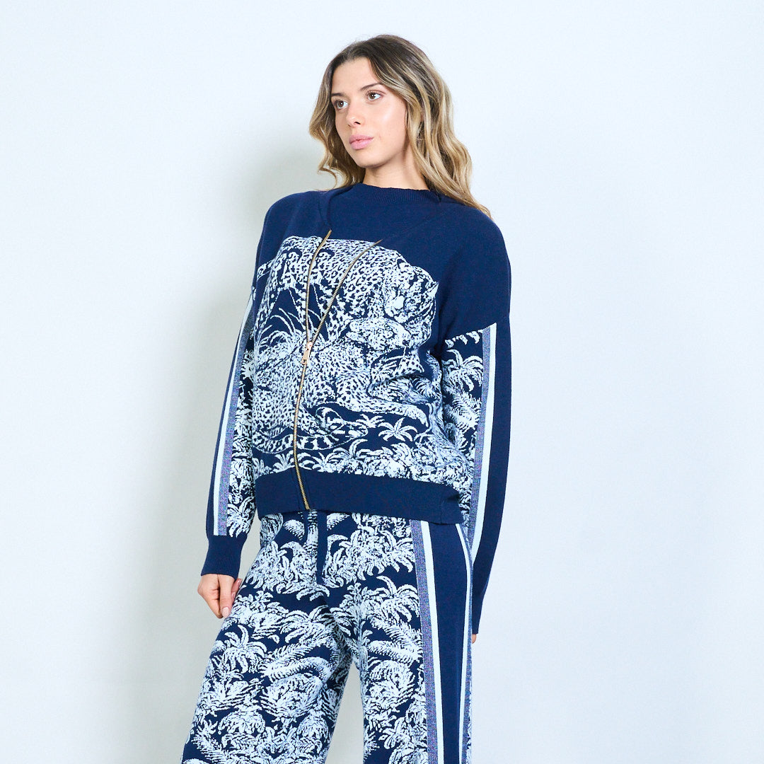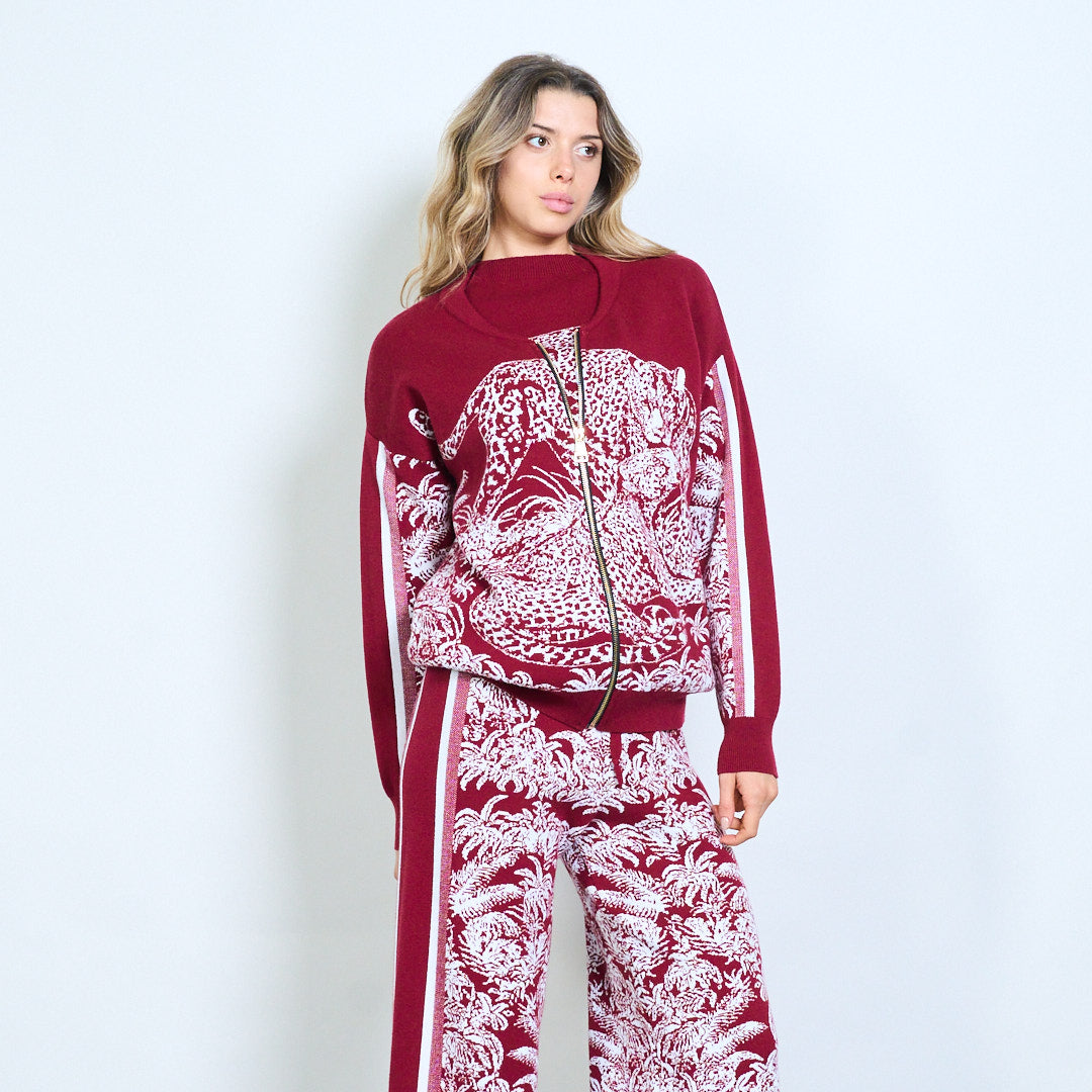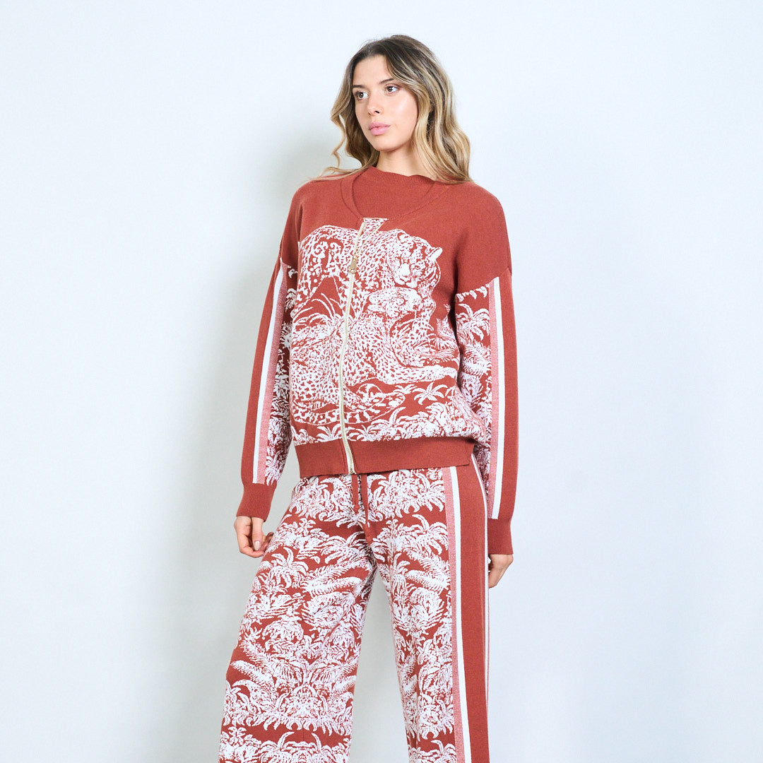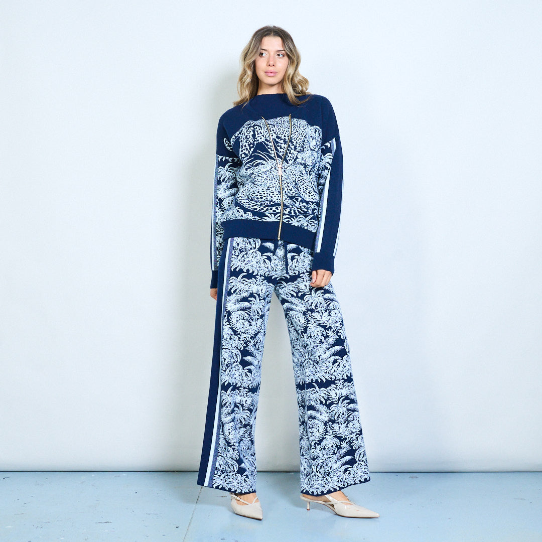 - Megztas megztinis, kuriame yra drąsus „Leopard Jungle“ grafikos dizainas