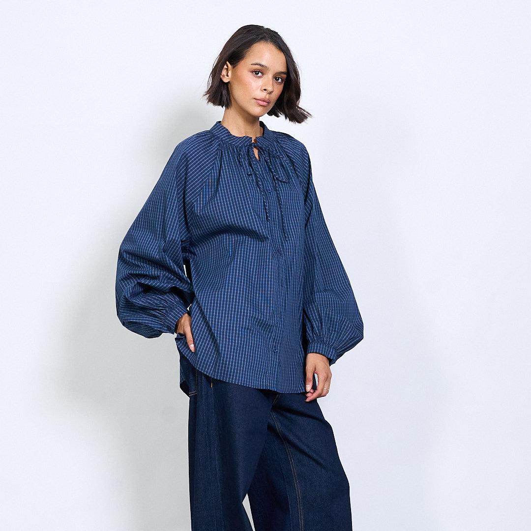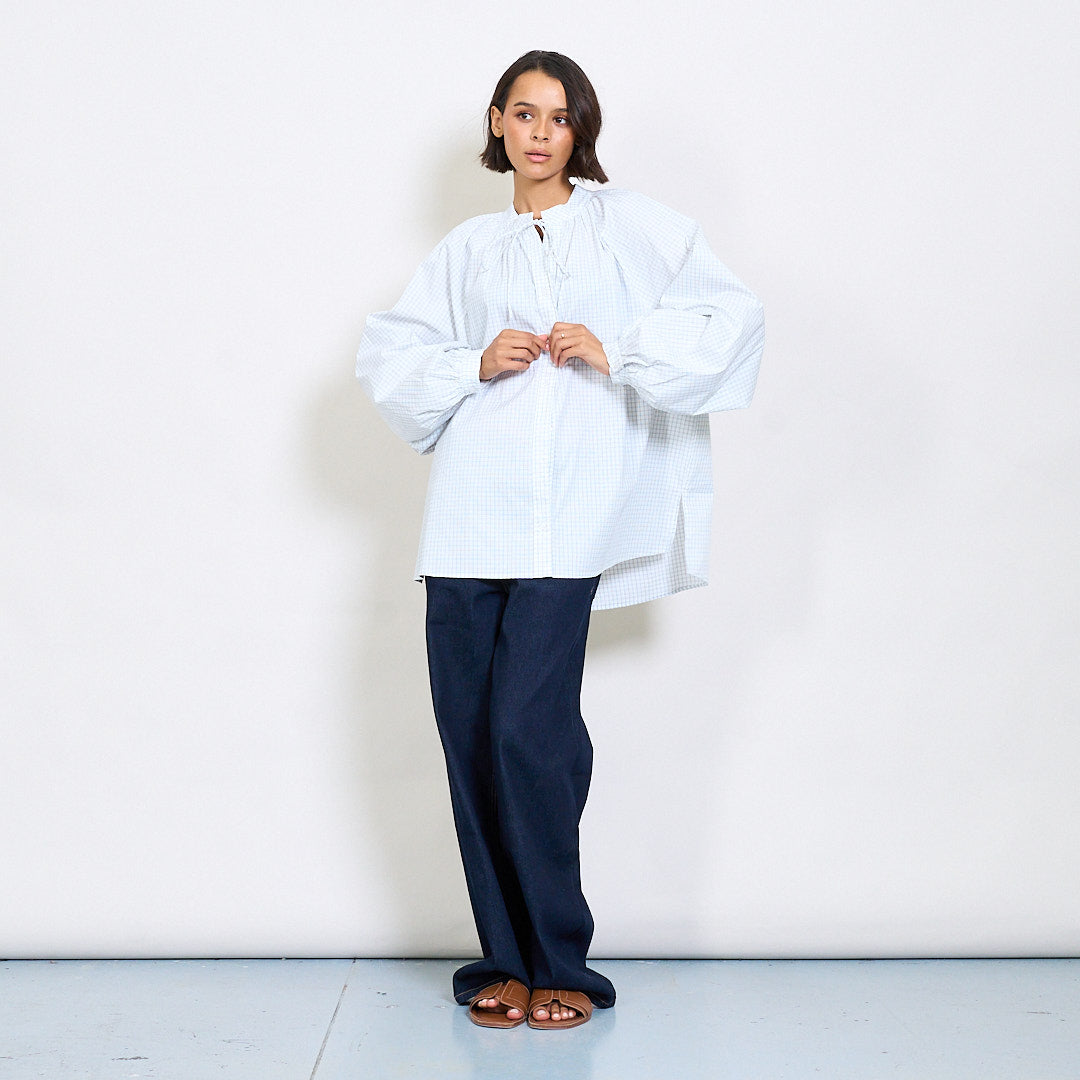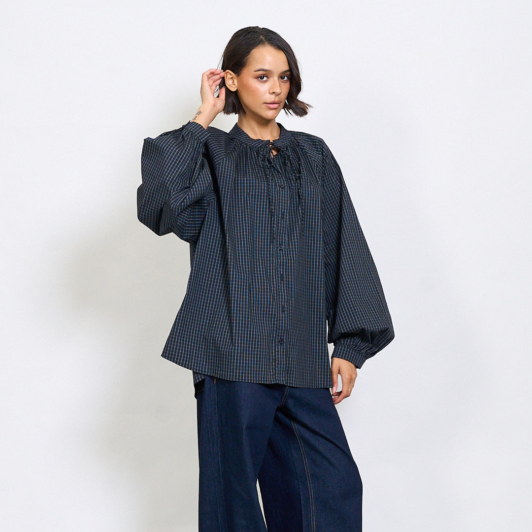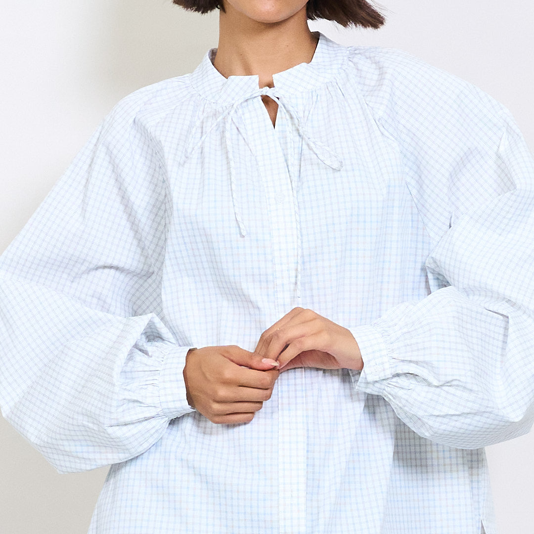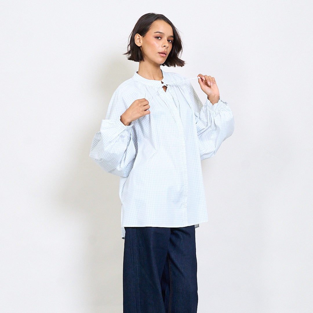Patikrinkite modelio palaidinę su surinkta iškirpte ir balionų rankovėmis didmeninė prekyba