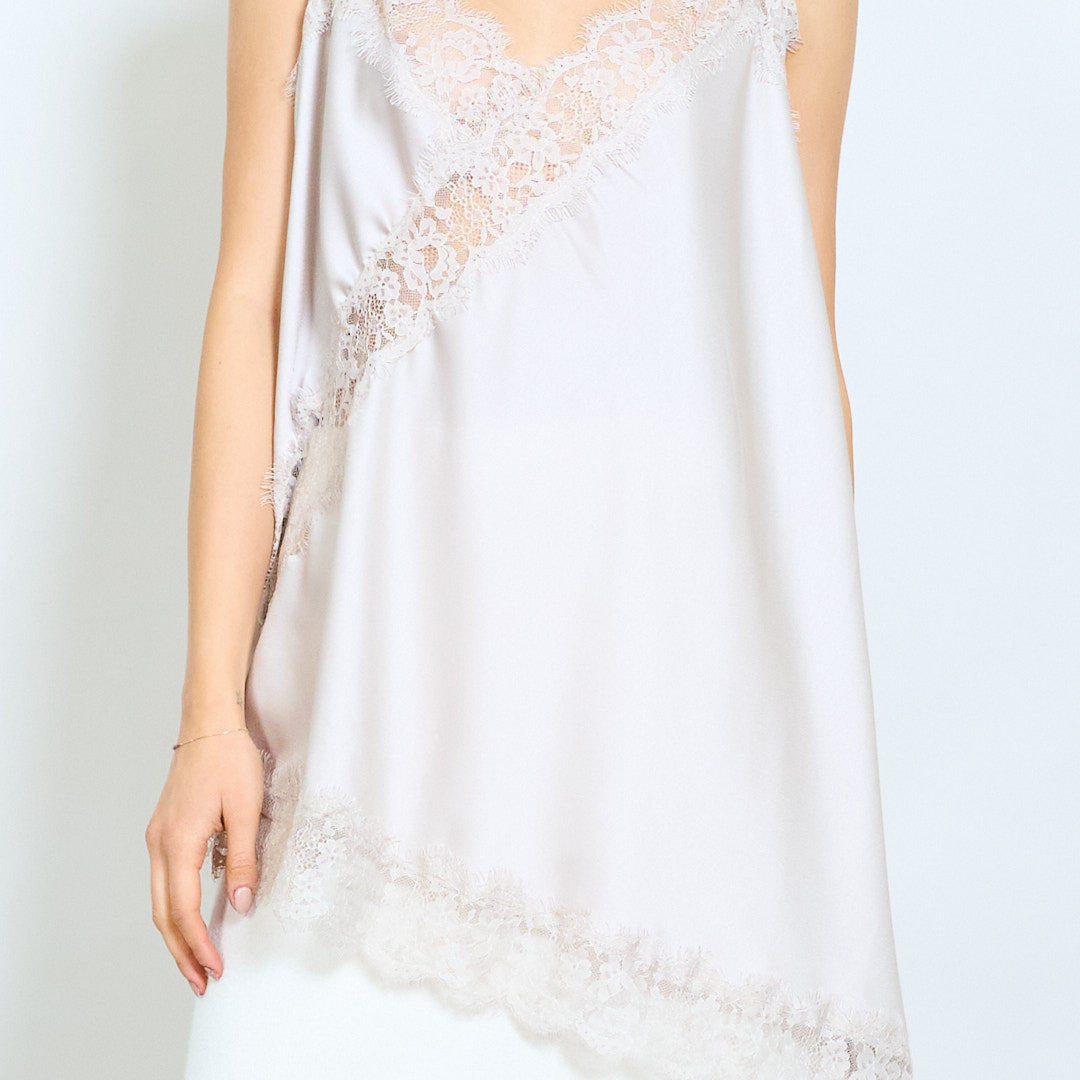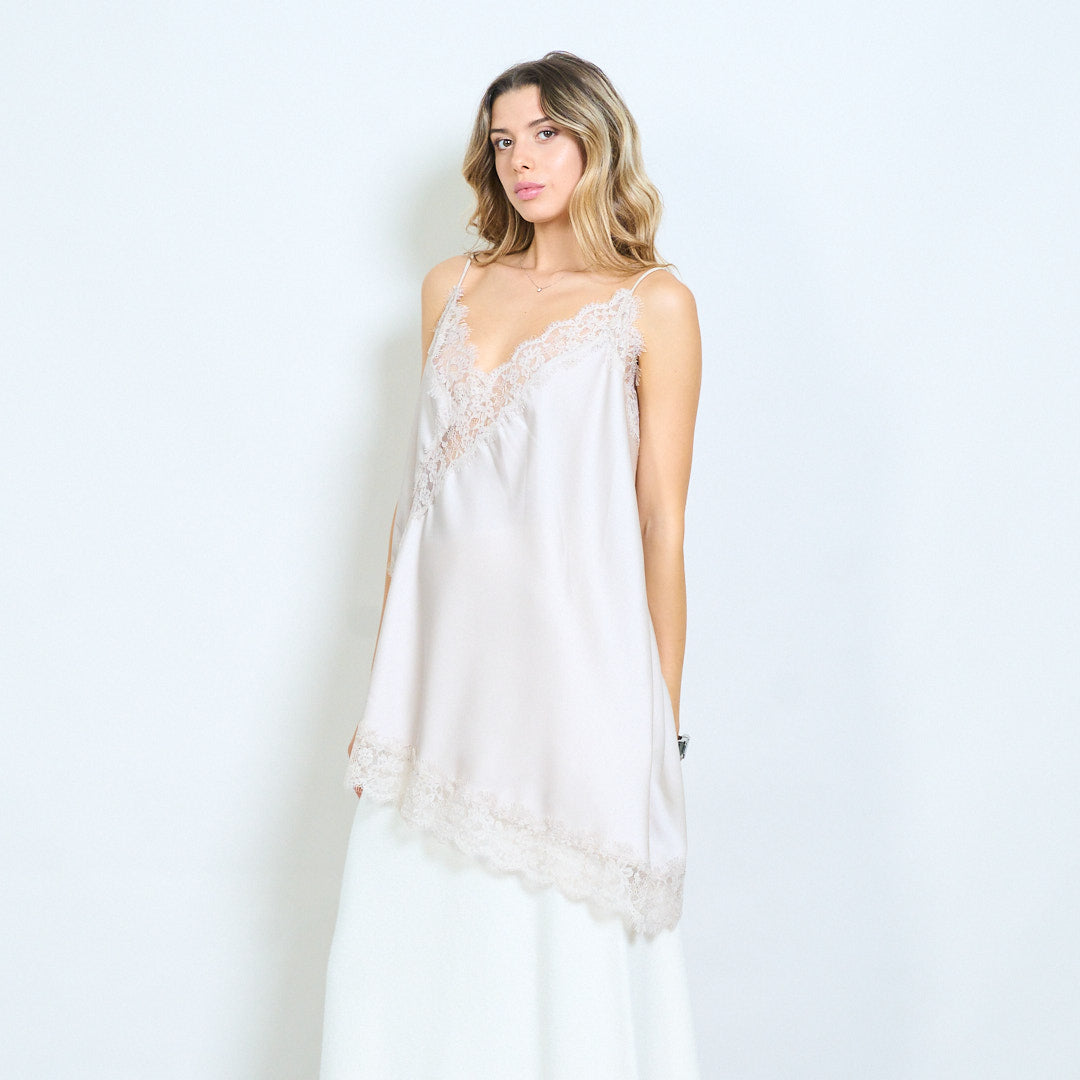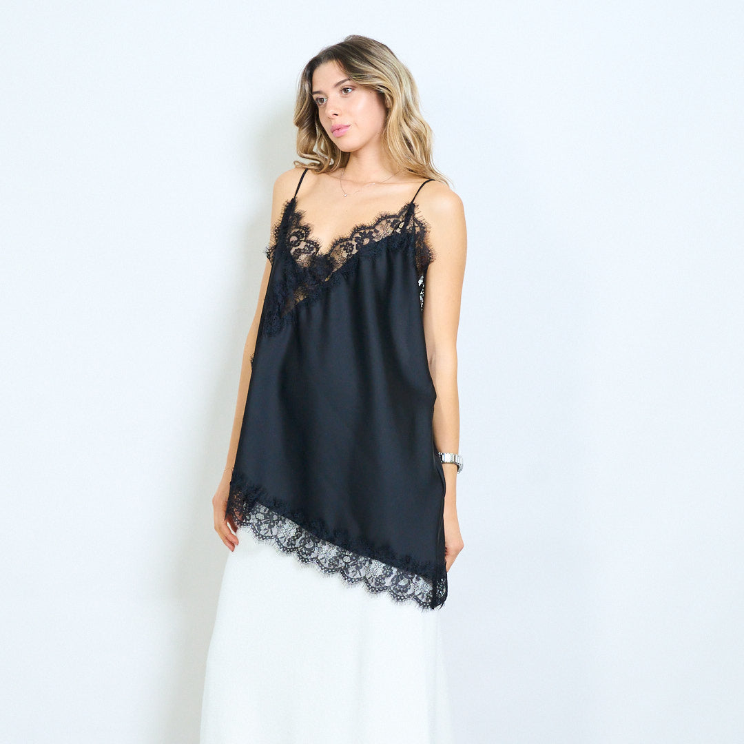 - Subtilus „Camisole“ dizainas su moteriškomis nėrinių apdaila ant iškirptės ir hem