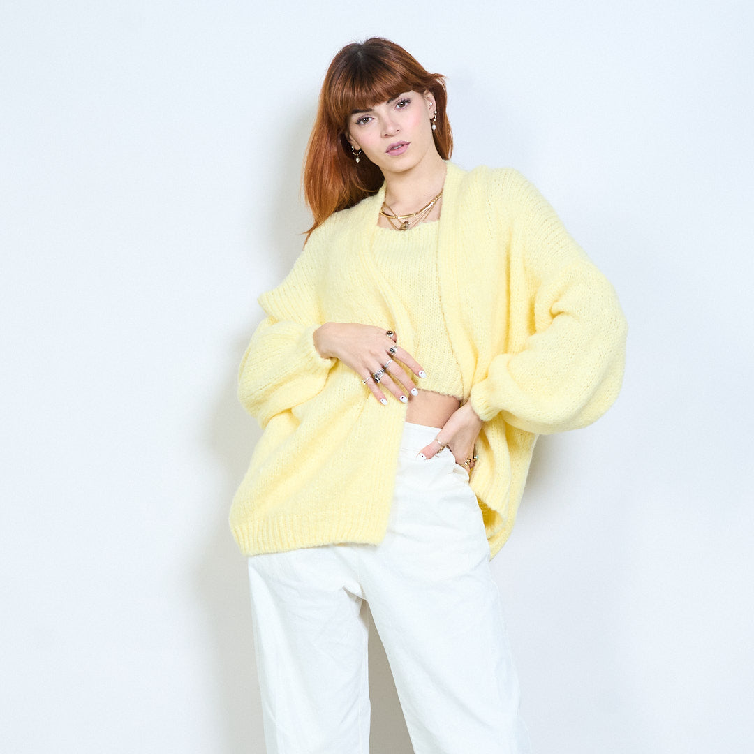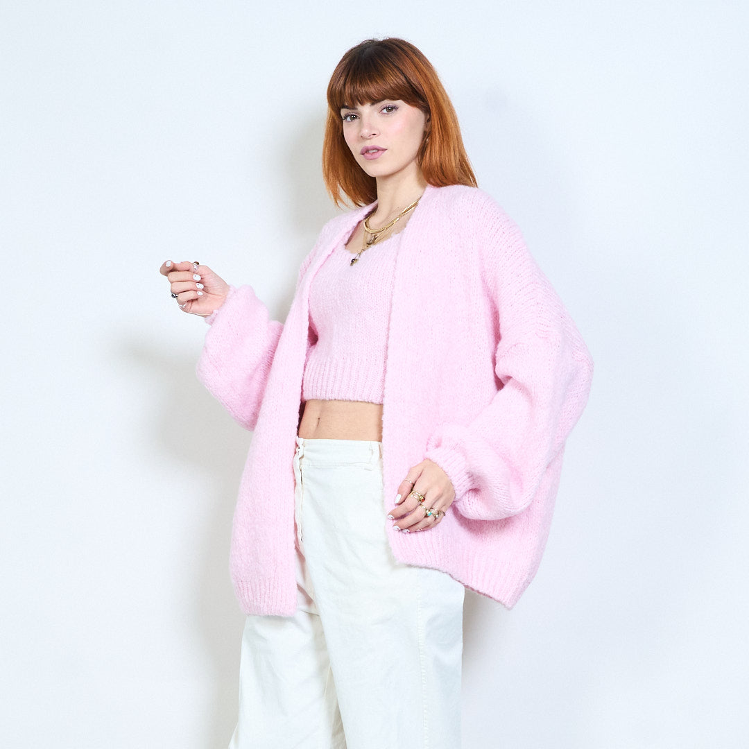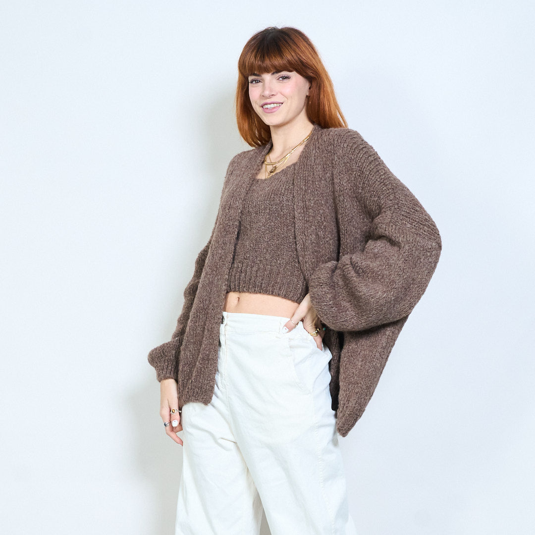 - Dviejų dalių mezgimo rinkinys su atviru priekiniu megztiniu ir atitinkamu apkarpytu viršumi