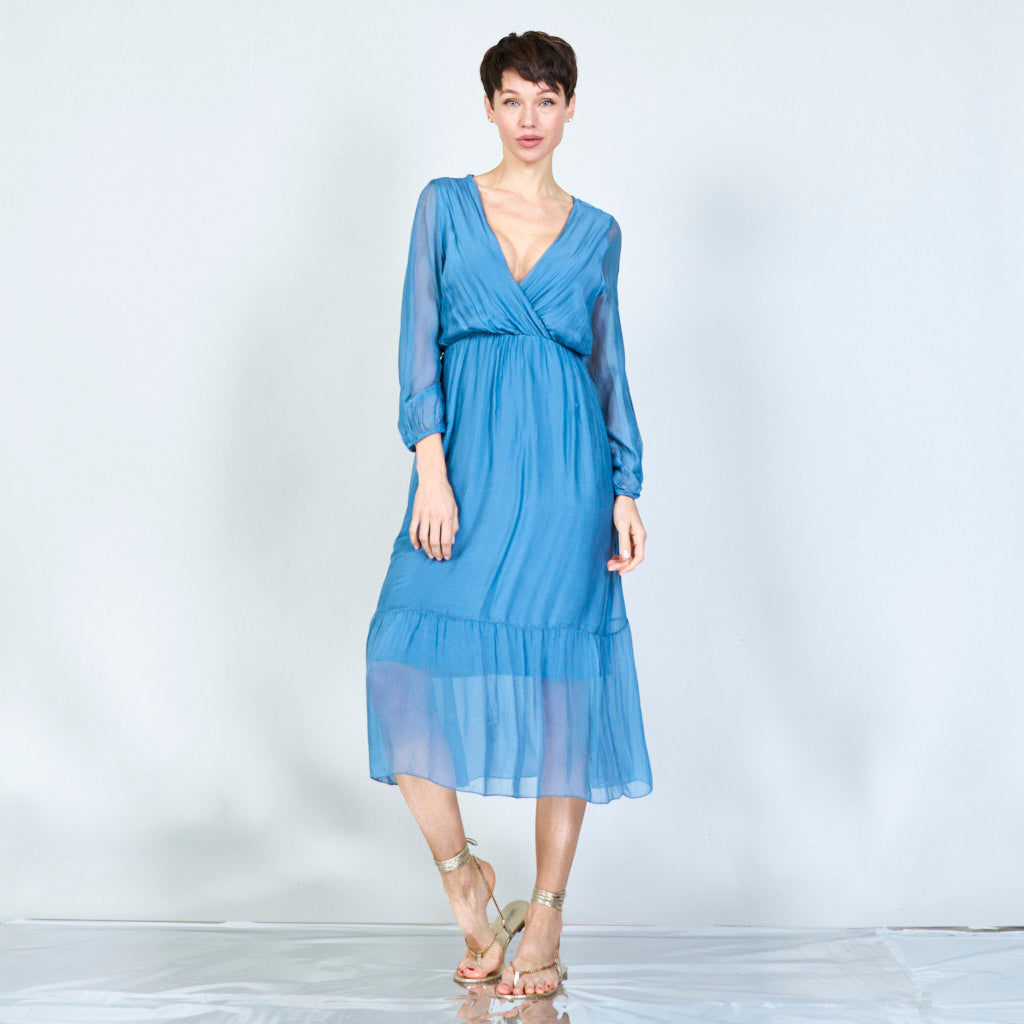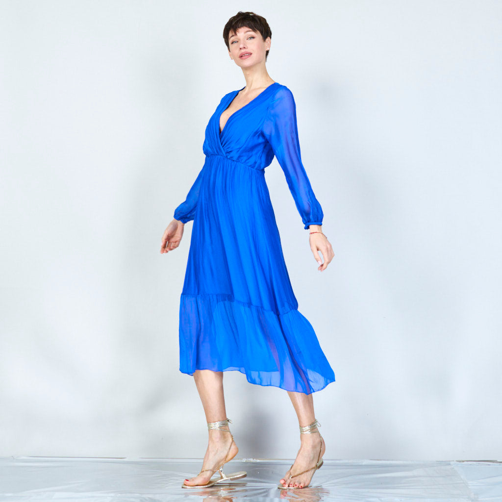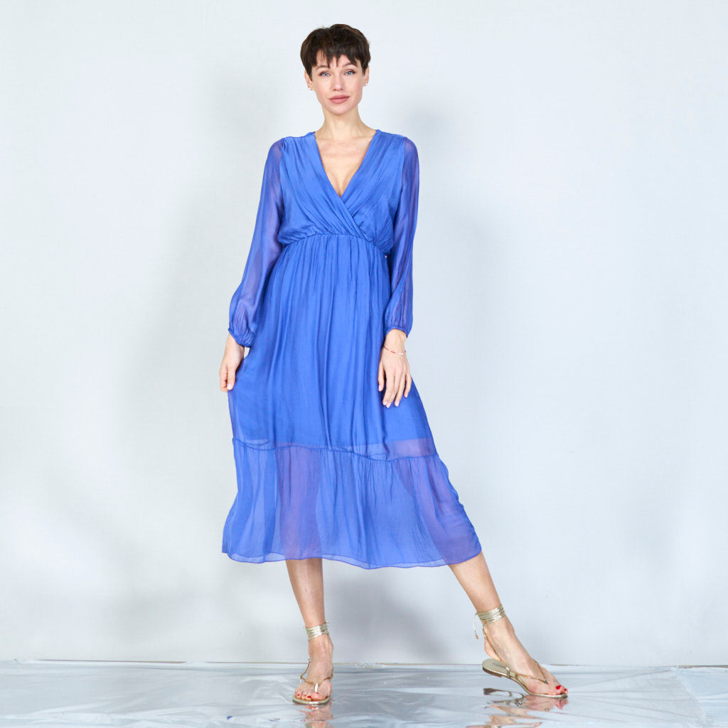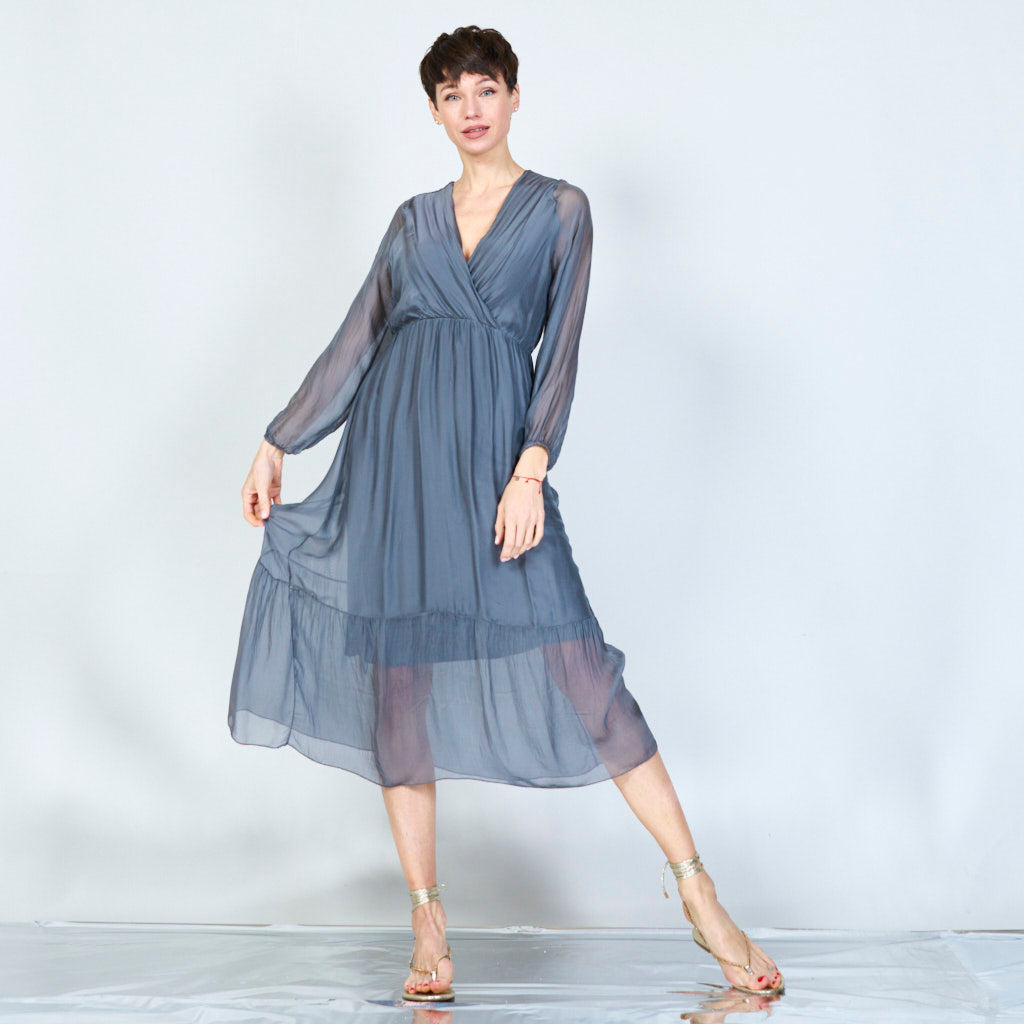 Ilgas kryžminis V formos kaklo šilko šifono suknelė didmeninė prekyba