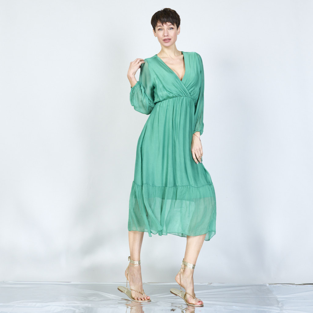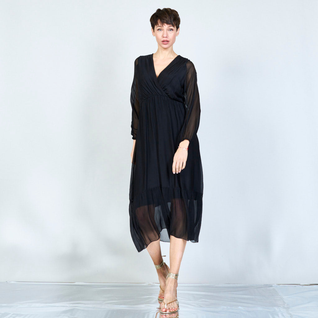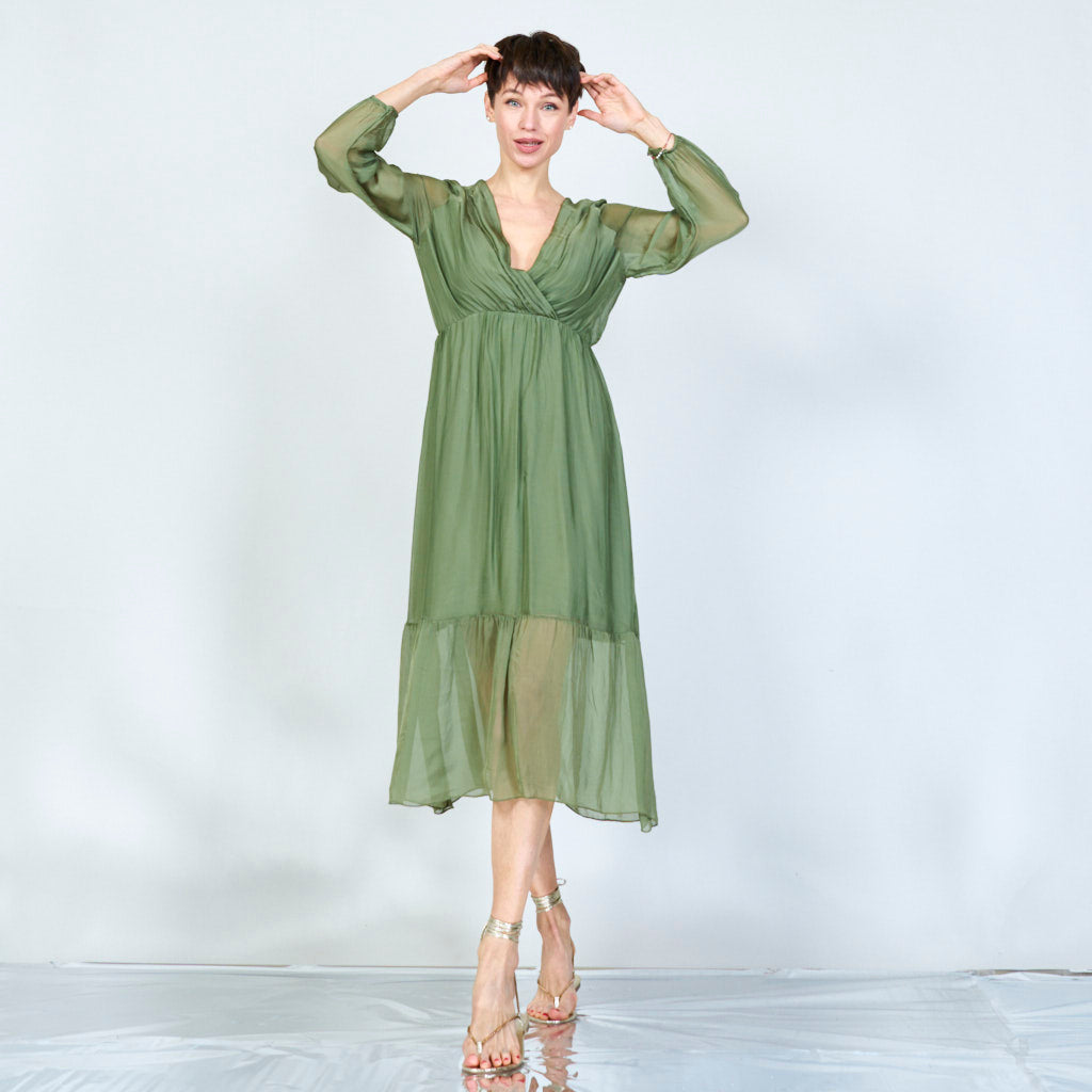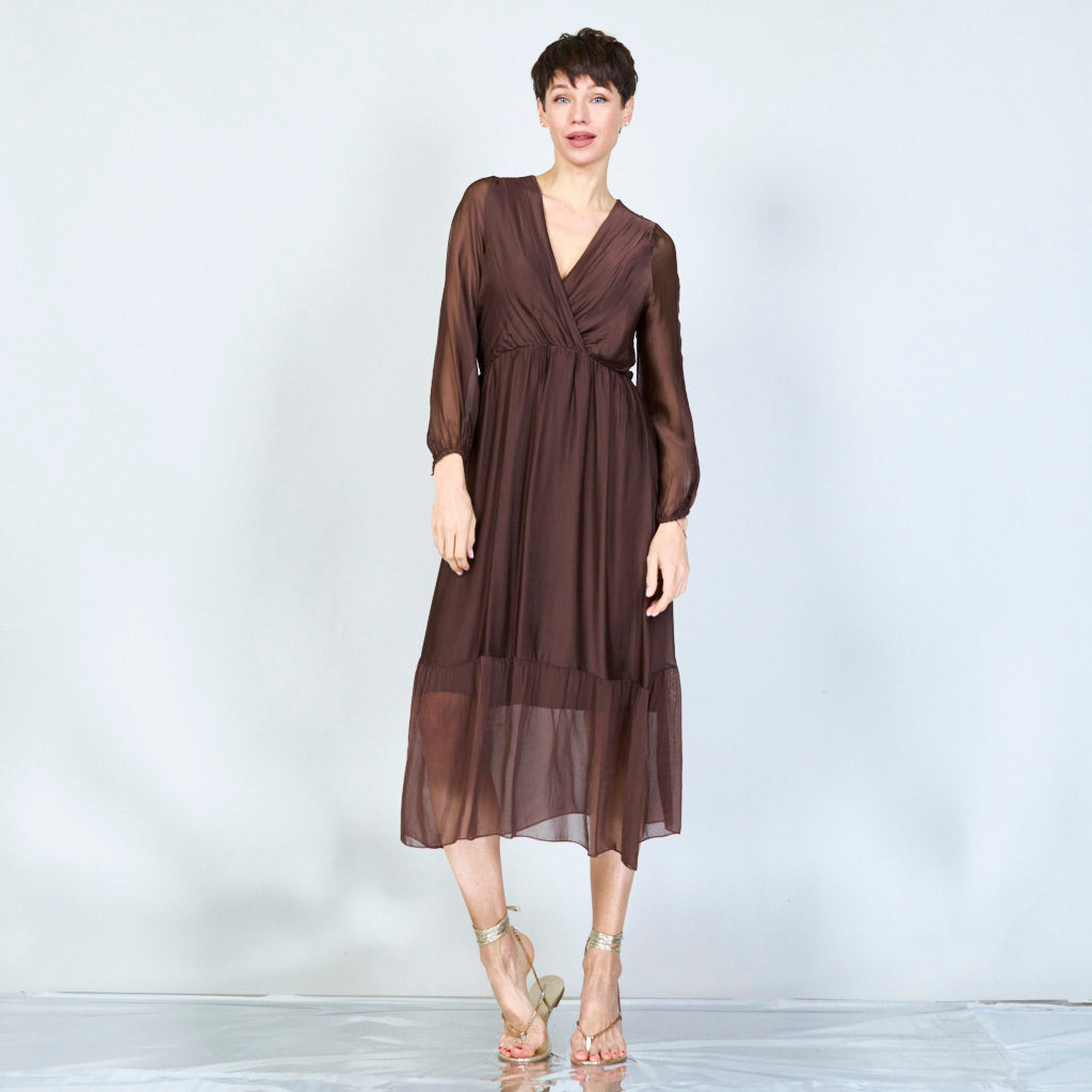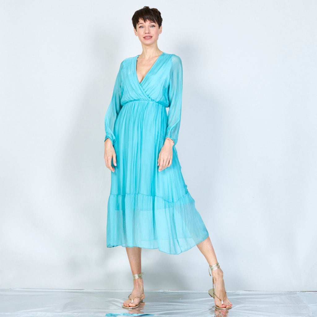 Ilgas kryžminis V formos kaklo šilko šifono suknelė didmeninė prekyba