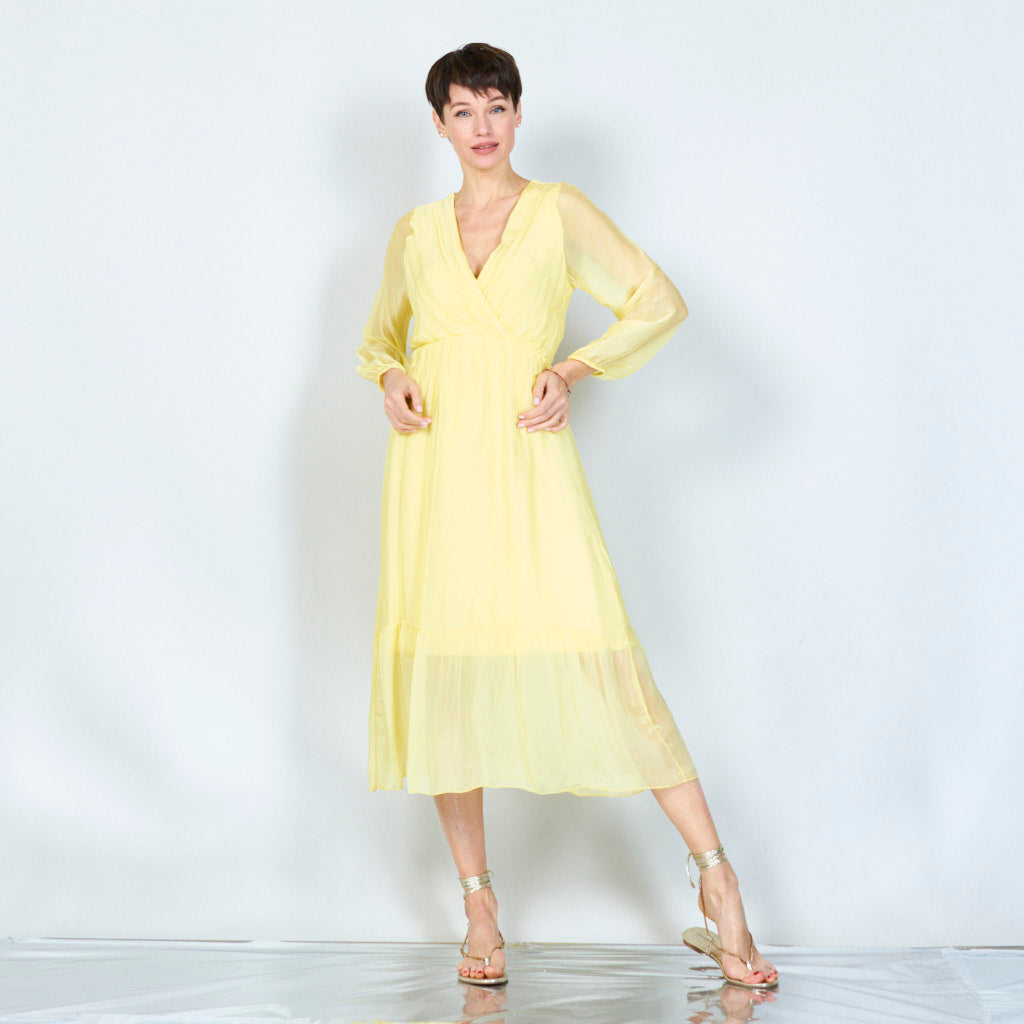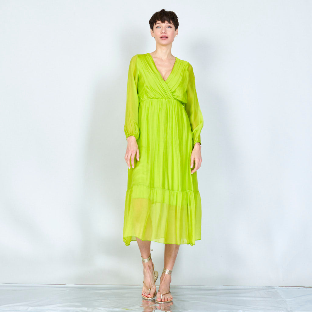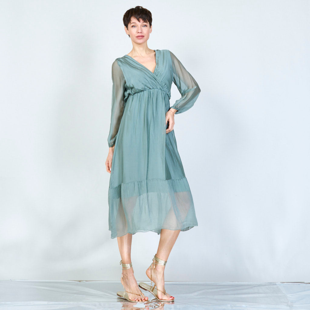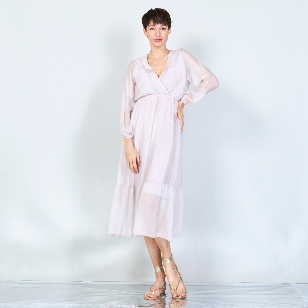 Ilgas kryžminis V formos kaklo šilko šifono suknelė didmeninė prekyba