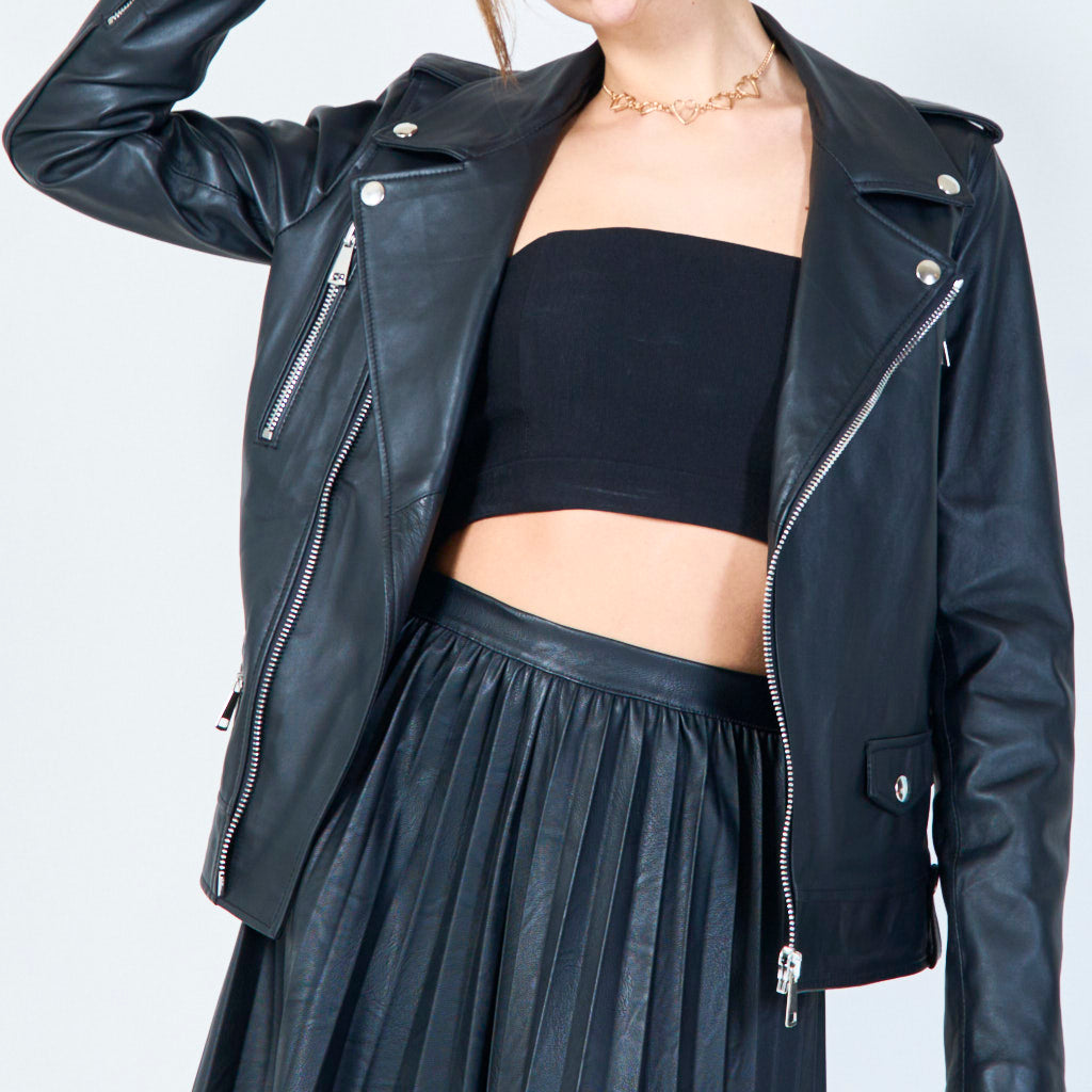 Klasikinė odinė baikerio striukė su sidabro akcentais didmenine prekyba