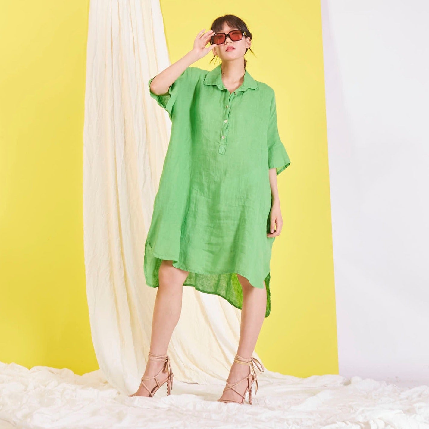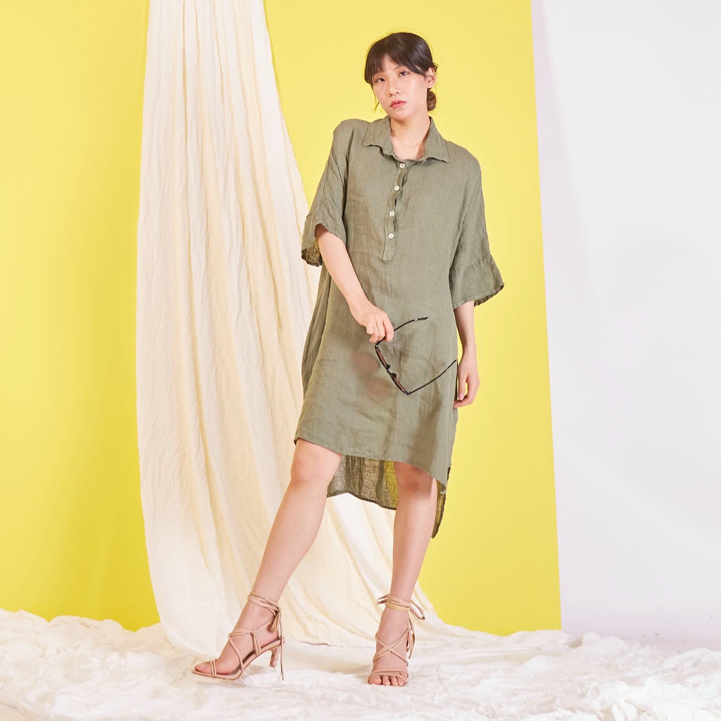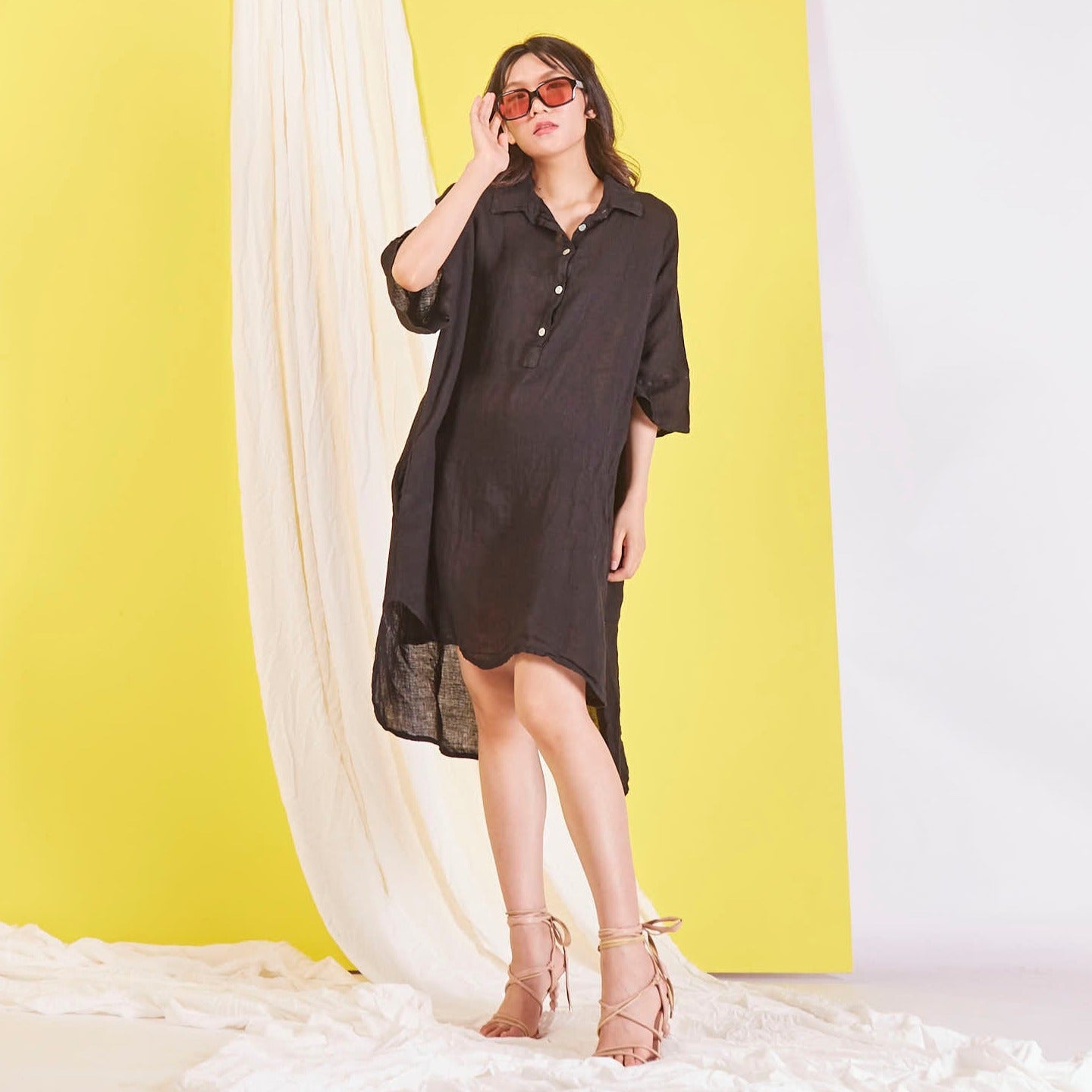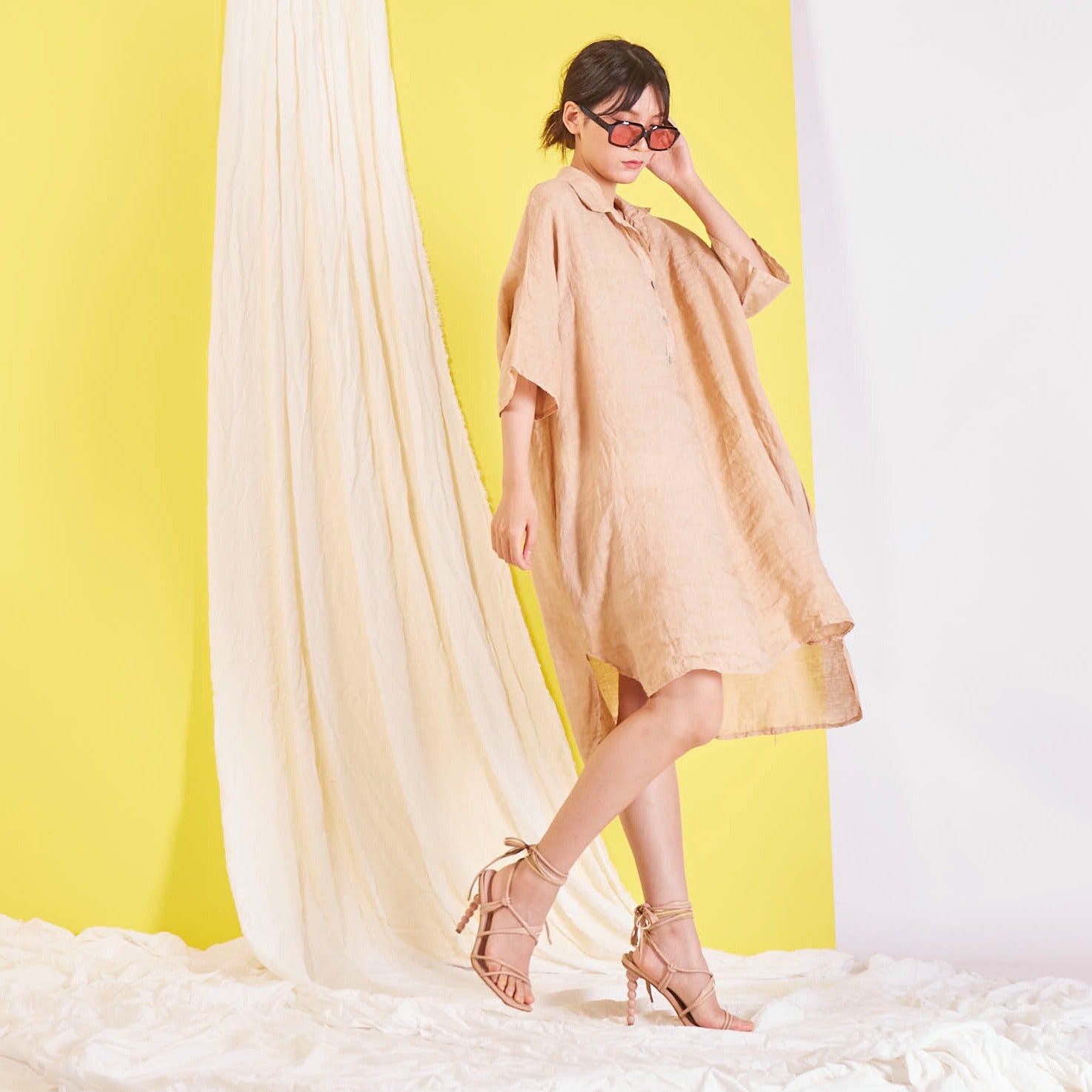 Didmeninė „Maxi“ lininė suknelė su marškinių apykakle