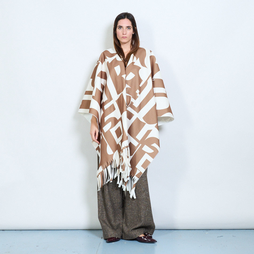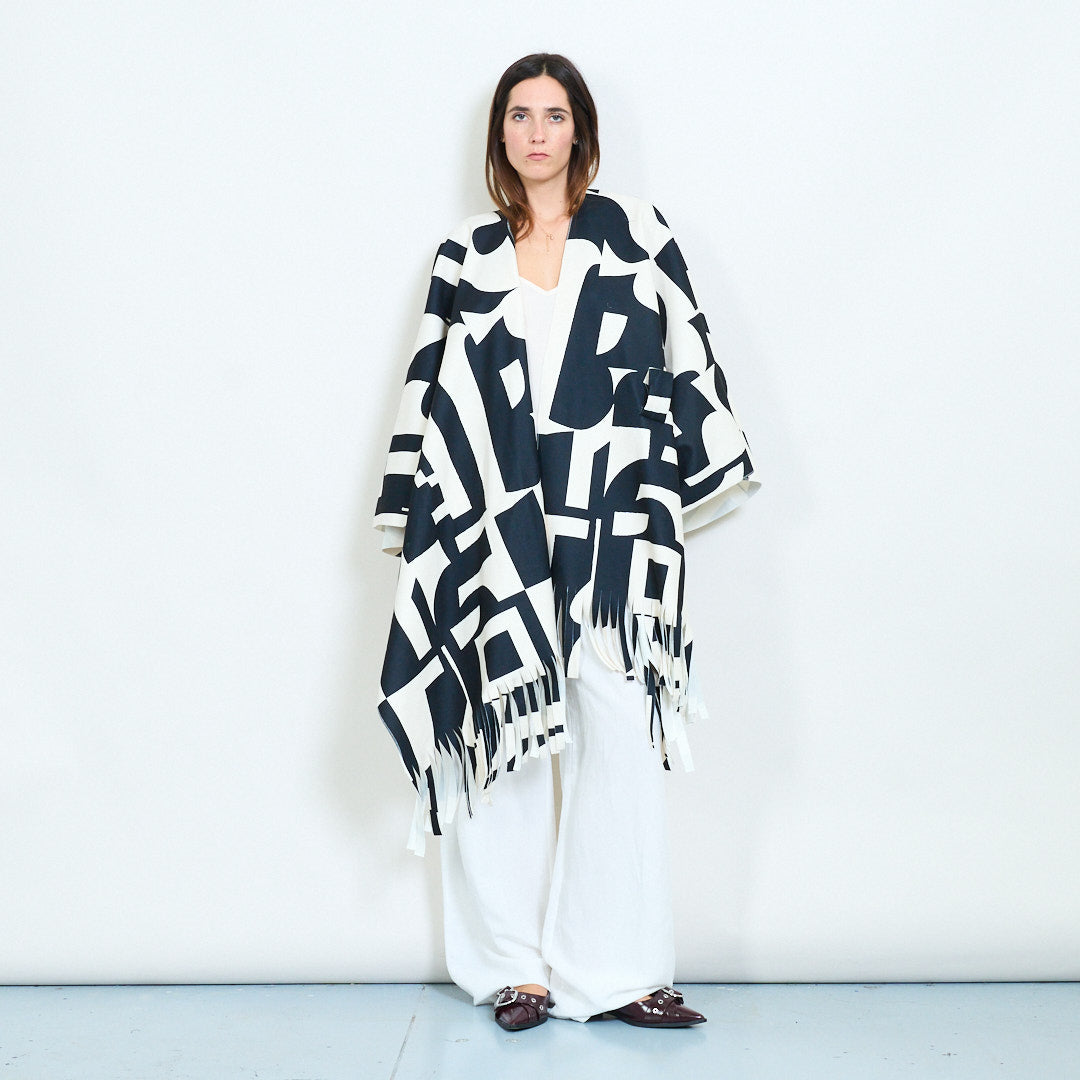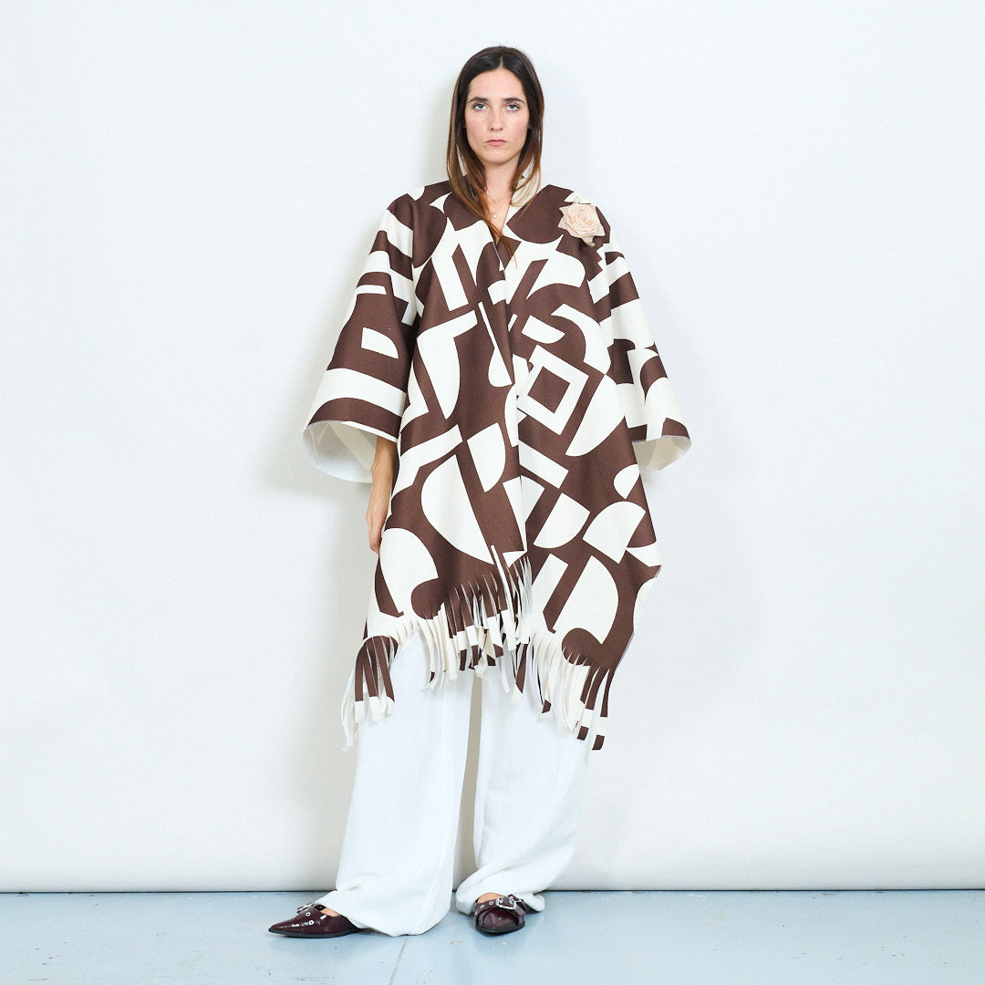 - Pareiškimas „Poncho“ su dideliu geometriniu atspaudu, kad būtų paryškintas vaizdas