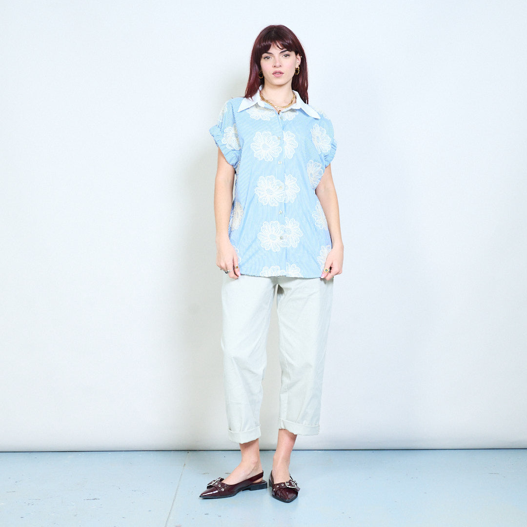 Dryžuota gėlėmis siuvinėta pūstų rankovių palaidinė su mygtuku priekyje didmeninė prekyba