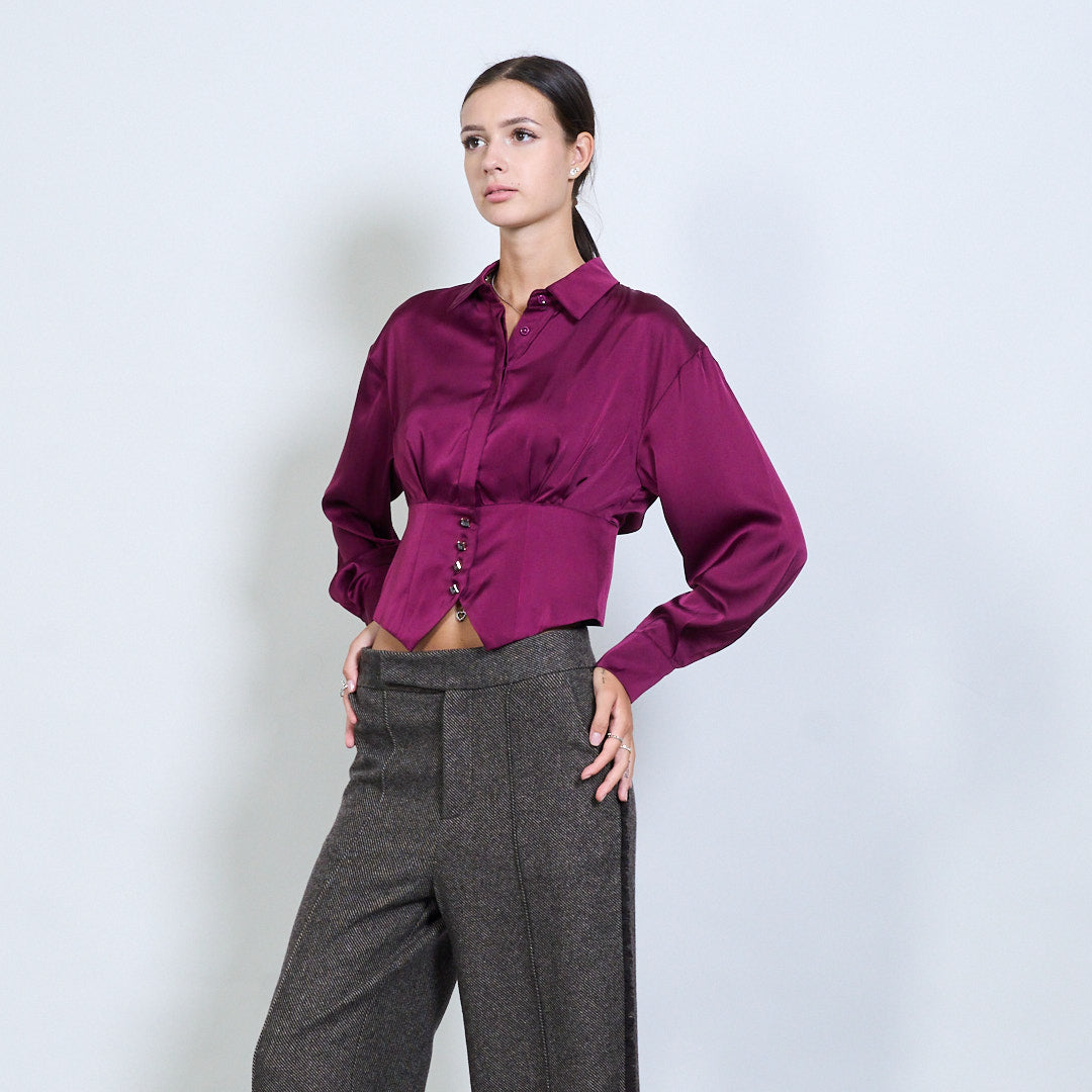 Įrengti satino marškinėliai su asimetrišku hem ir aukso mygtuko detale didmenine prekyba