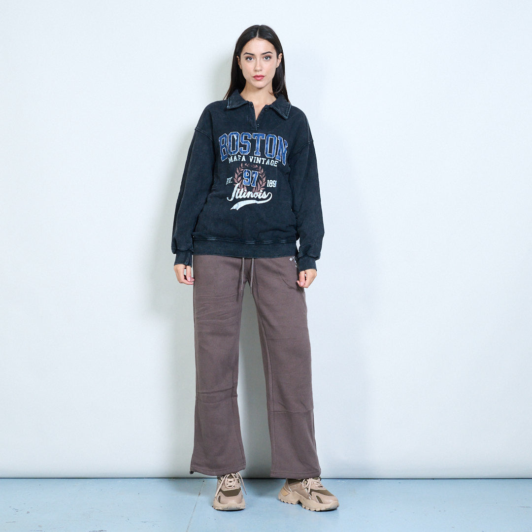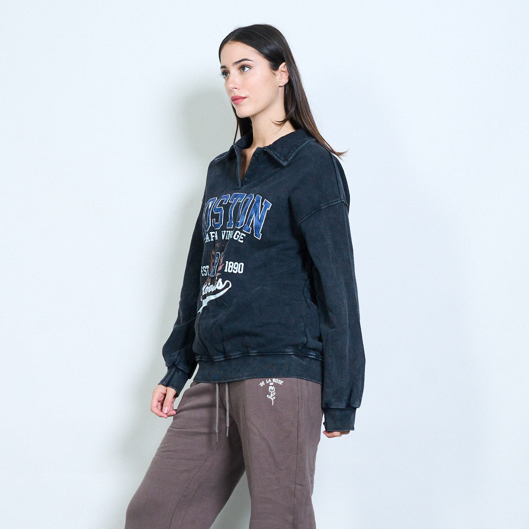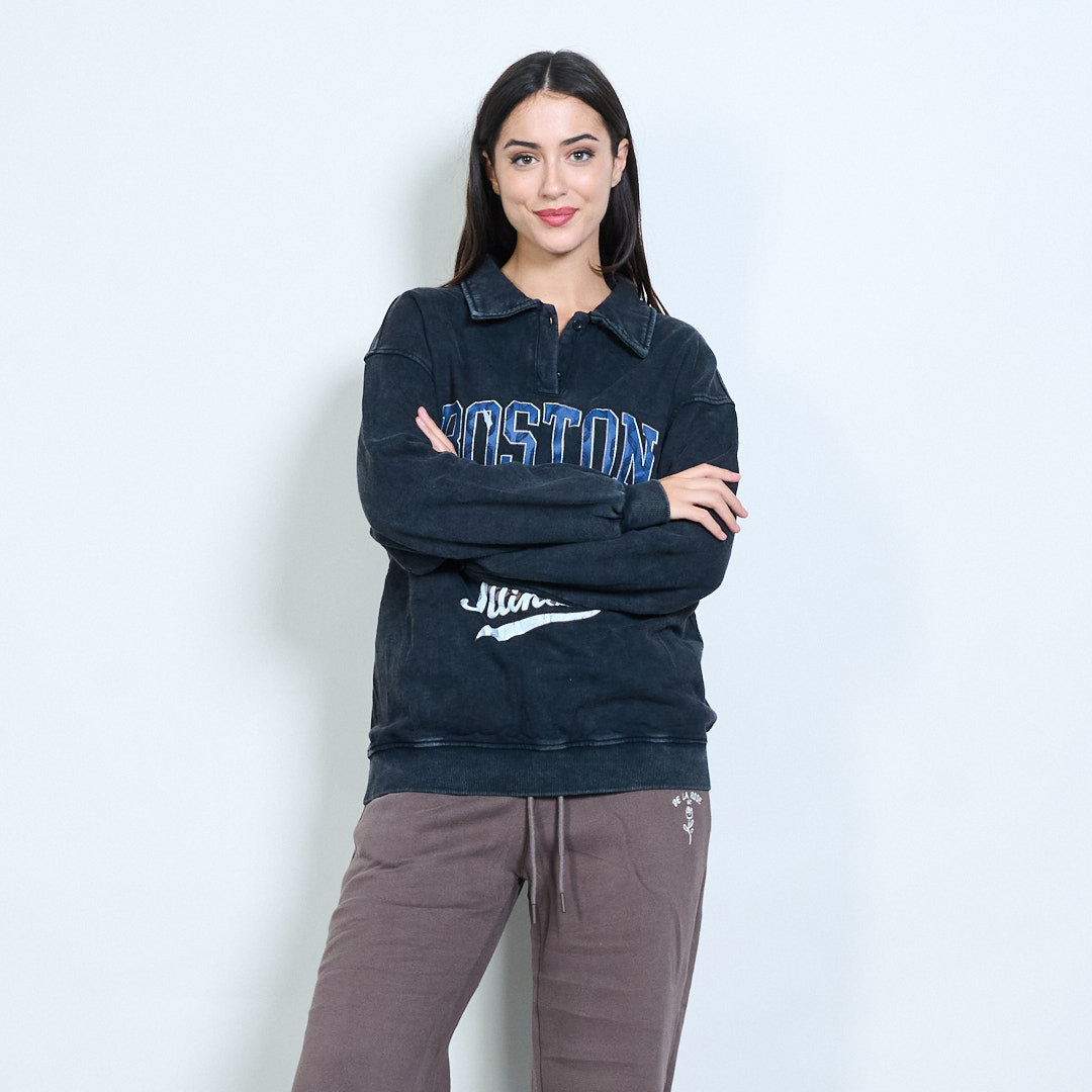- Su paryškintu „Boston“ išsiuvinėtu tekstu, kuris suteikia kolegiško stiliaus įvaizdį
